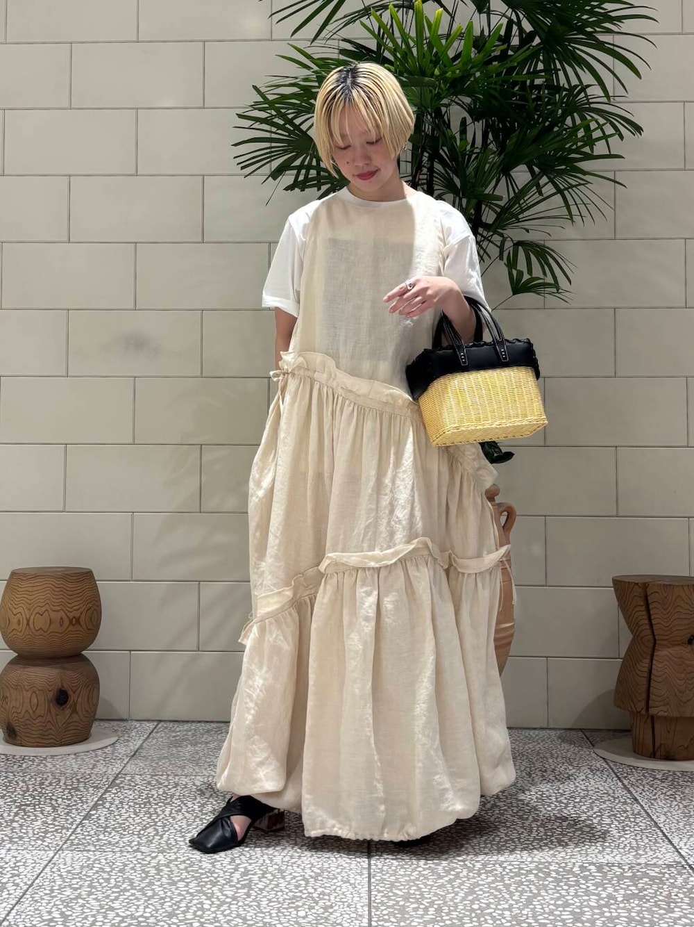 今回着用したベージュは透け感があり、ワンピースとして着用するにはペチコートやパンツを合わせていただくと安心です。
