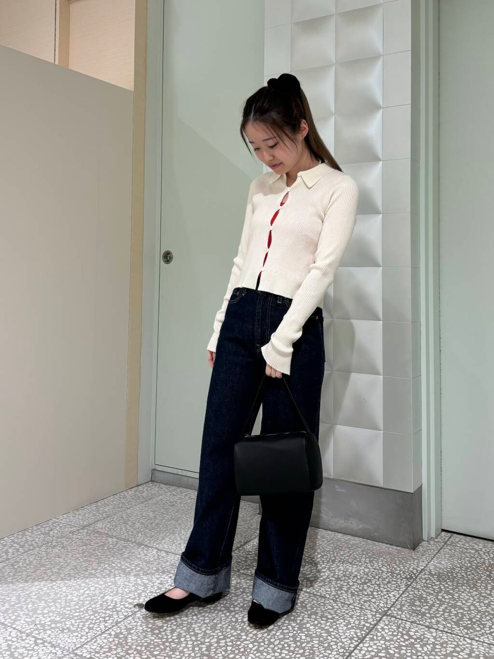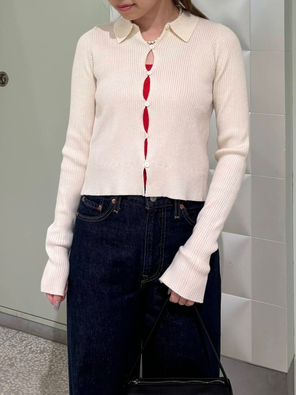 ボタンとボタンの間が開くデザインなので、カラーのインナーを合わせていただくと差し色になります。
