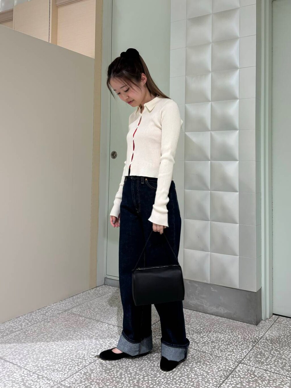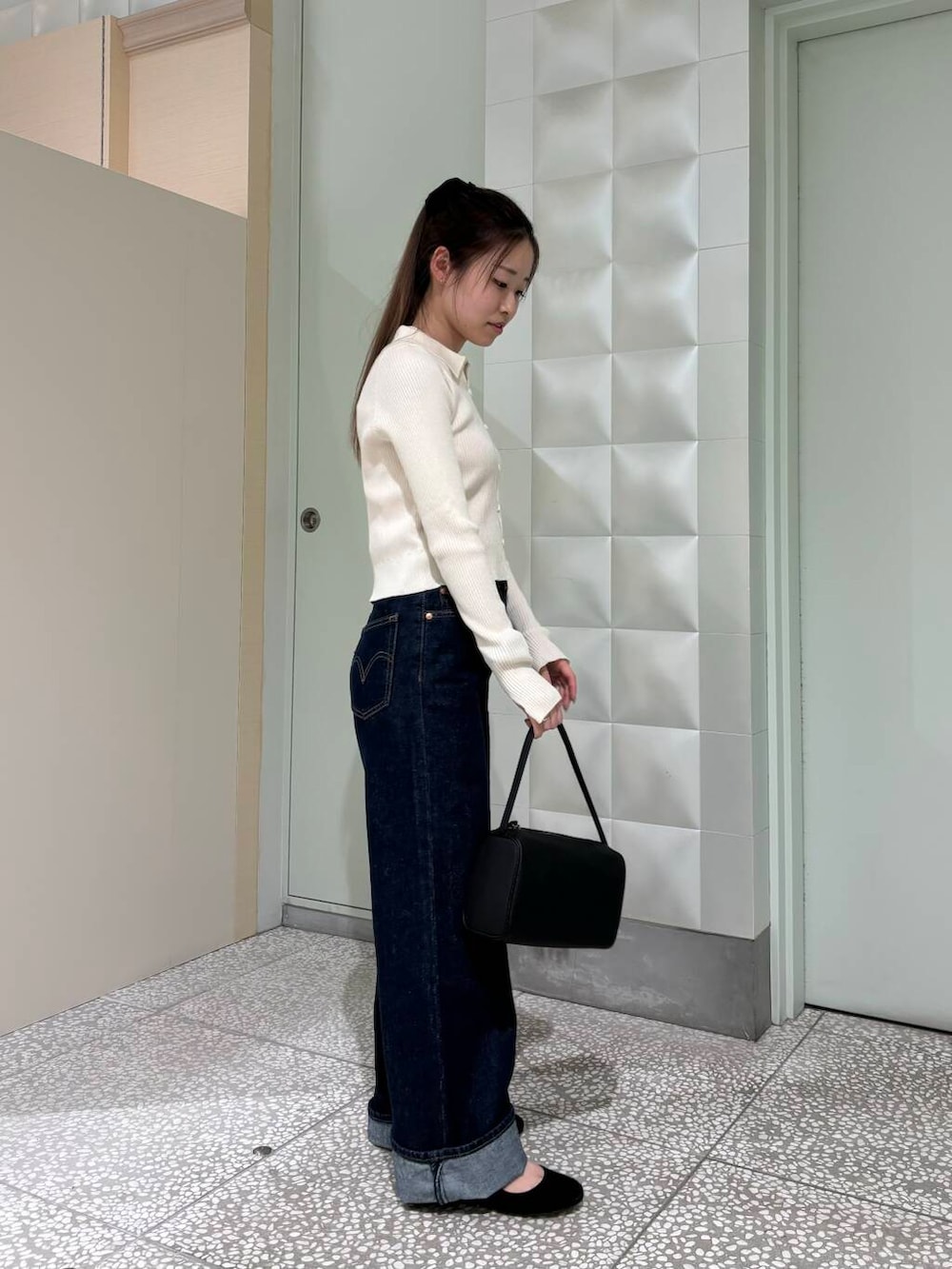 155センチで丈感長いので、写真のように丈を折って履いていただく形になります。