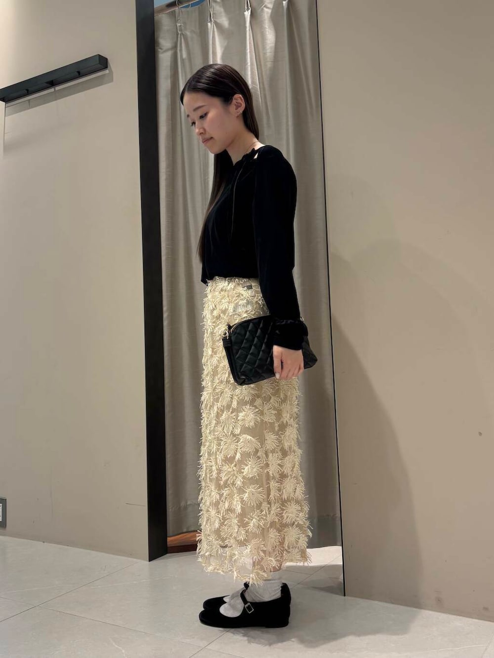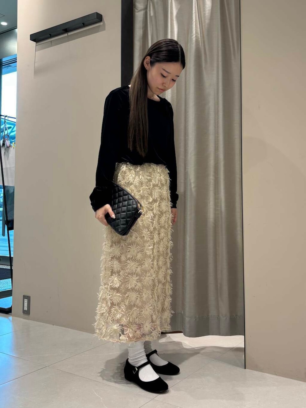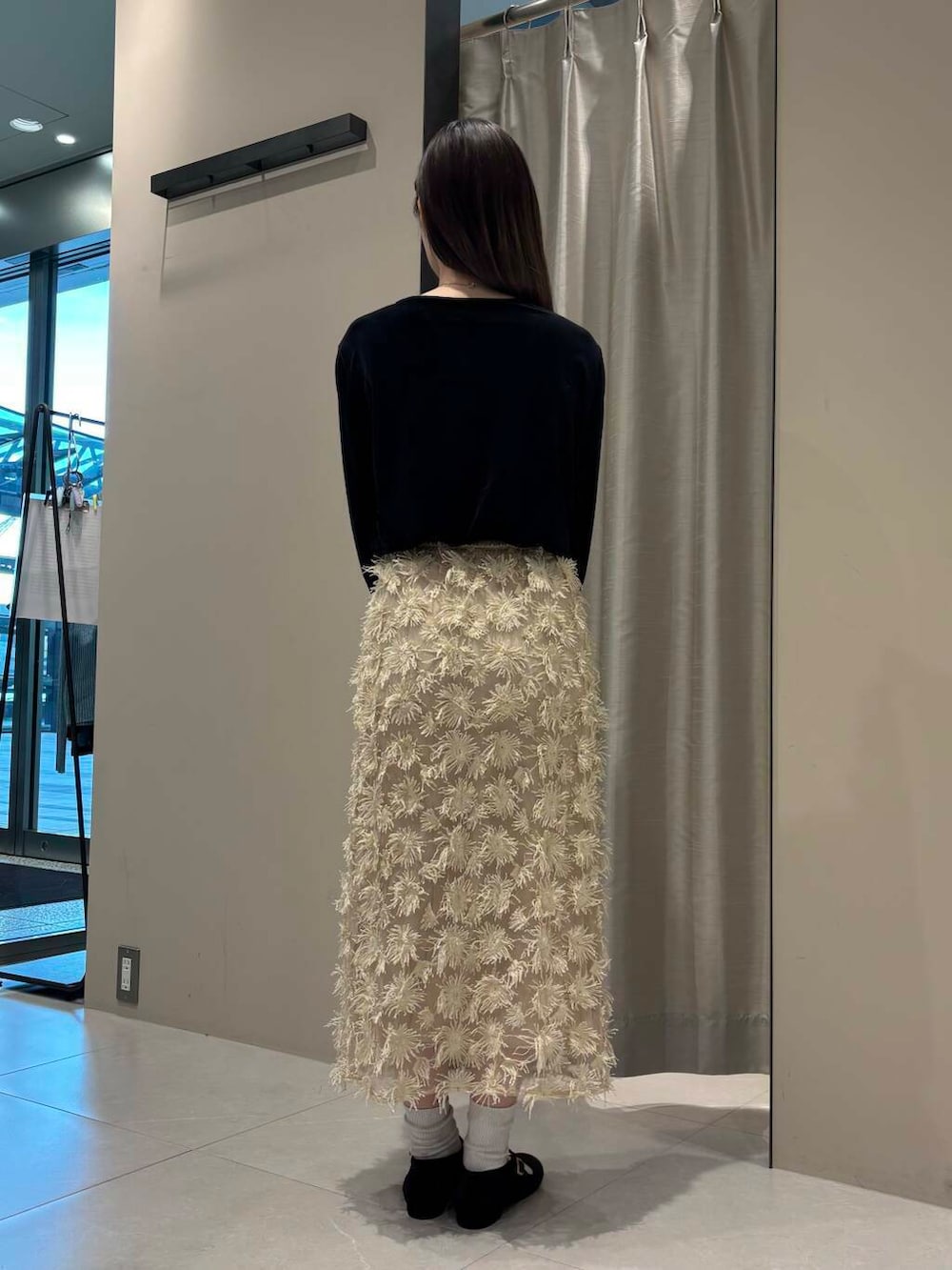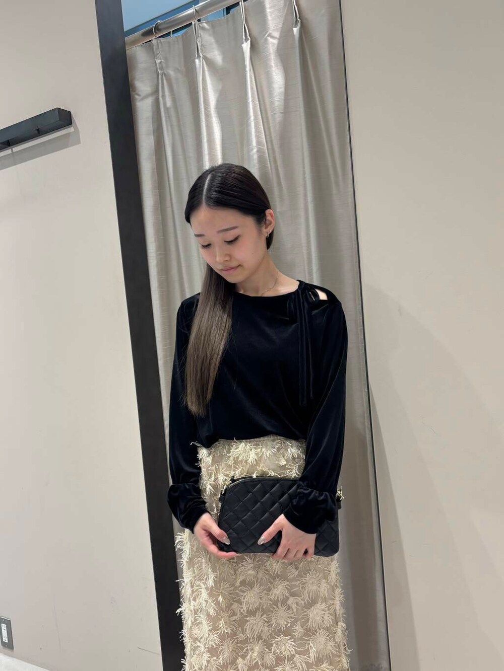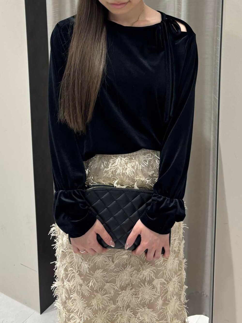 ベロア素材で左肩のスリットが重くなりすぎず抜け感があります。袖に控えめなギャザーがあるのもポイントです。若干シアー感のあるベロア生地です。(ROSSO/シアーベロアスリットデザインカットソー)