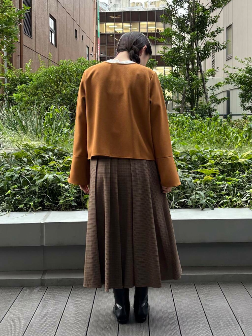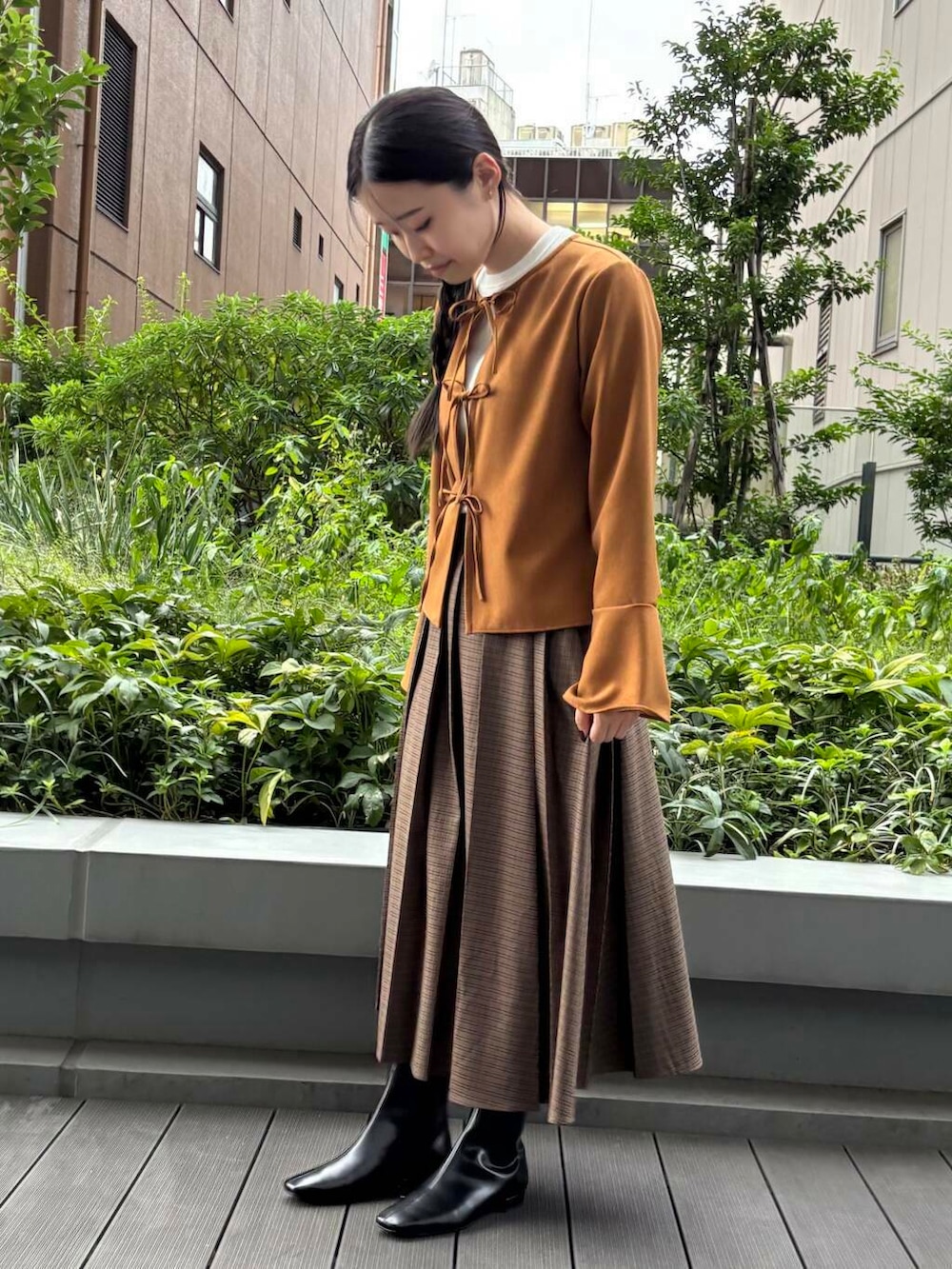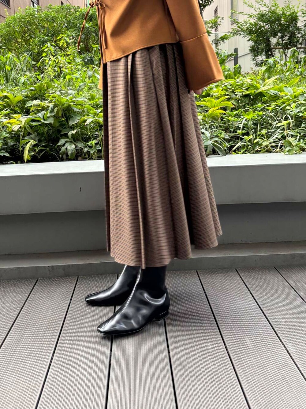 155センチで丈感足首より上くらいです。ランダムに入ったプリーツに遊びがありスタイリングのポイントになります。
