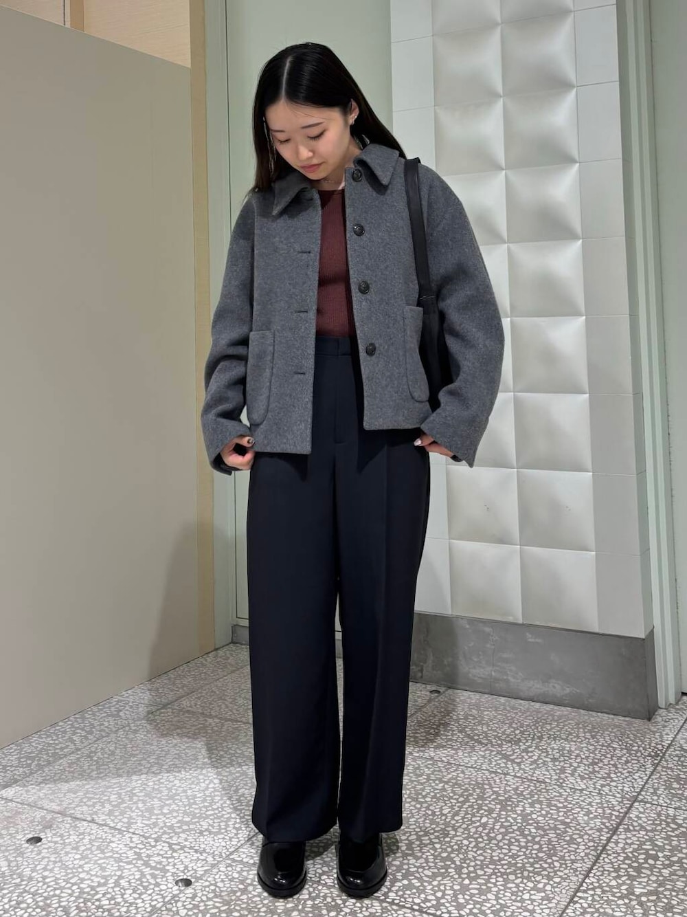 ショート丈のシンプルなコートです。オーバーなサイズ感で厚みのあるトップスと合わせてもかさばらないのでさまざまなスタイリングに合わせていただけます。