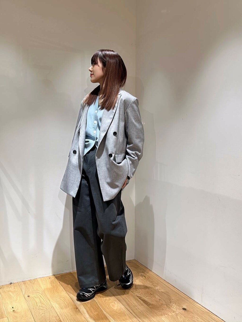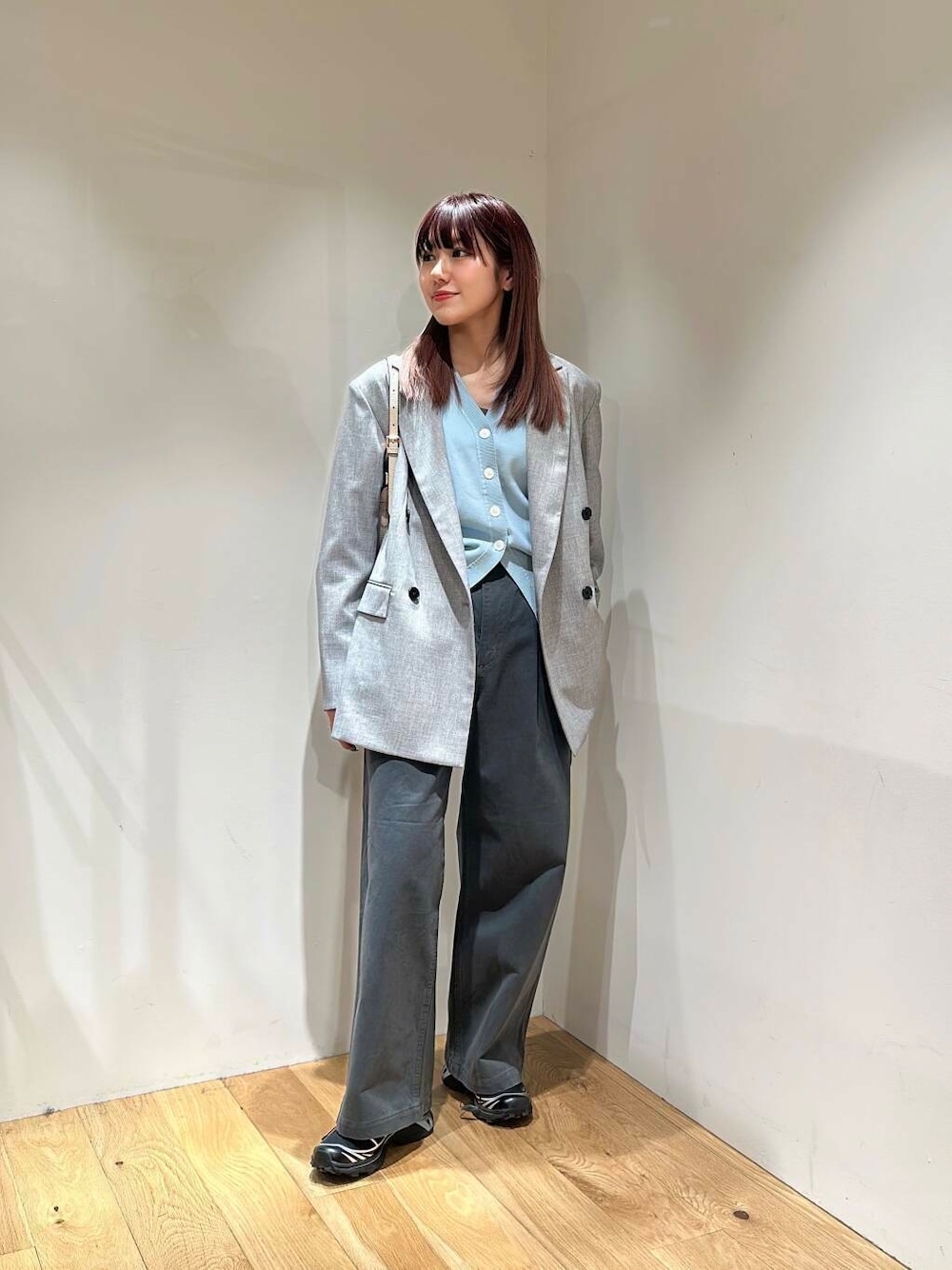 春らしいブルーのカーディガンをインナーに合わせました