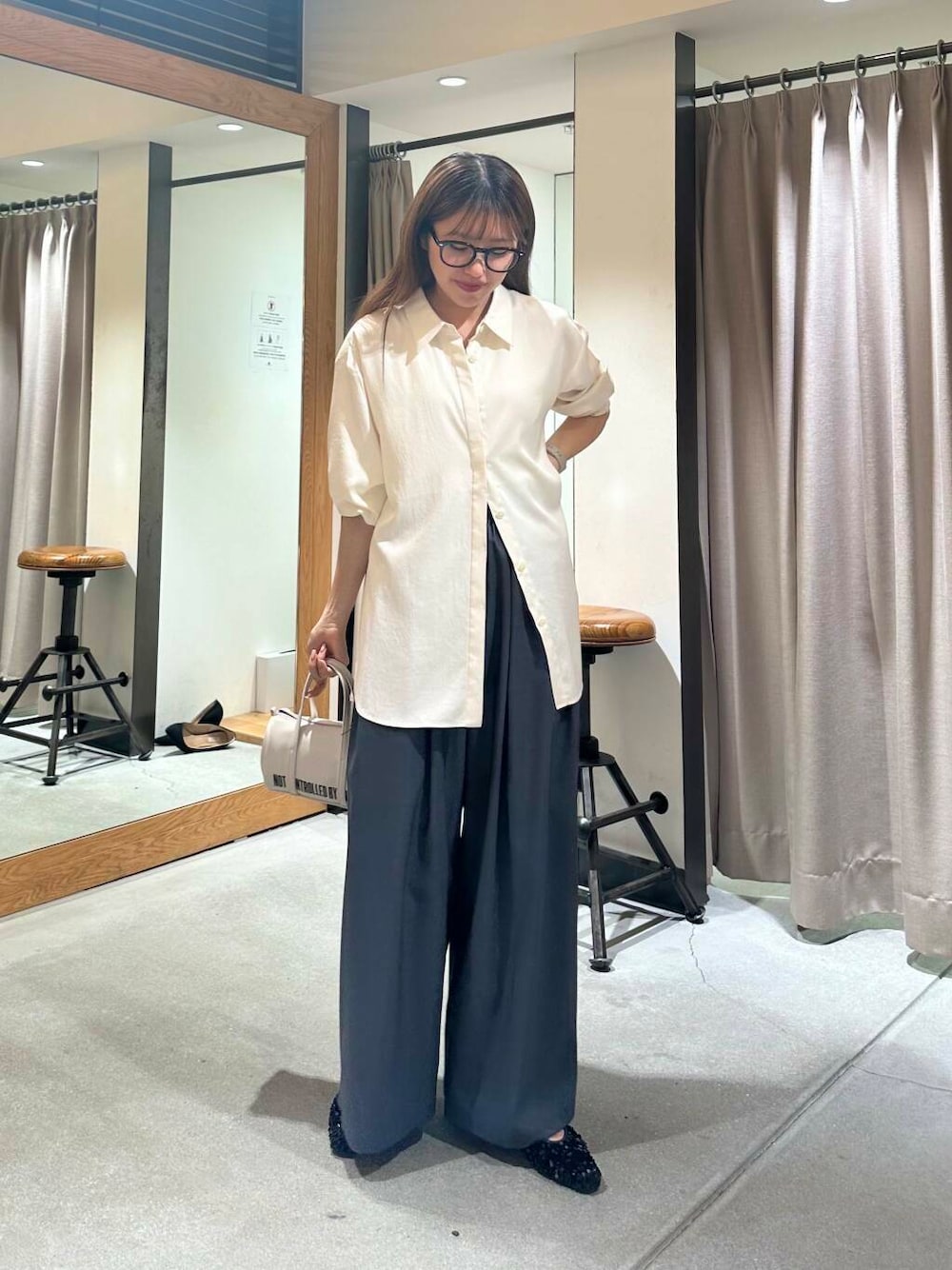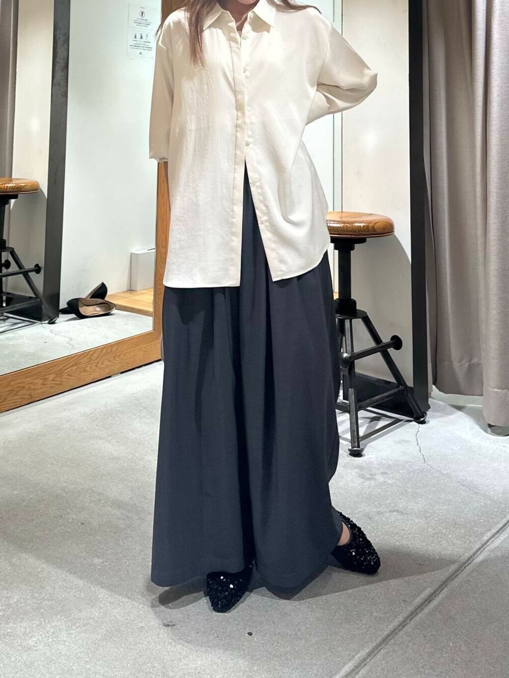 ワイドパンツに合わせるときはシャツのボタン下少し開けると重たく見えすぎないのでおすすめです!
