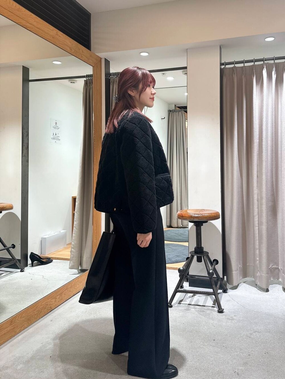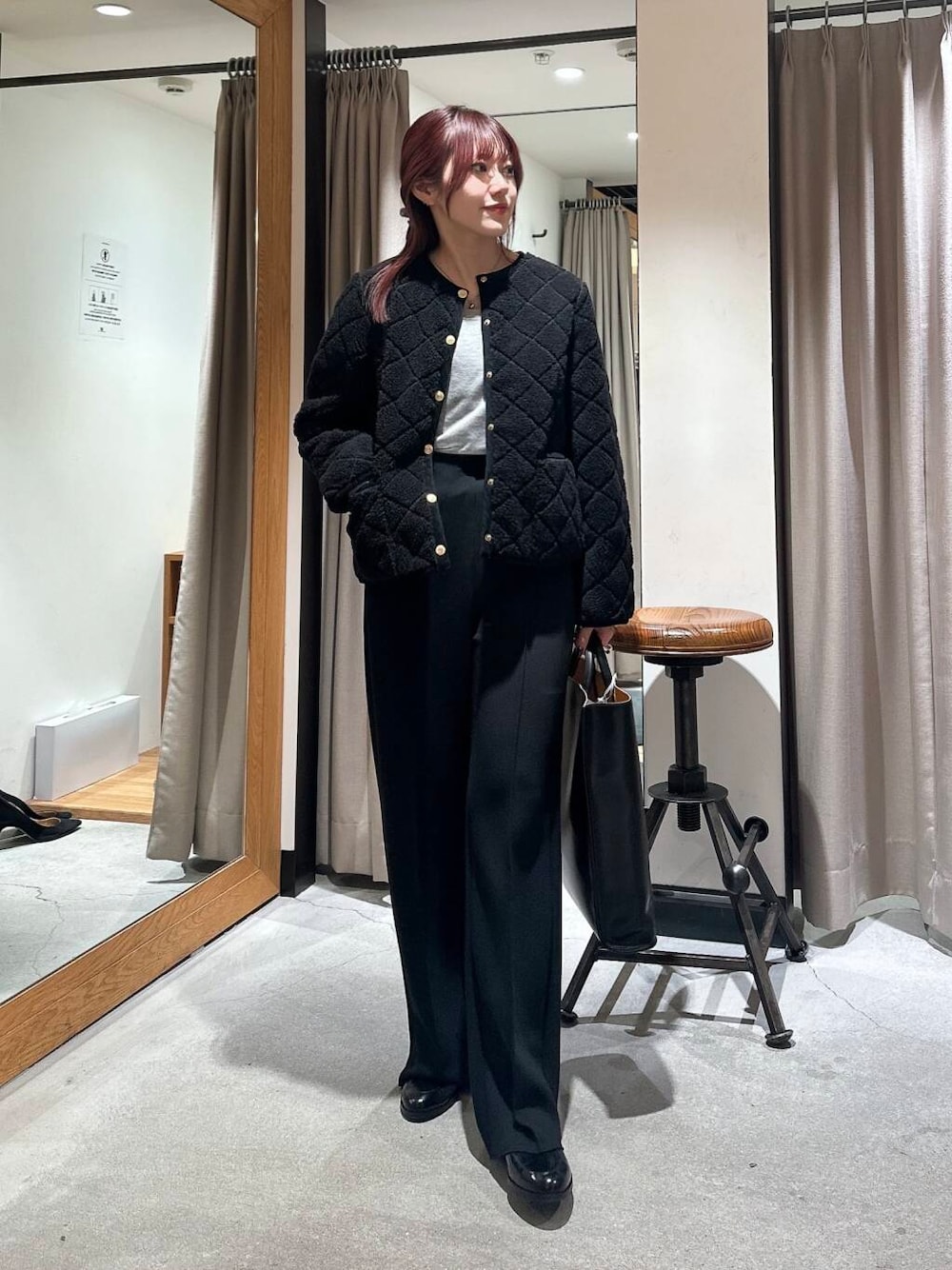 アウターがモコモコなのでクールすぎず、女性らしいスタイリングです
