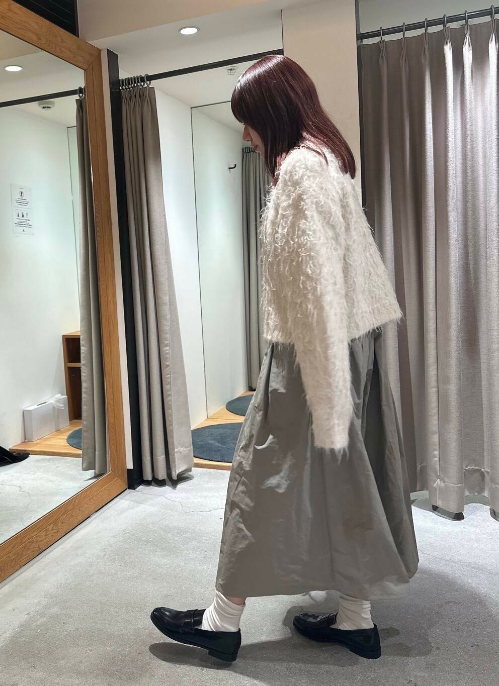 ボリューム感があるスカートと合わせるときは下のボタン外すとバランス取りやすいです❕