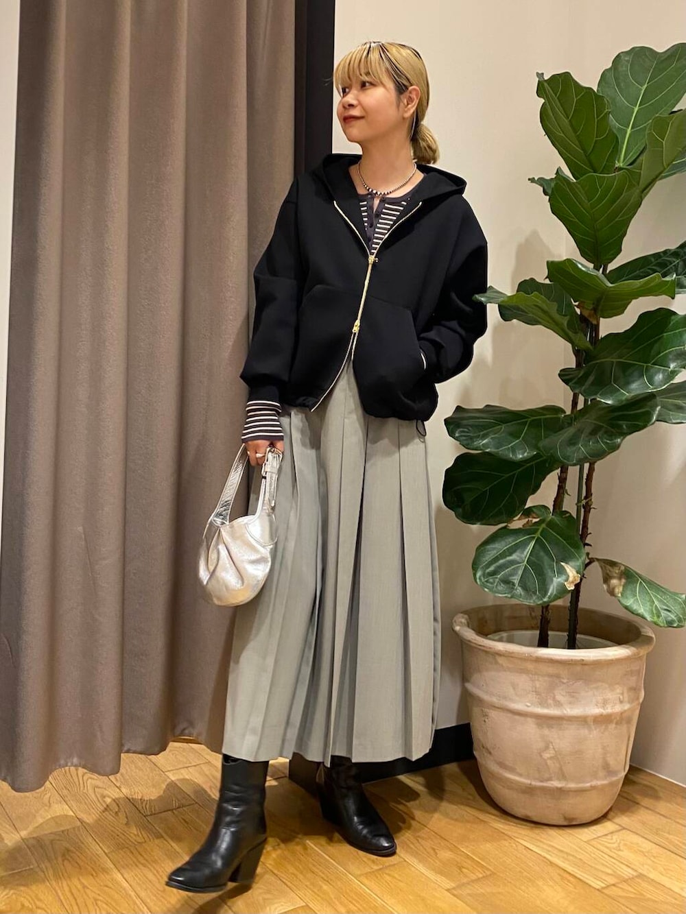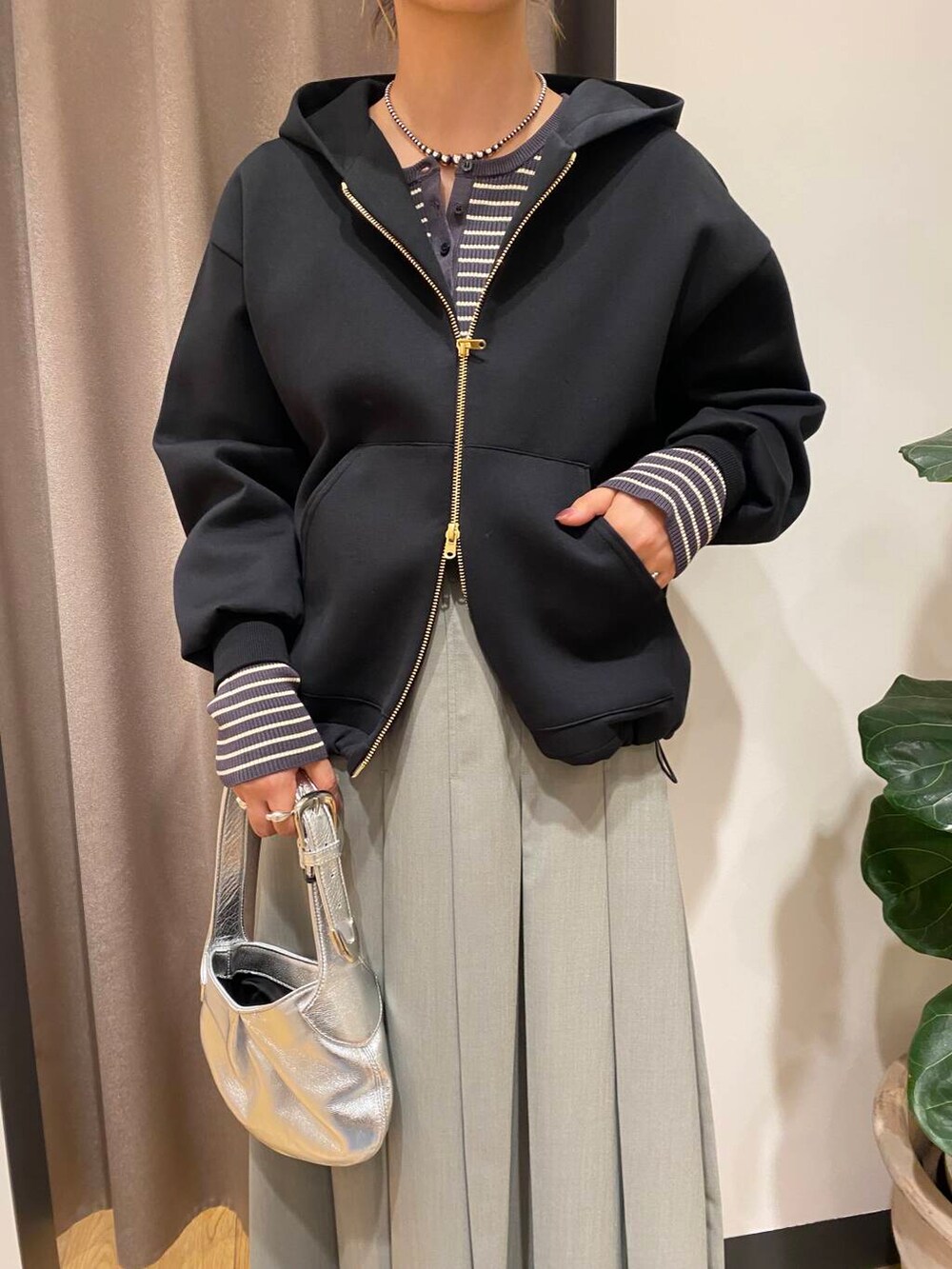 パーカーはダブルジップになっていて、下から開けて着るのがポイントです!サイドにしぼりもあるので、ぎゅっと丸みのあるシルエットで🤍