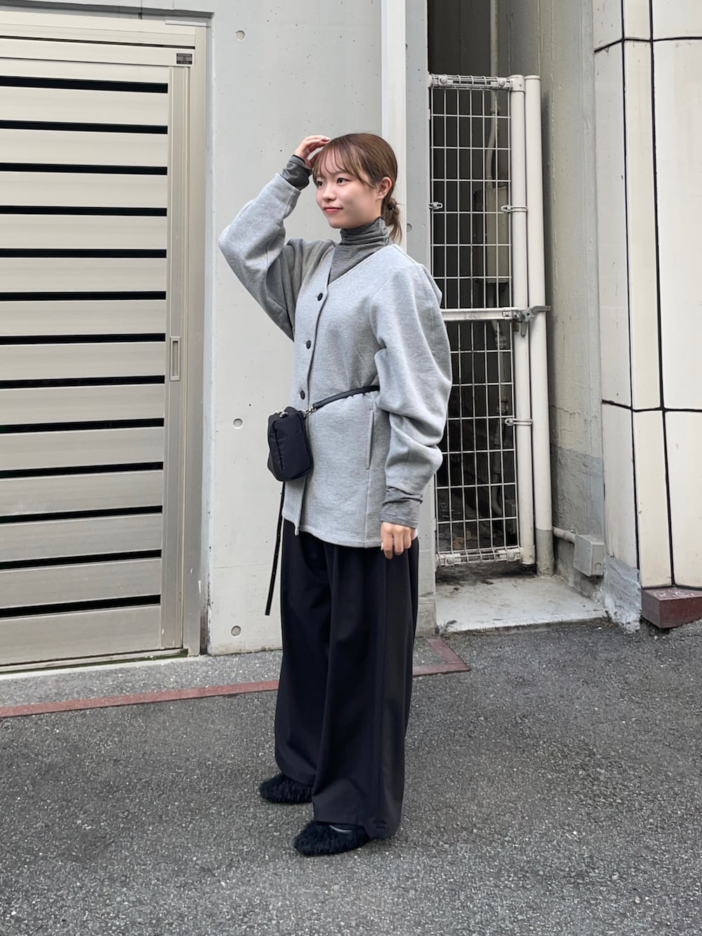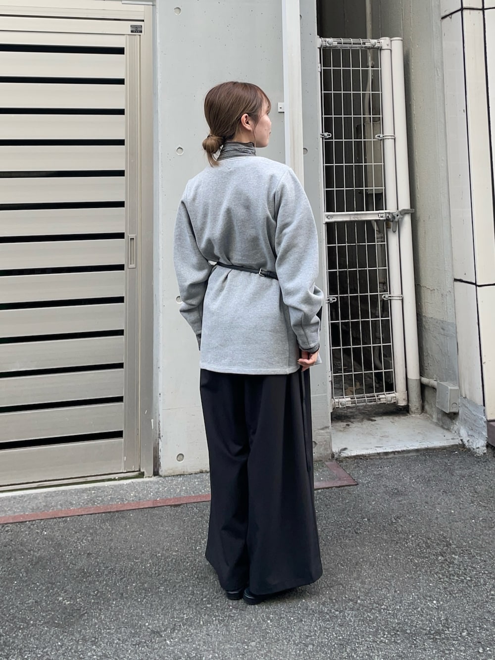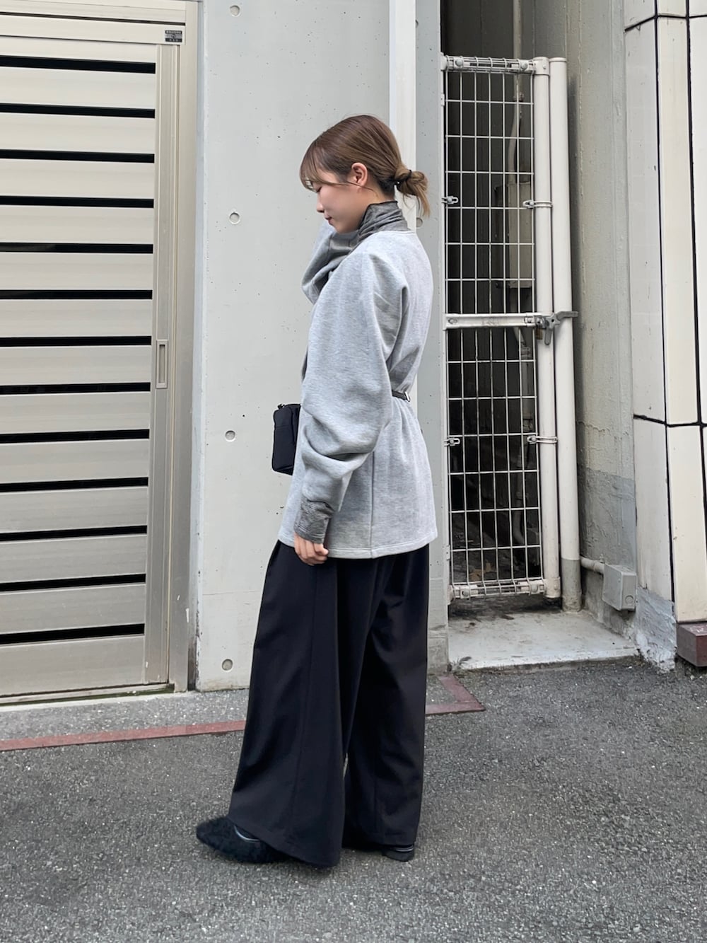 パンツはウールが少し入ったワイドパンツで、私の身長で36を履いてます!また8センチ裾上げのお直しをしておりますが、ウエストがゴム紐で調節できるので、小柄な方やウエストが細身な方にも、ぜひ着てみて欲しいパンツですよ〜!