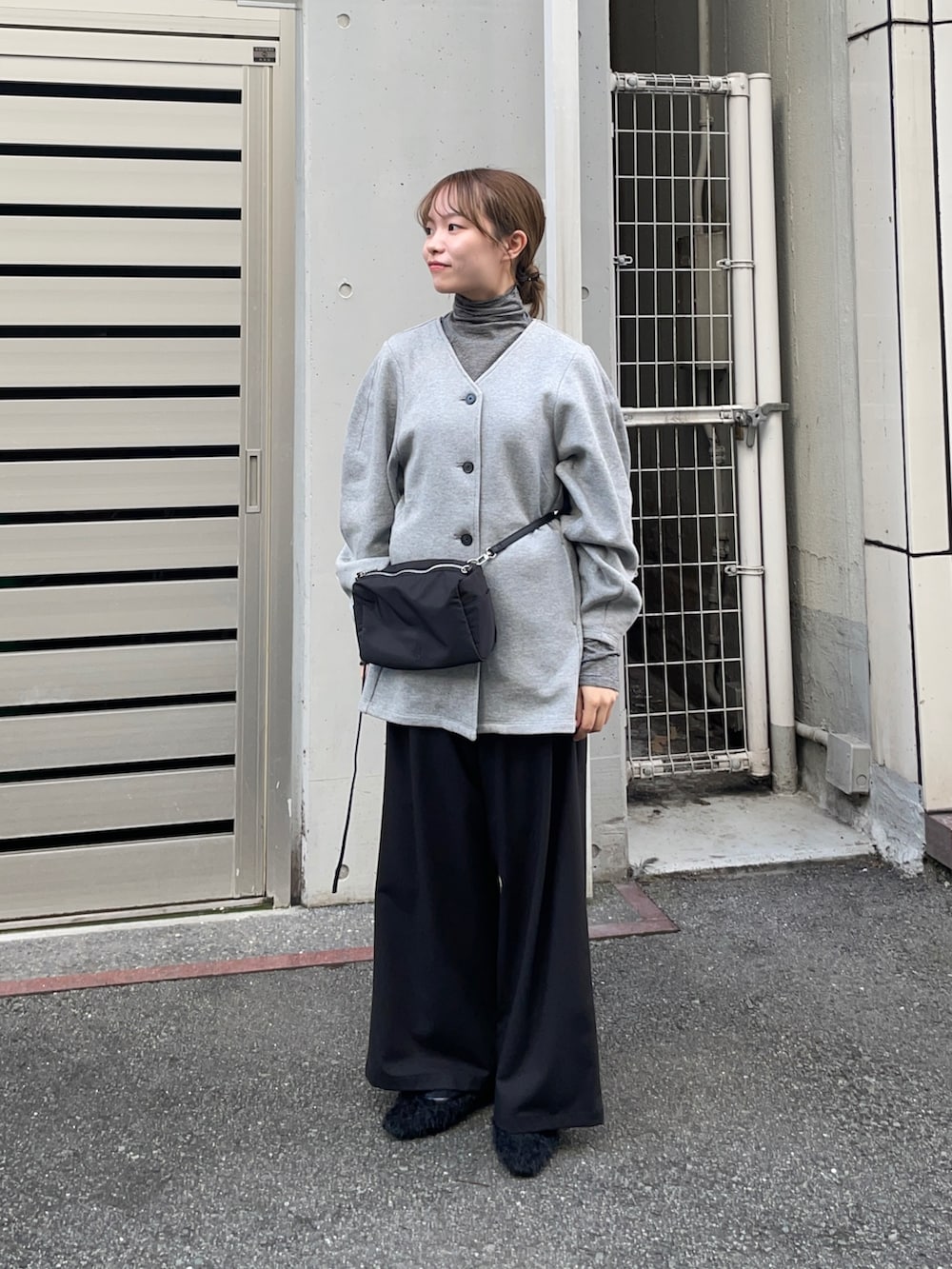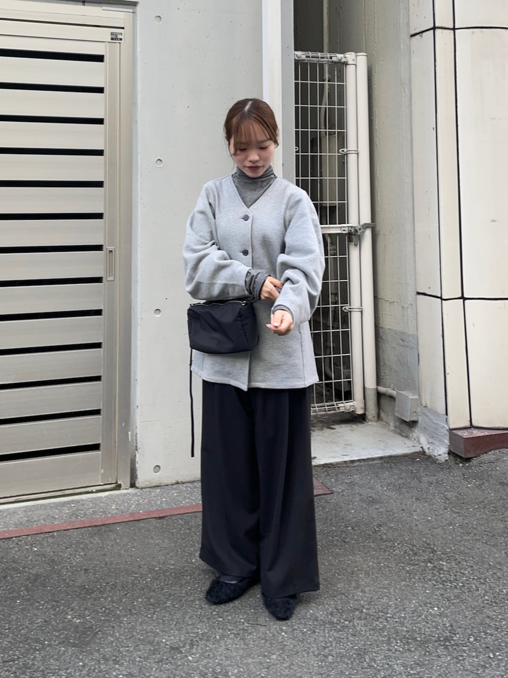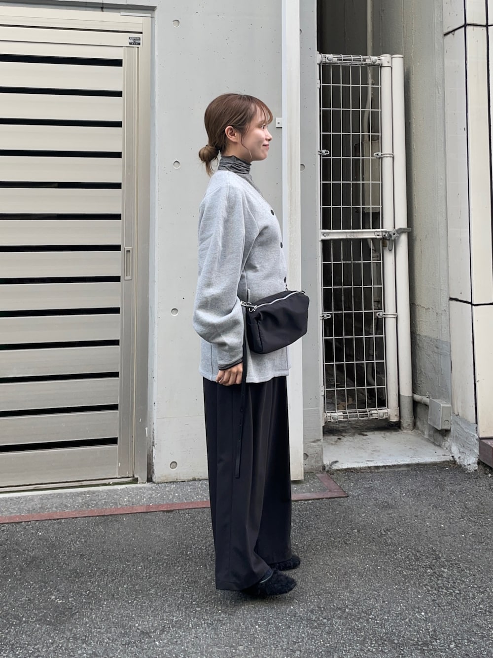 パンツはウールが少し入ったワイドパンツで、私の身長で36を履いてます!また8センチ裾上げのお直しをしておりますが、ウエストがゴム紐で調節できるので、小柄な方やウエストが細身な方にも、ぜひ着てみて欲しいパンツですよ〜!