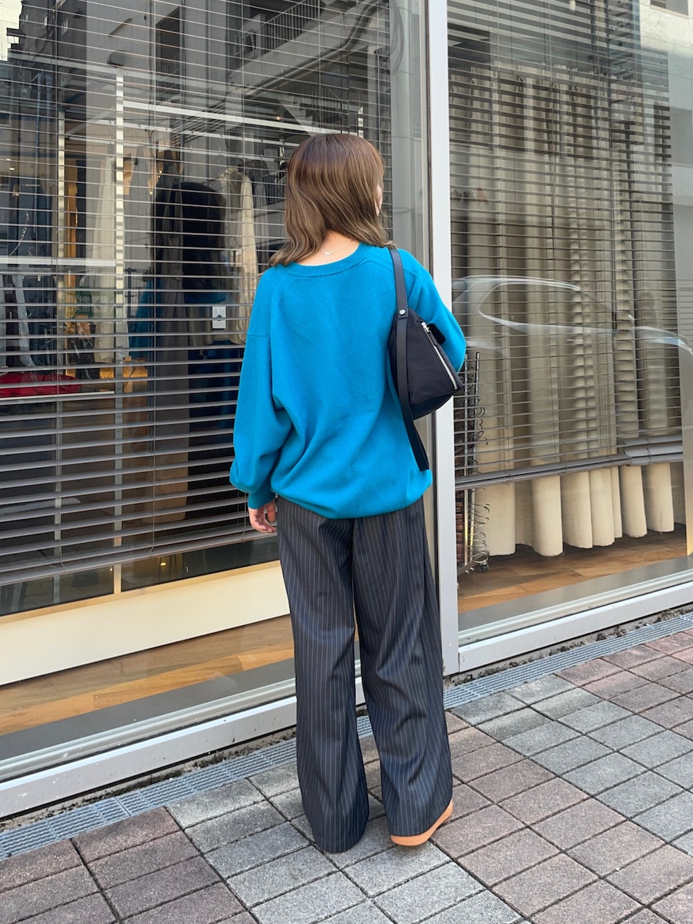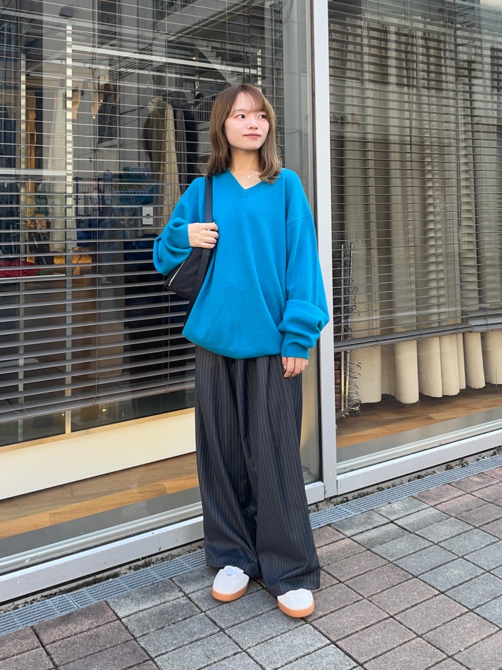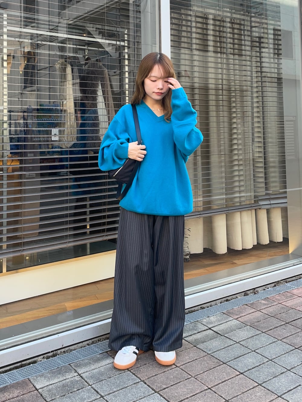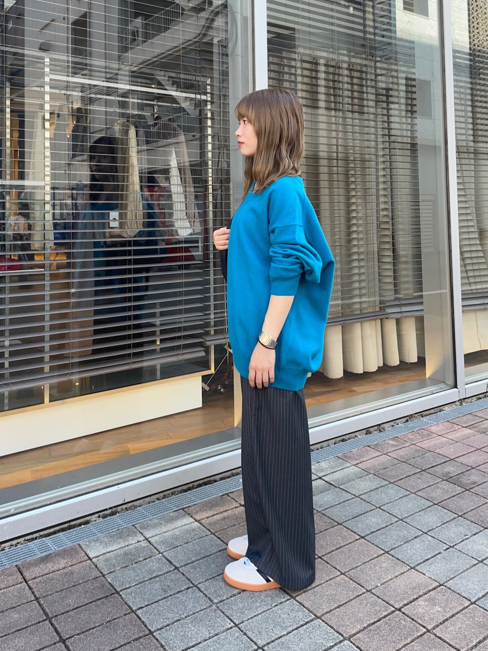 トップスのウール100%のニットはお家で手洗いができる機能性バツグンのアイテムです!形は首元がVネックになっており、鎖骨をキレイに見せてくれて、薄手のタートルニットなど重ねても可愛いですよ!お尻まで隠してくれる丈感とゆったりな着丈がリラックス感を与えてくれます!