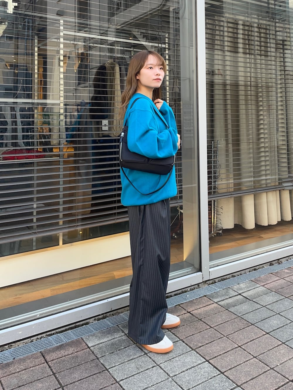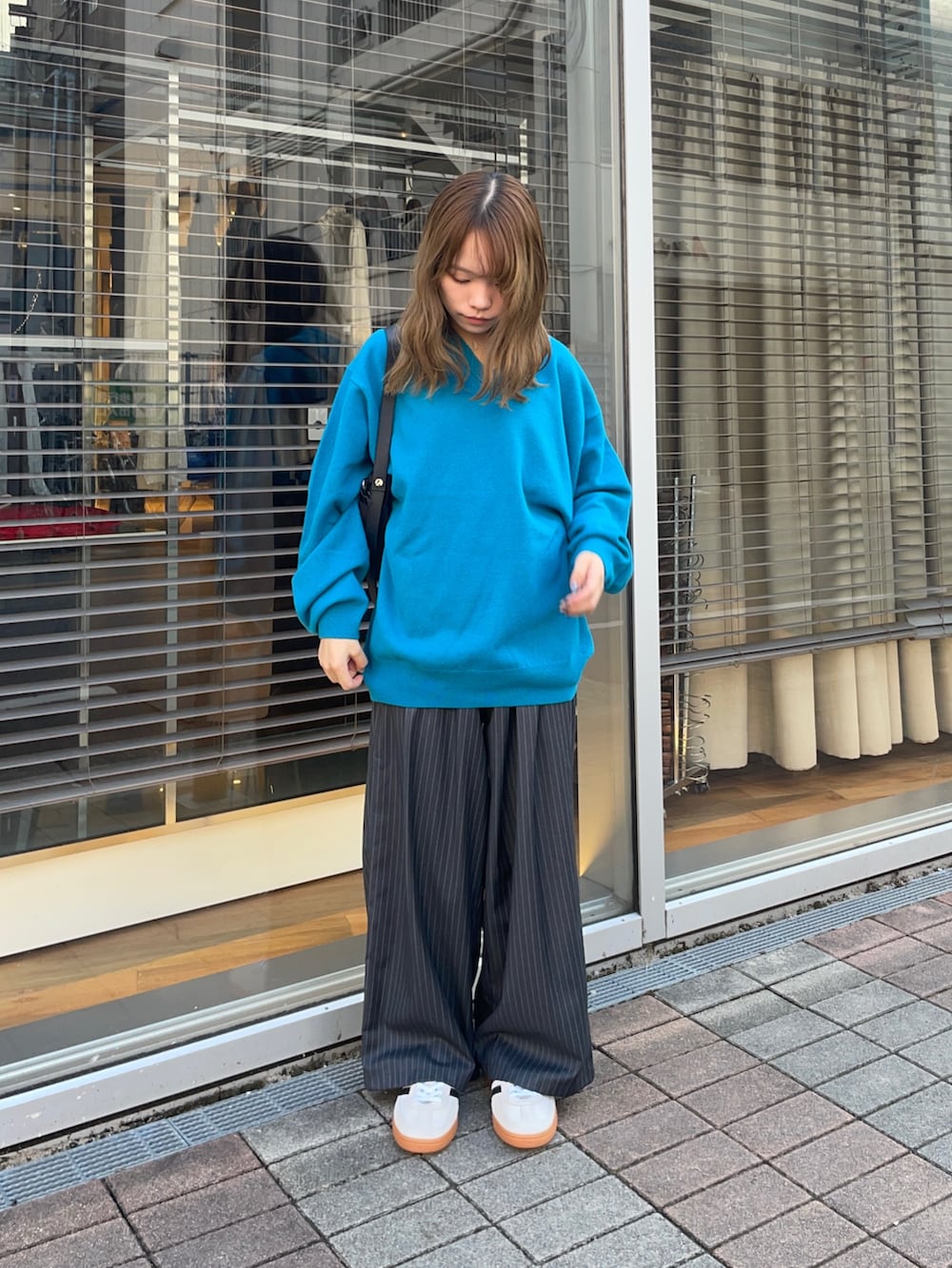 パンツはチャコールの色味のストライプ柄ギャザーパンツです!ウエストゴムで履きやすく、無地のトップスに少し控えめなストライプが挑戦しやすく、オススメですよ!私は8センチ裾上げお直ししてます!