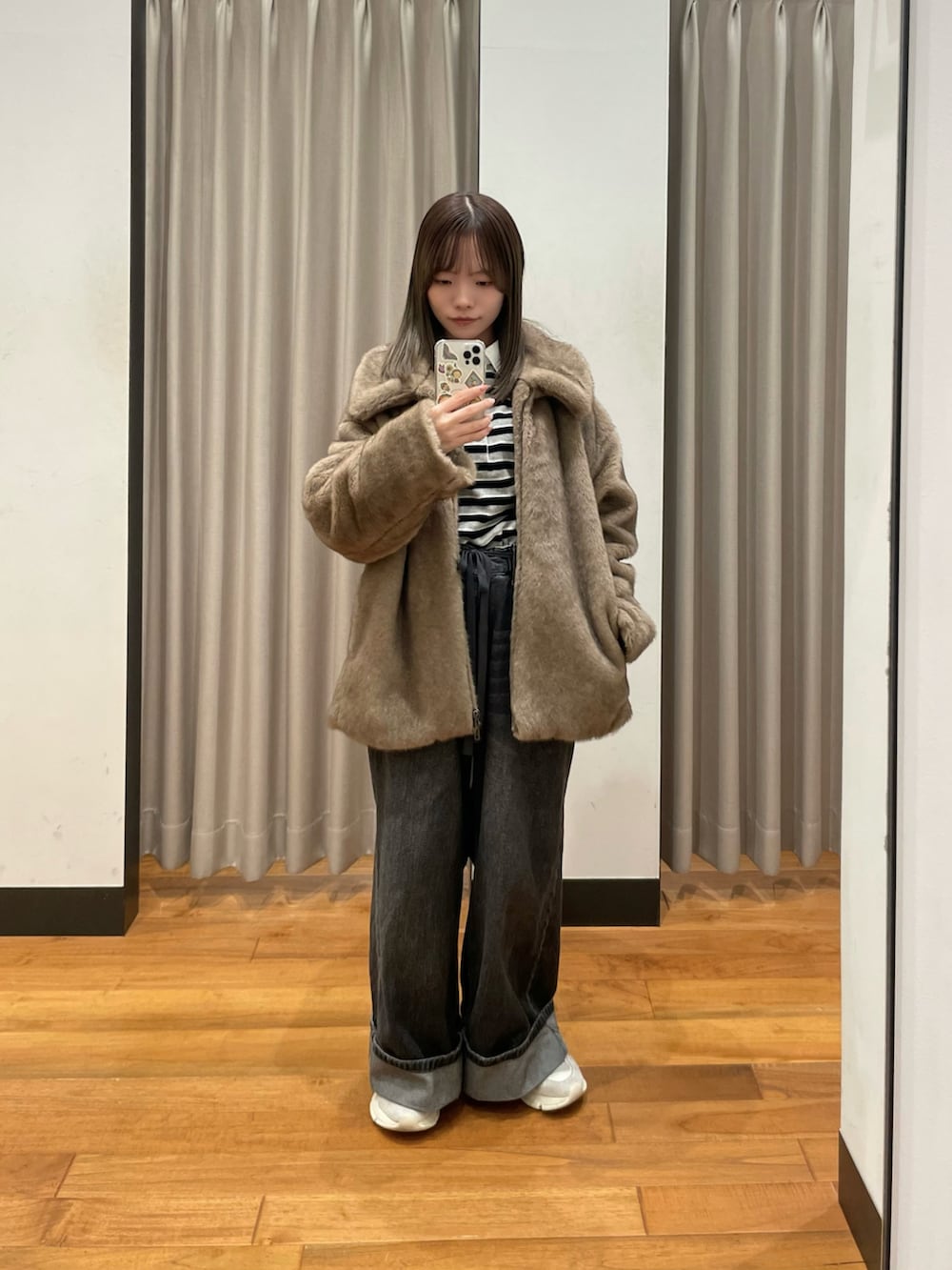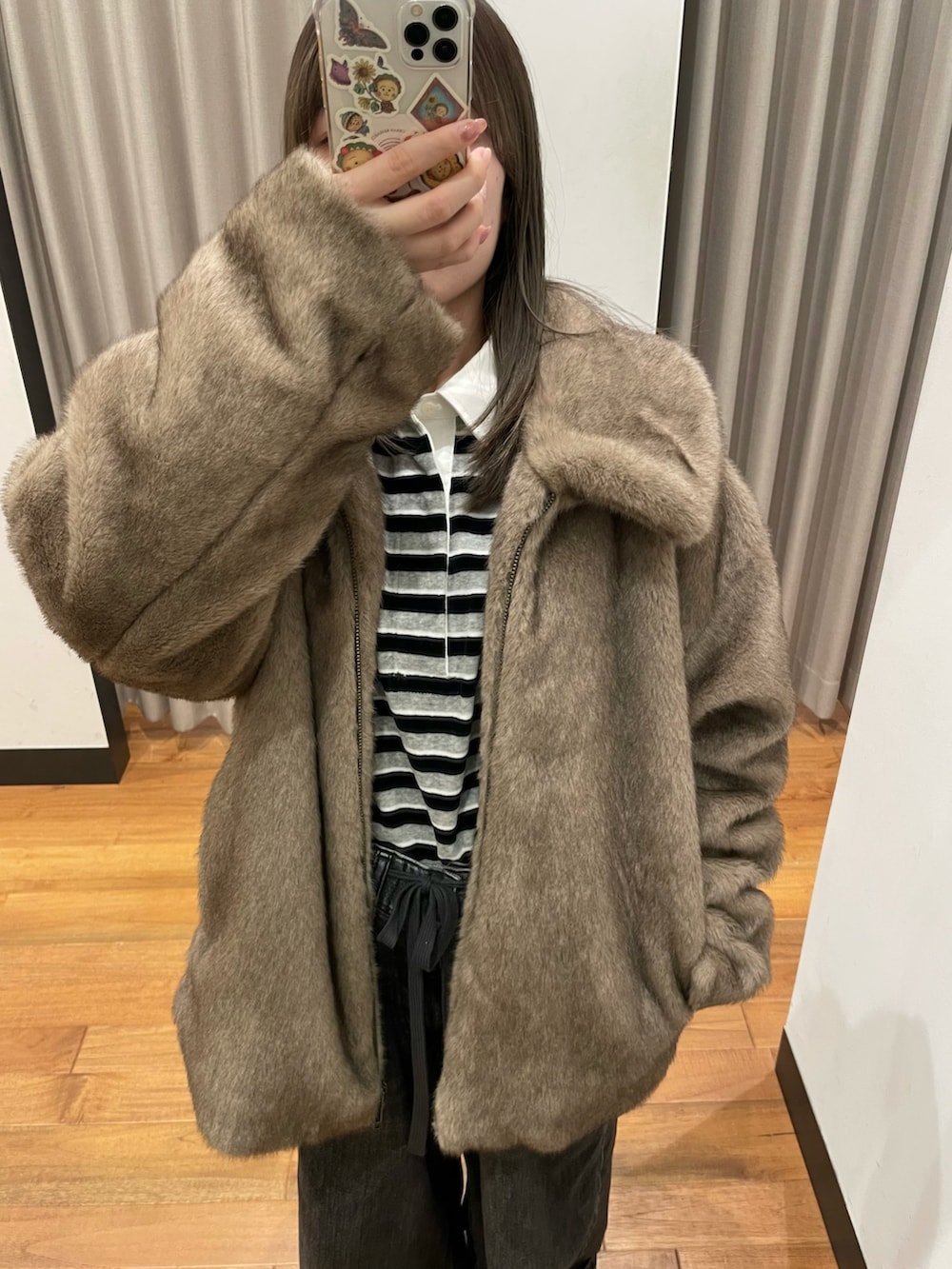 羽織は、本物の毛皮のような触り心地のミンクライクファーコートで、シンプルなデザインと存在感のある大きめな襟が上品なイメージを与えてくれます!パンツ合わせや、スカート、柄の入ったアイテムなどと合わせても可愛いと思いますよ!✨