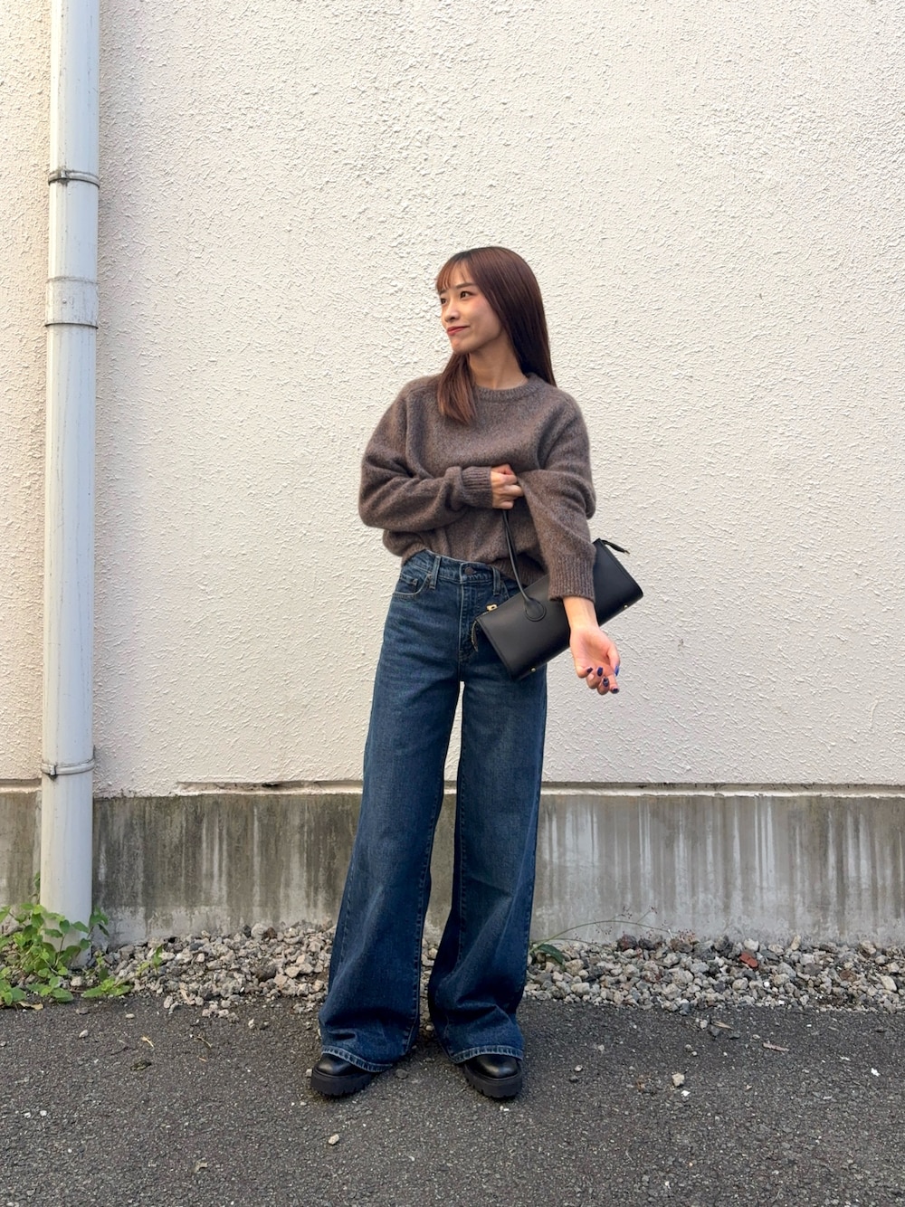 トップスのニットはウールとカシミヤでできたやや厚みのアイテムで、とても柔らかく暖かいです!また肩にパットが入っており、キレイめなシルエットになります✨