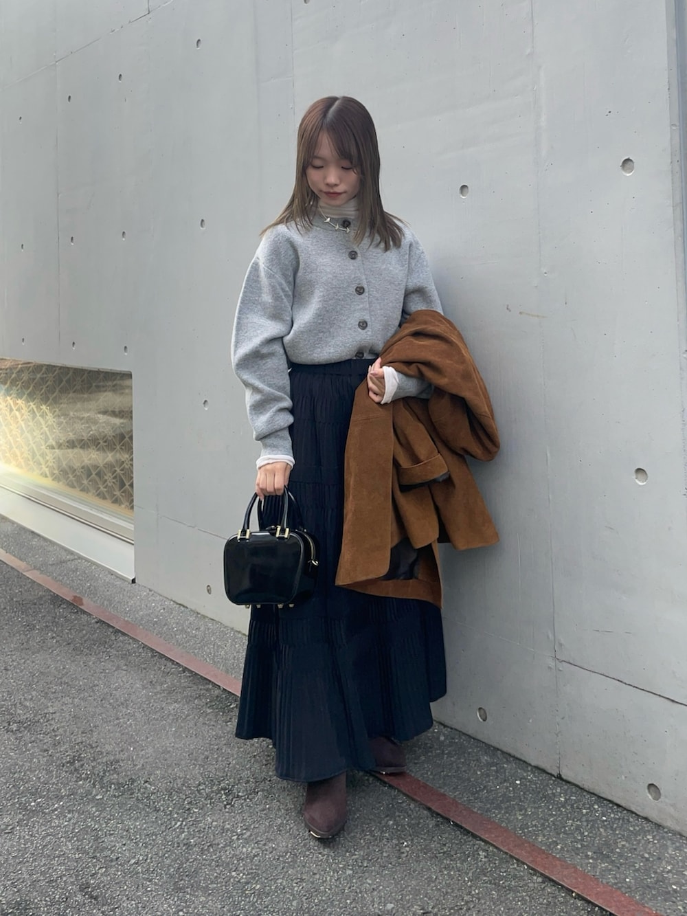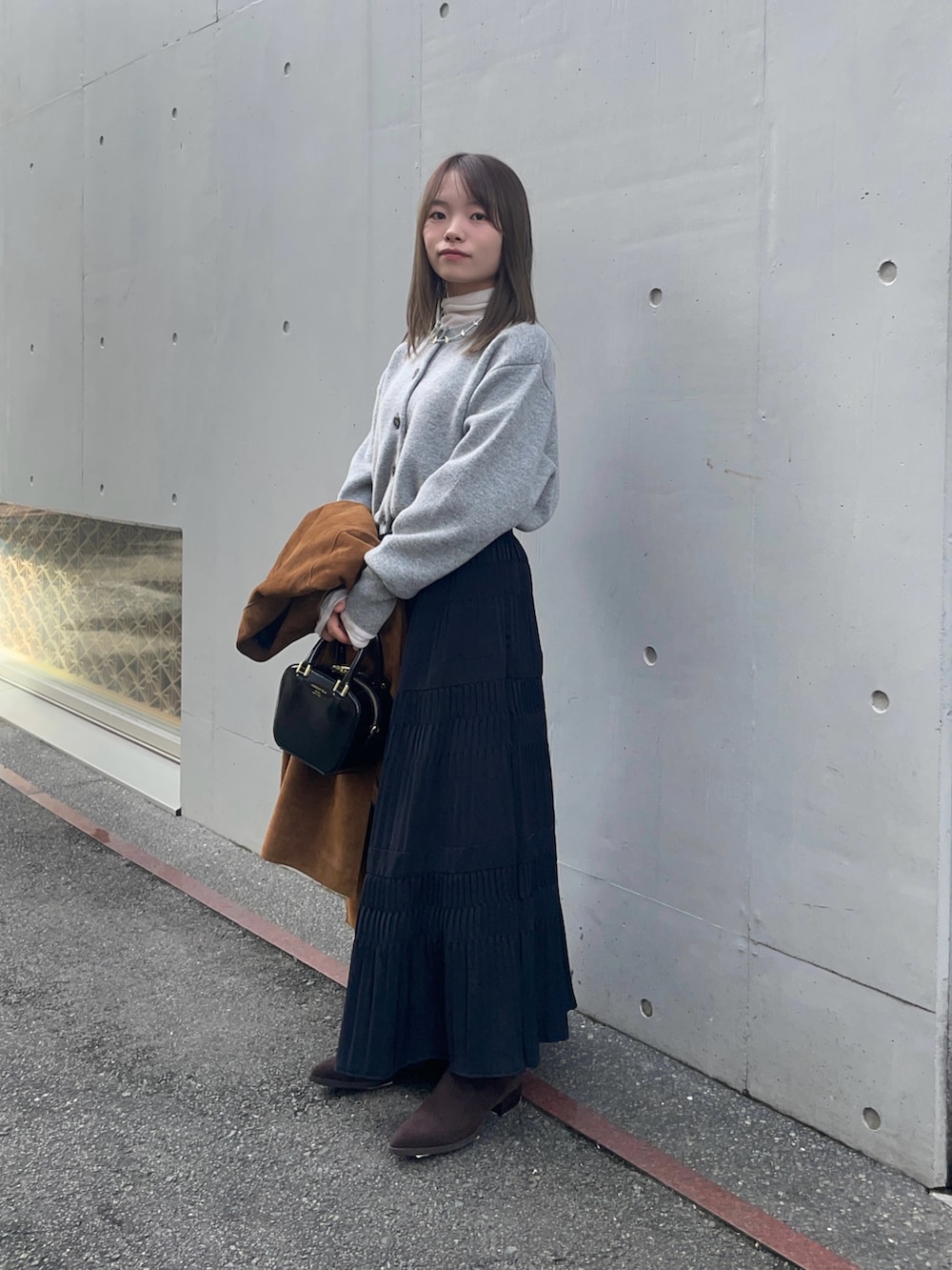 スカートはプリーツティアードスカートで、広がりすぎないボリュームのスカートです!裏地付きなので1枚で使えて、甘くなりすぎないデザインがオススメポイントです!私の身長でもウエスト折らずに使えました!