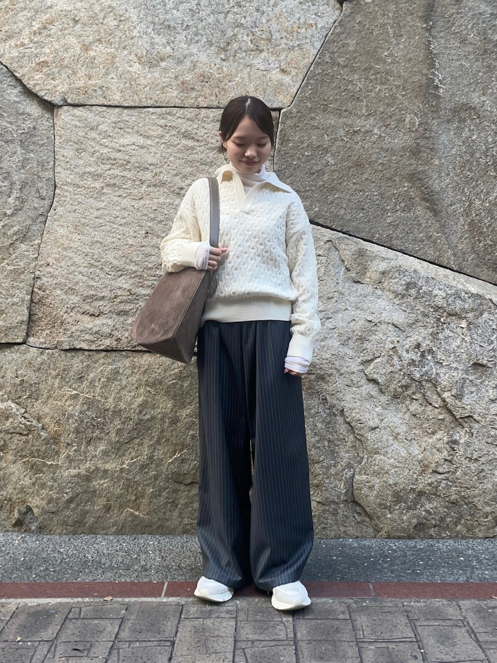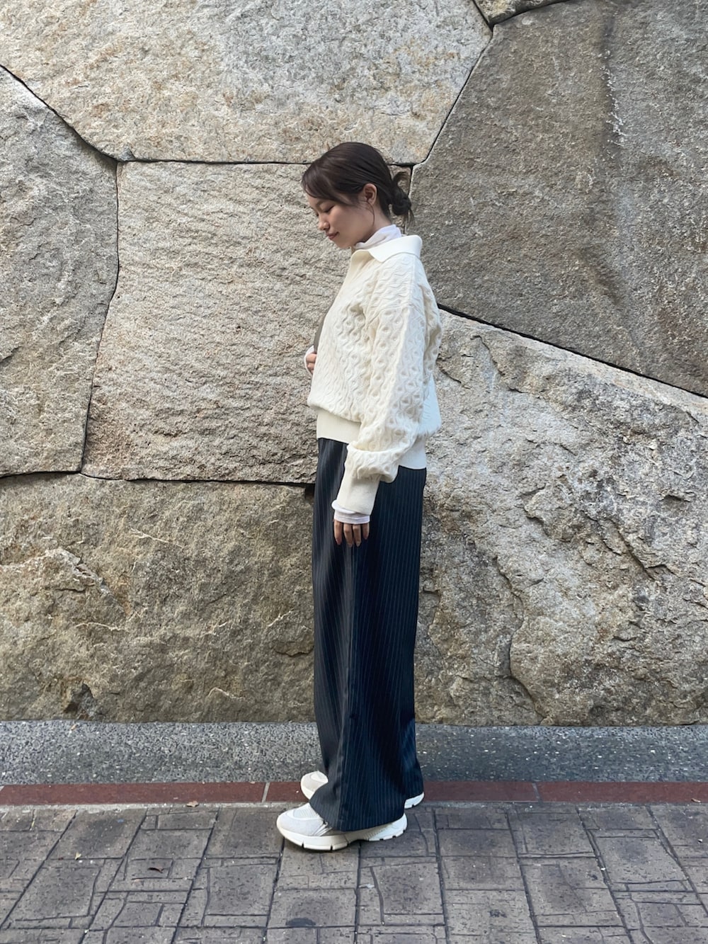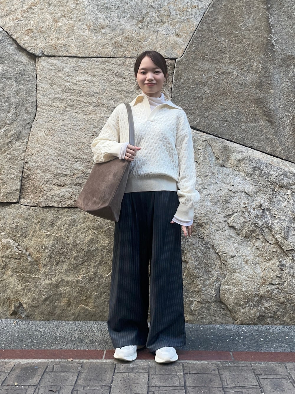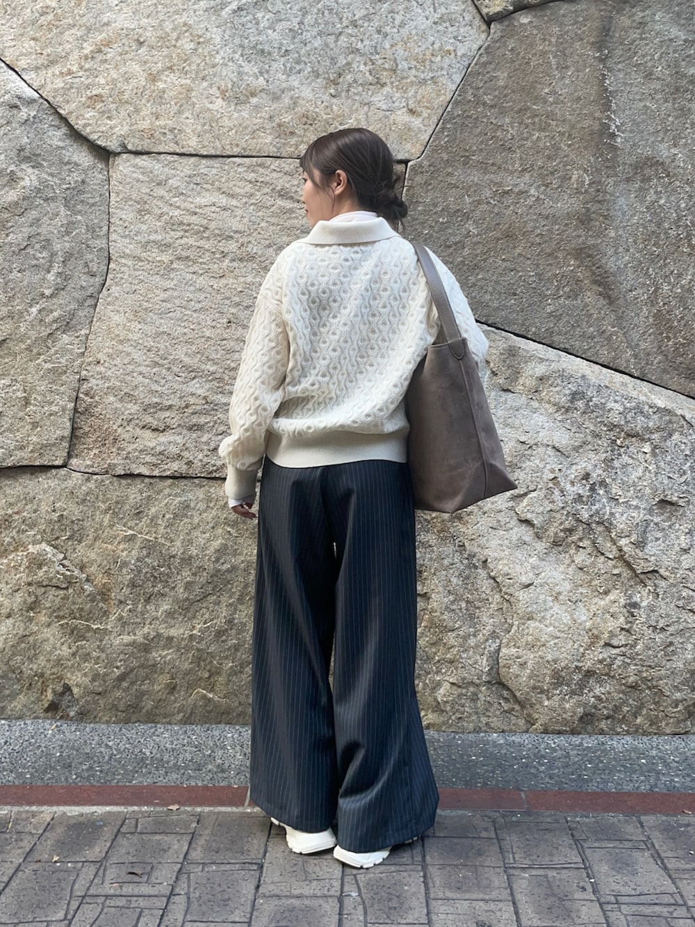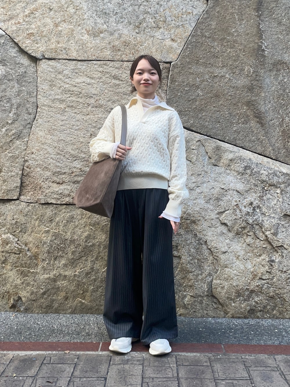 トップスのニットは別注アイテムのもので、新潟県五泉市のニット一貫工場から生まれたニット工場による、ニット工場目線の、ニットブランドです!ケーブル編みでスキッパーデザインの首元はスッキリとした印象を与えてくれます!私は中にタンクトップを重ねて着ていますが、ゆったりとしたシルエットでリラックスして着ていただけます!