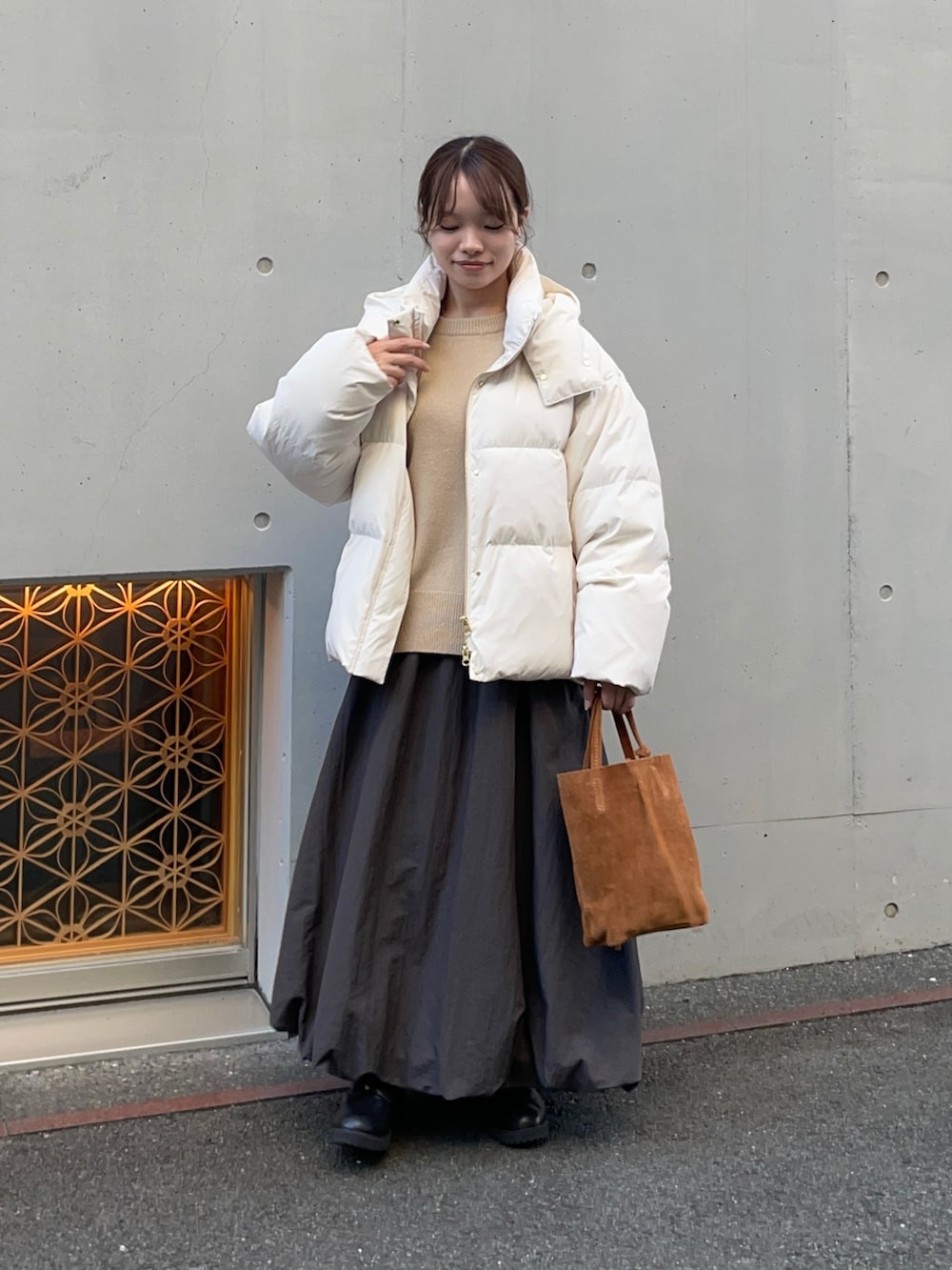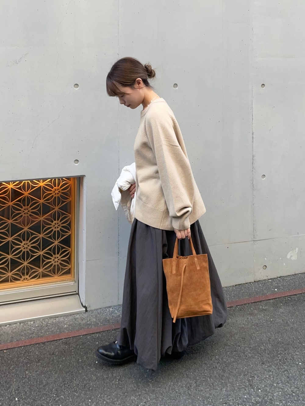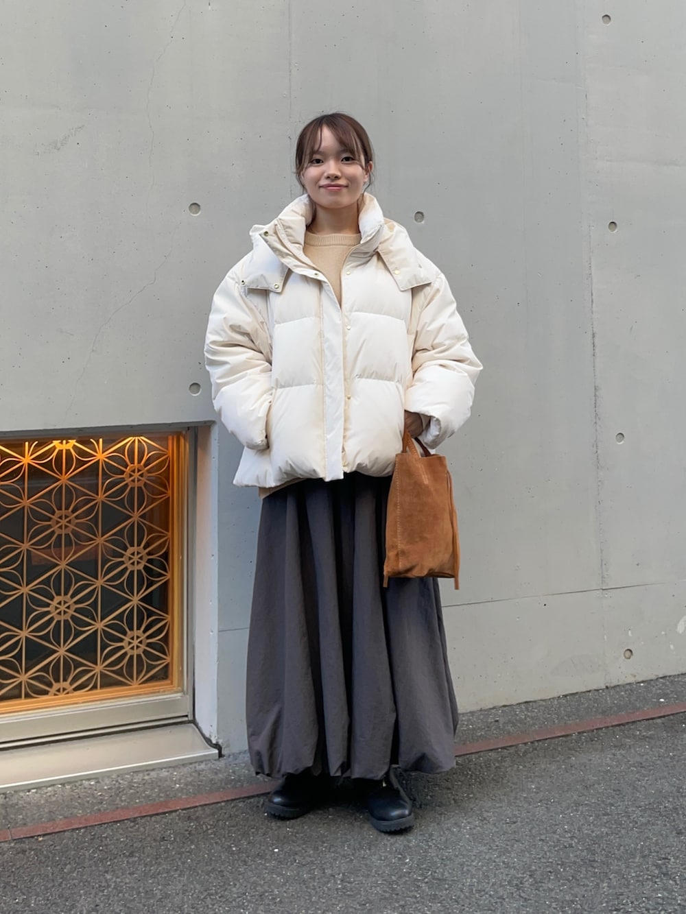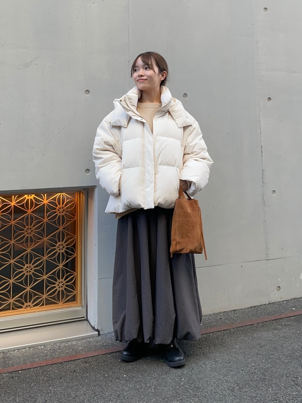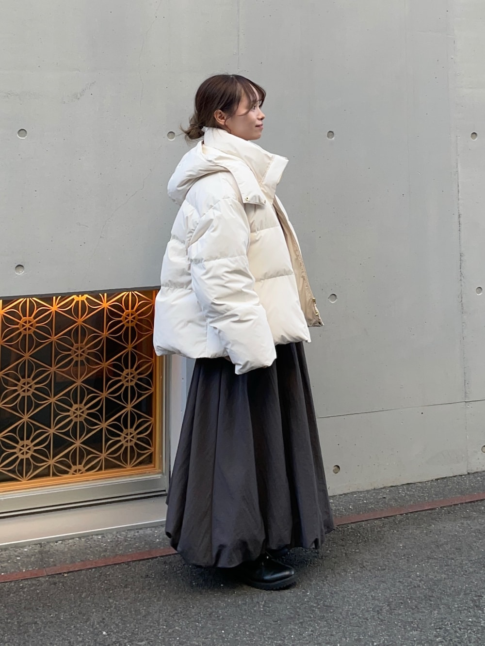 スカートはバルーンスカートで、私は38のサイズを履いております!あえて丈感長めに着てみました!ウエストはゴム紐で調節できるので、ウエスト細身の方にもおすすめです!✨甘すぎないデザインとマットなナイロン素材が、カジュアルすぎないコーデにしてくれます!
