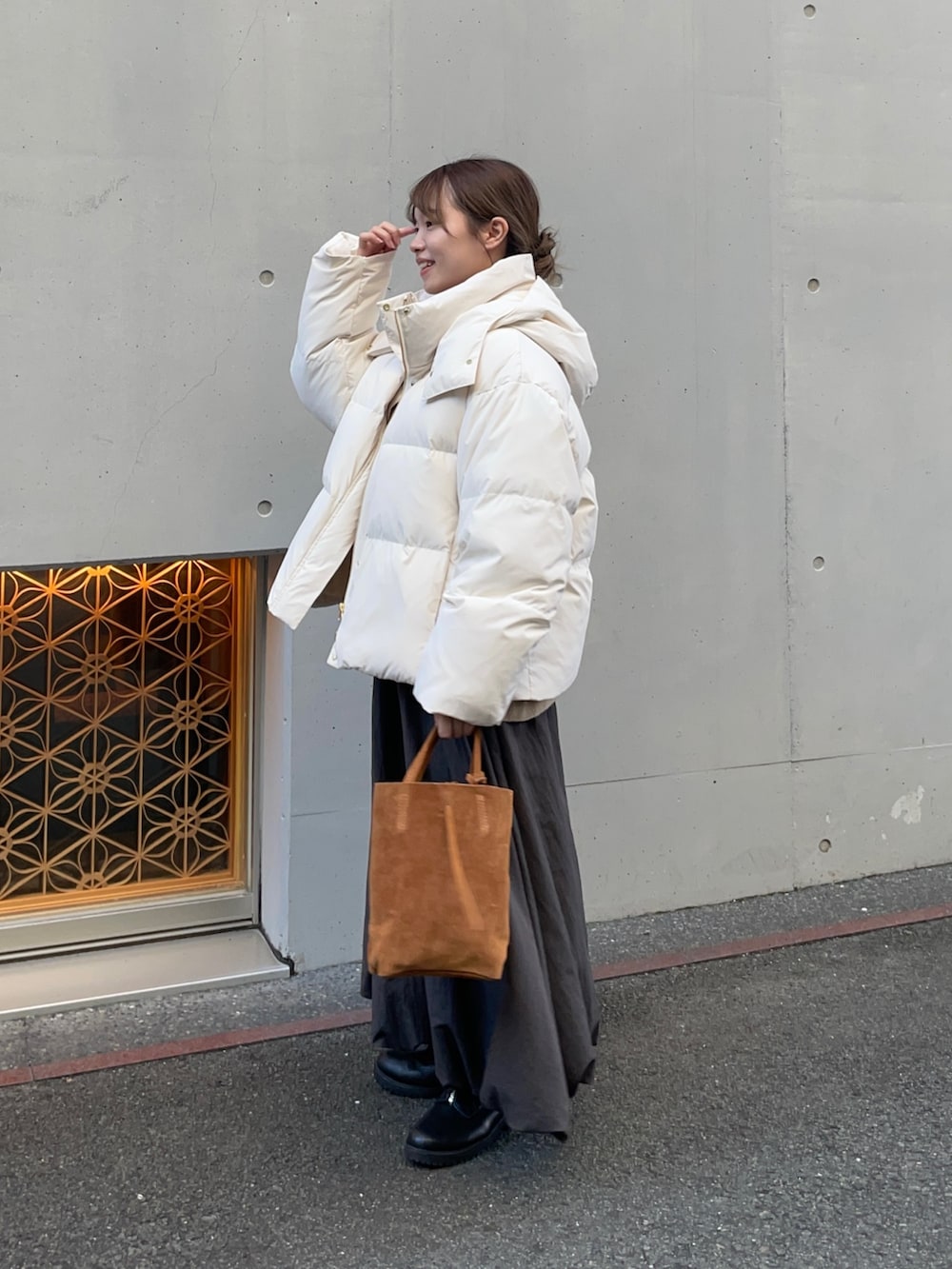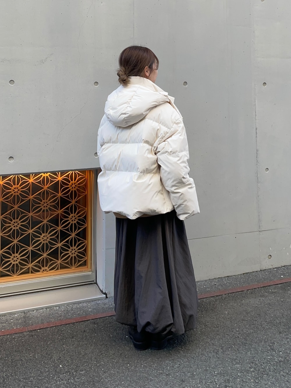 羽織はフーデットダウンコートで、ジッパーでフードが外せる2WAY使用になります!またゴールドのボタンや金具が上品な印象を与えてくれて、ダウンのカジュアルなイメージを抑えたデザインも一押しです✨あえてサイズが2サイズある中、38の大きめを着てみました!ゆりっと感が可愛いです!