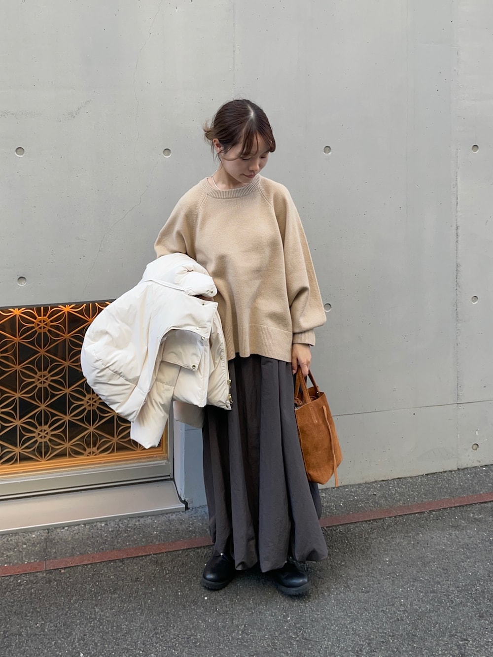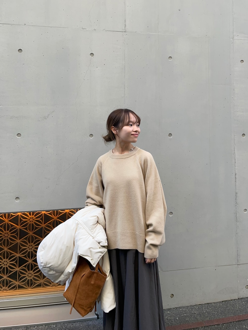 中のニットはカシミヤ素材で着丈も程よいアイテムです!前後差のある丈感で、後ろが長めなのでお尻周り隠してくれます!低身長でもそのままインせず、出して着てもスタイル良く着こなせますよ✨