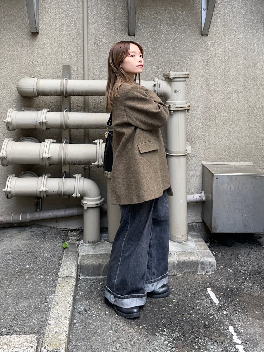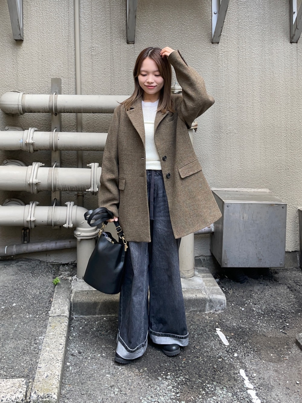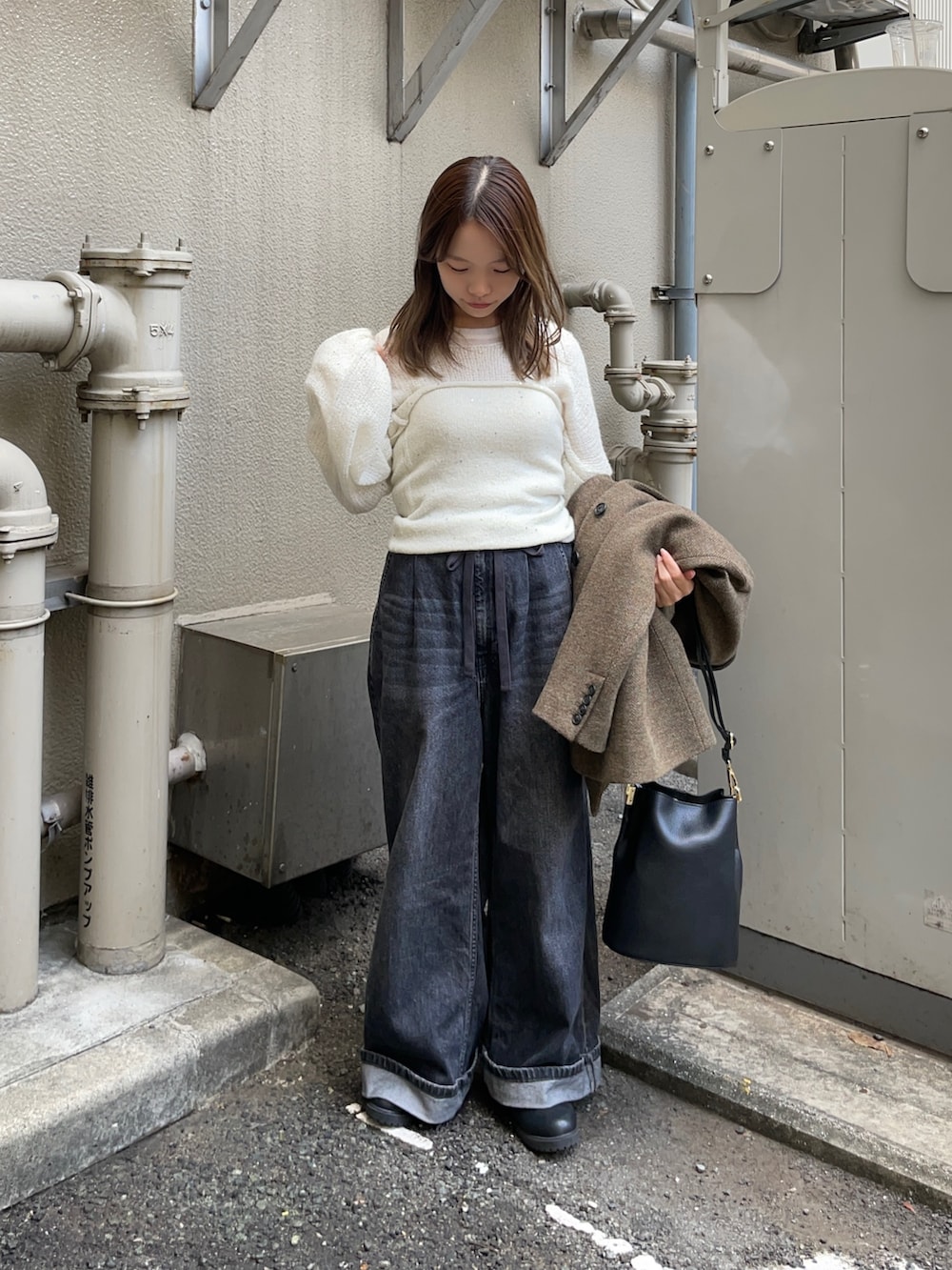 パンツはリアルバイしたデニムパンツで、ウエストゴムのところが低身長でも使えて、オススメアイテムです!私はロールアップして折っているので、低身長の方はお直しが必要かと思います!ワイドな形でゆったりと着ていただけます〜!