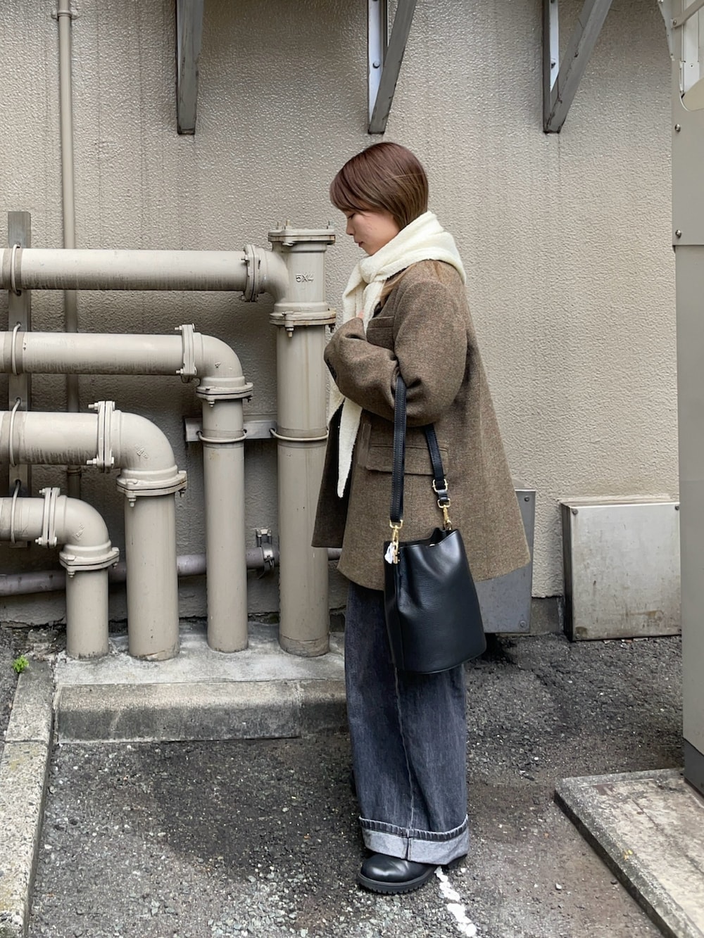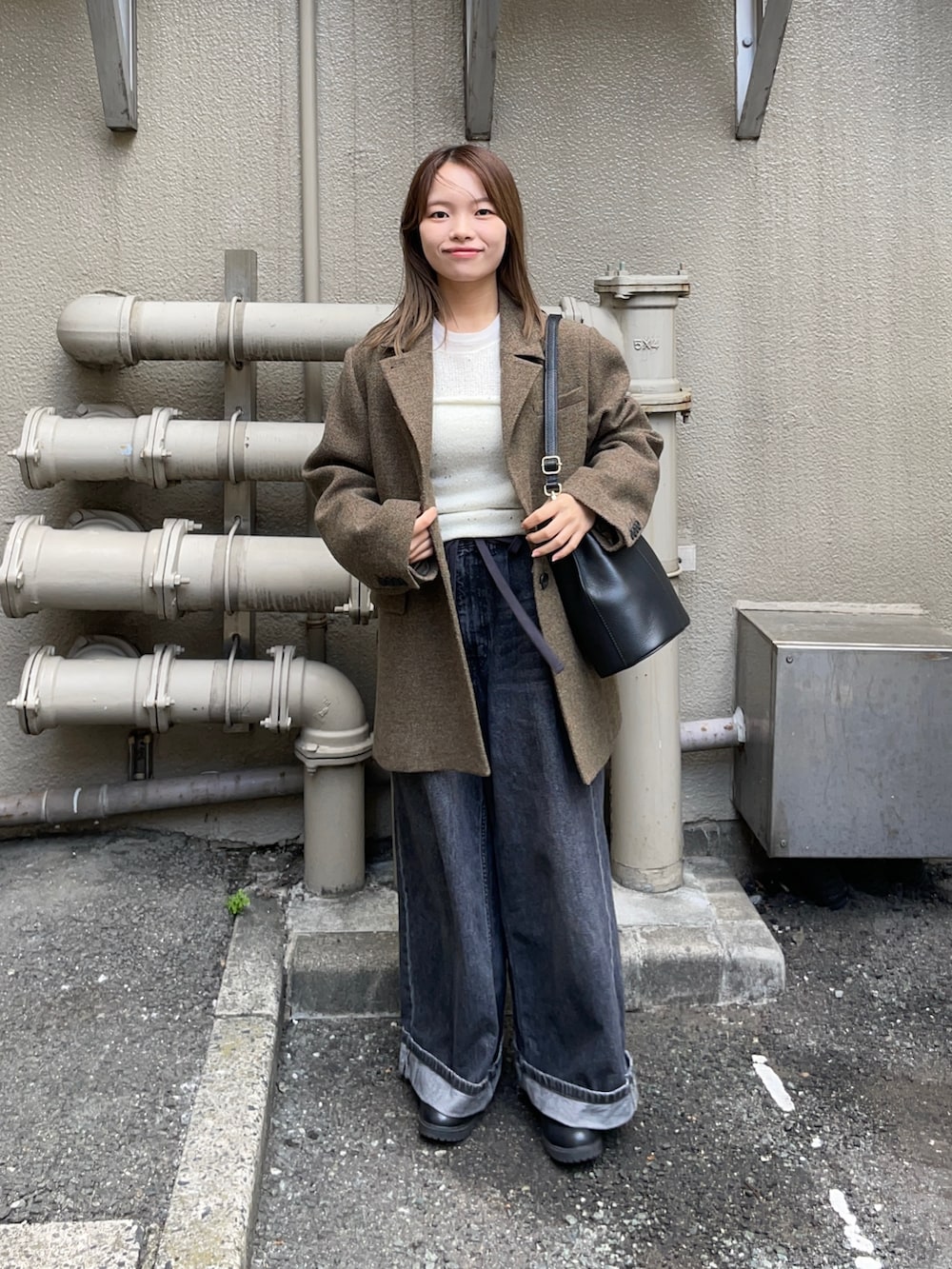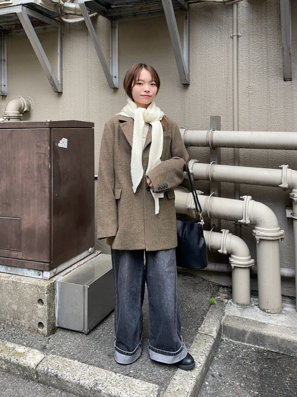 パンツはリアルバイしたデニムパンツで、ウエストゴムのところが低身長でも使えて、オススメアイテムです!私はロールアップして折っているので、低身長の方はお直しが必要かと思います!ワイドな形でゆったりと着ていただけます〜!