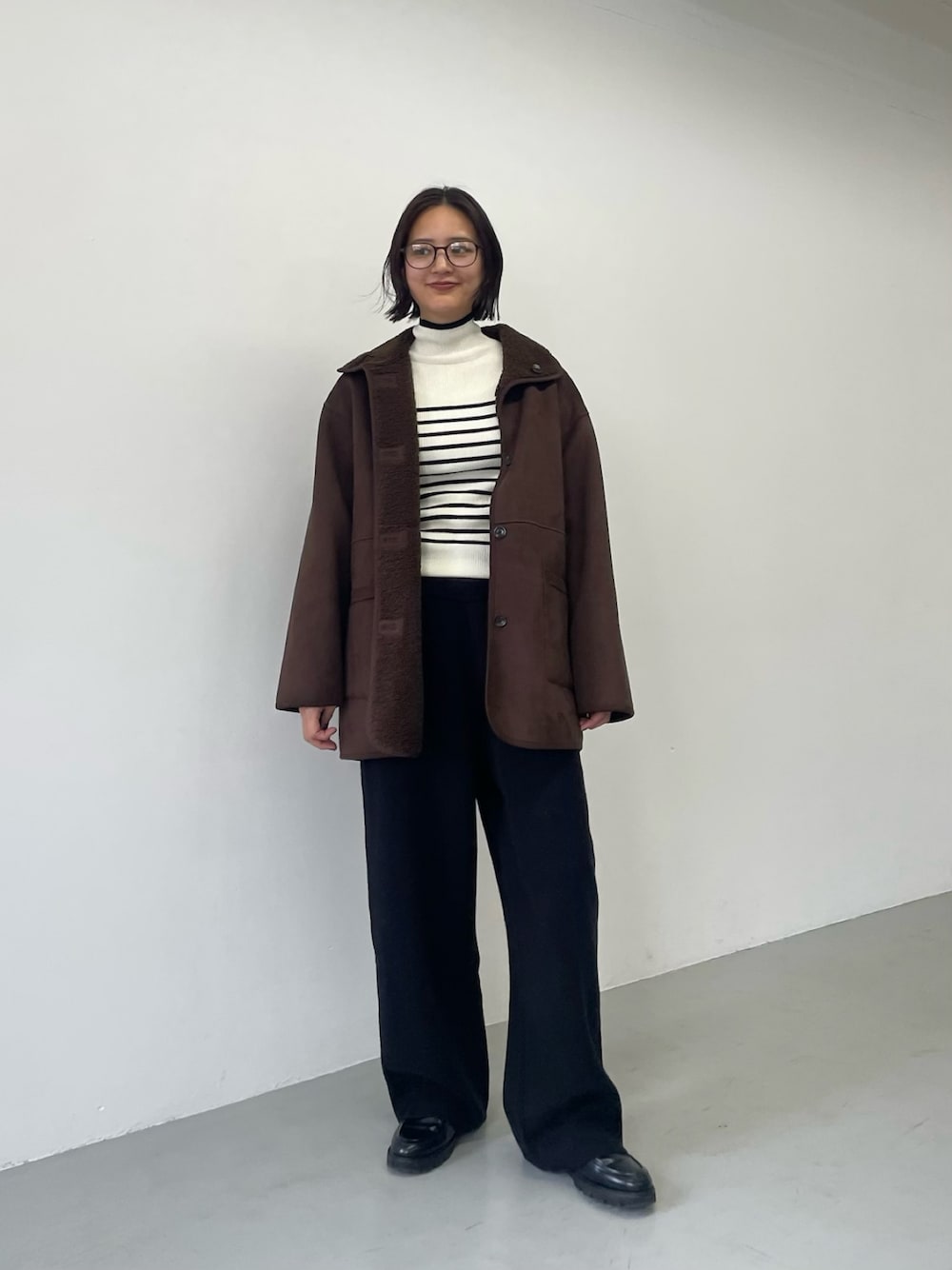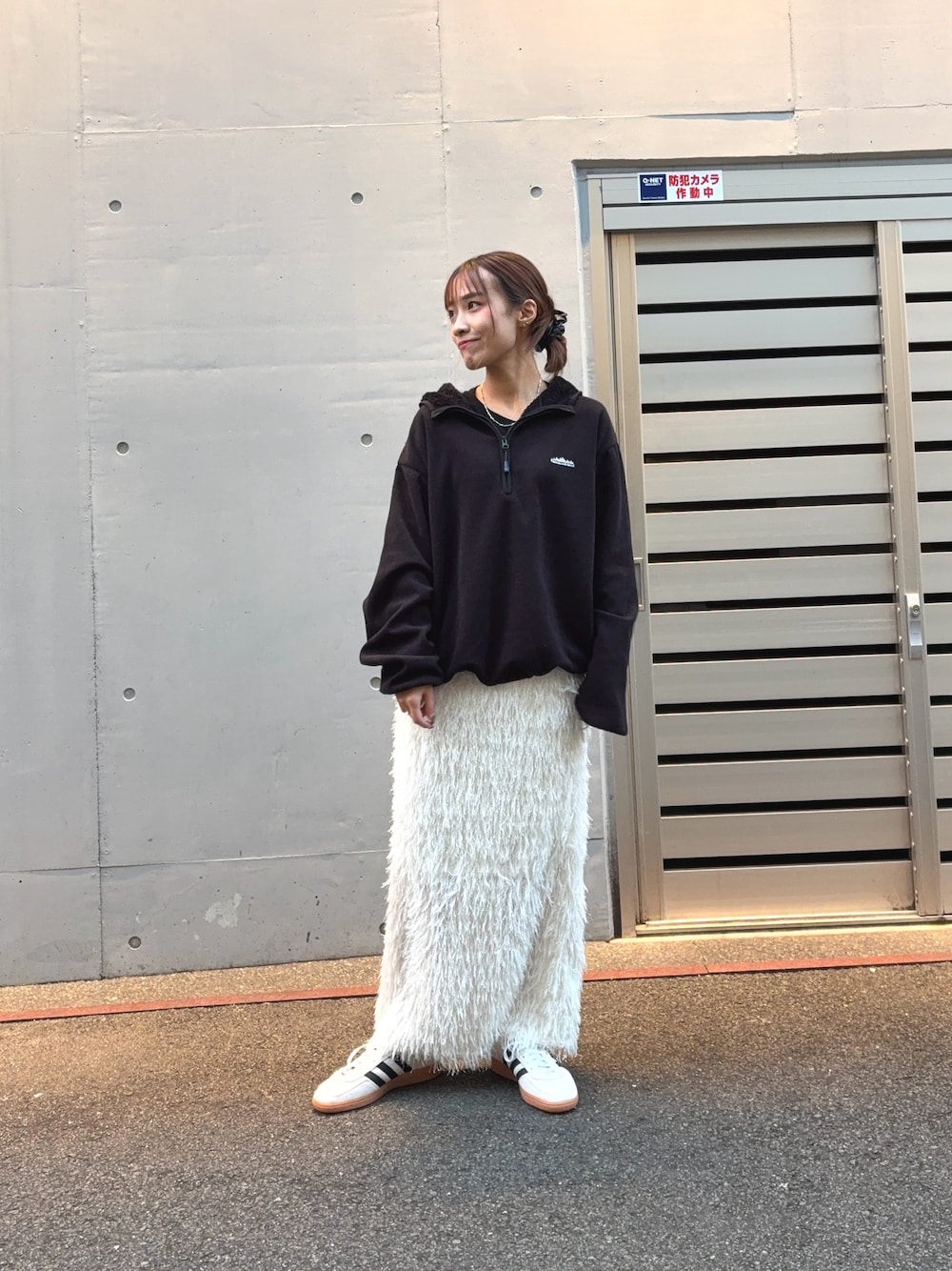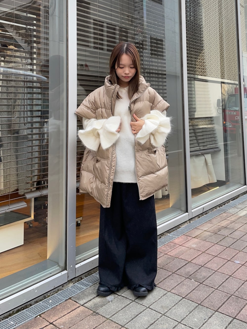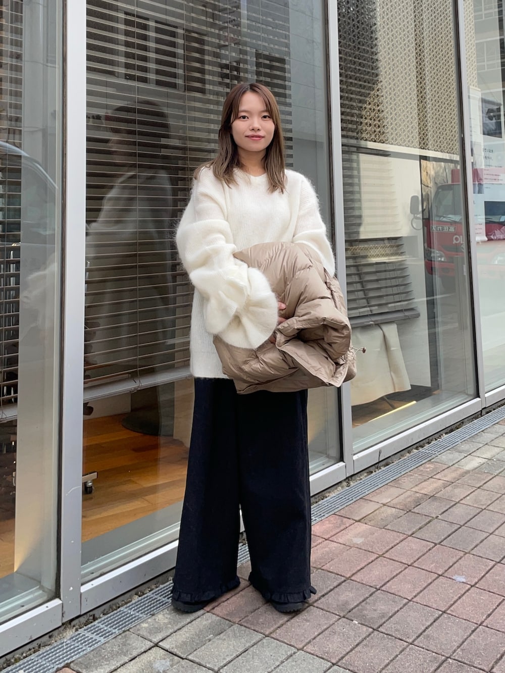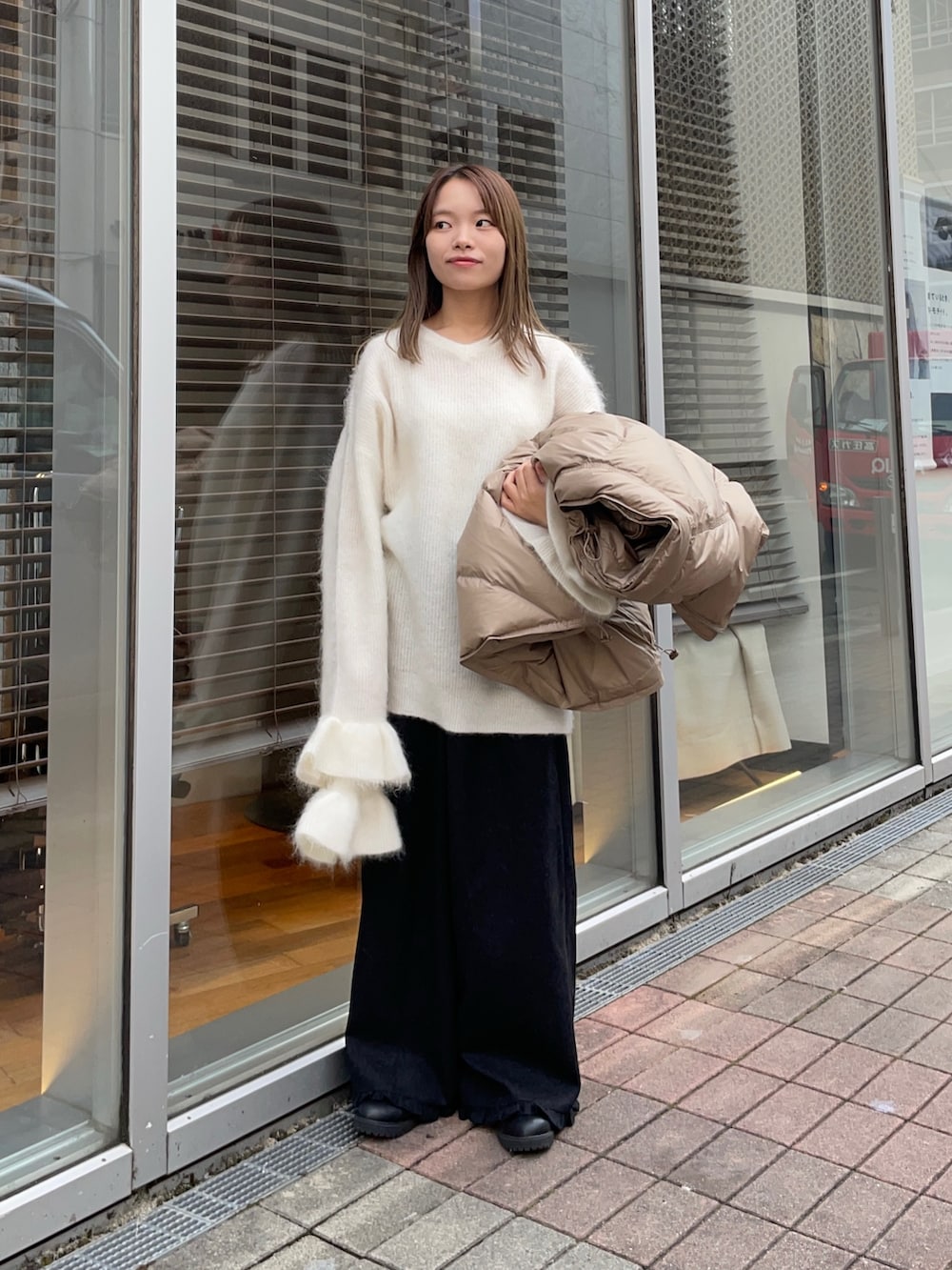 中のニットは裾のフリルが可愛い!!色味も真っ白で、甘めな印象です✨コートの中にも着れる落ち感のあるデザインで、裾から覗くフリルが控えめで可愛らしいですよ〜!