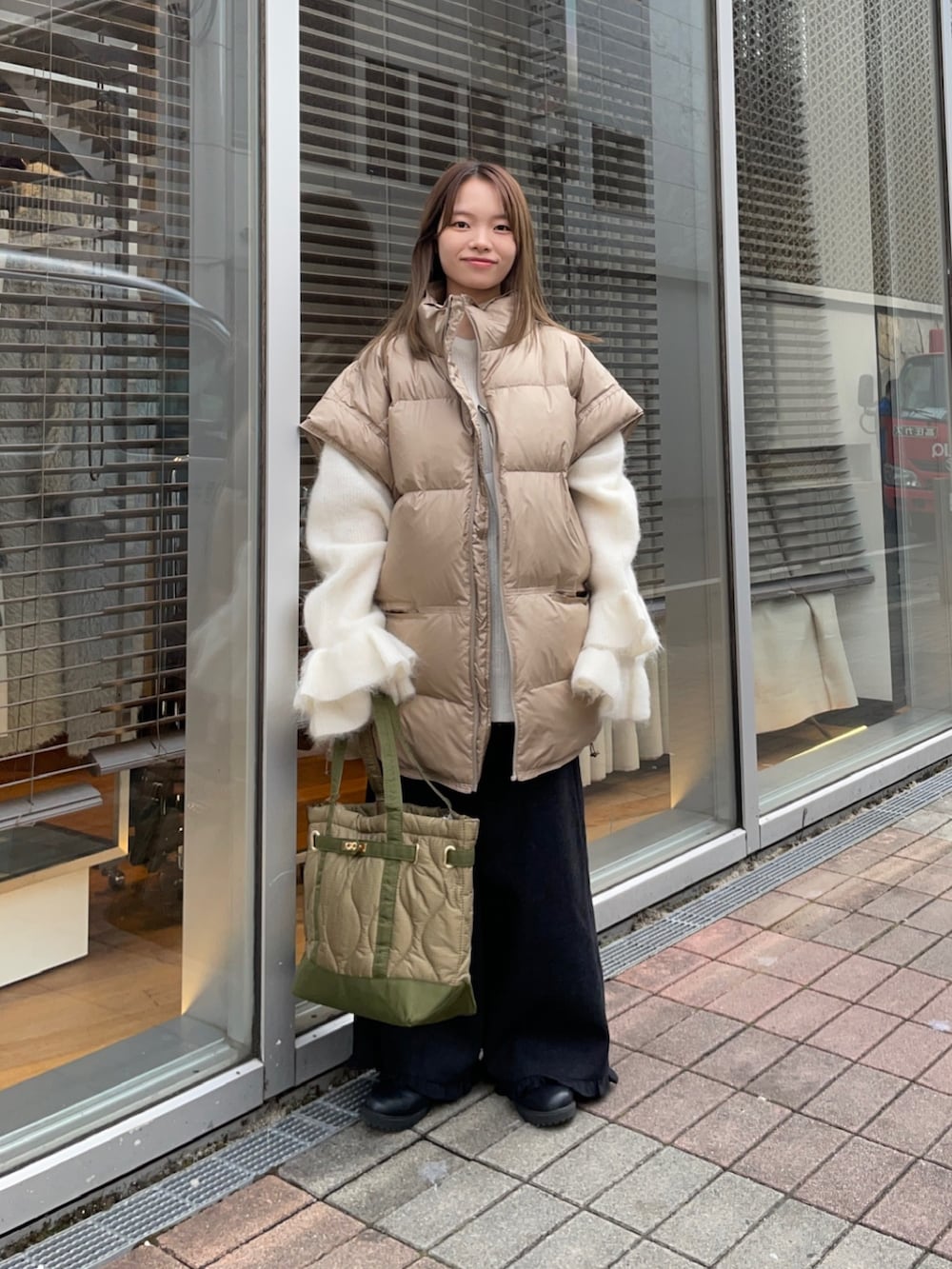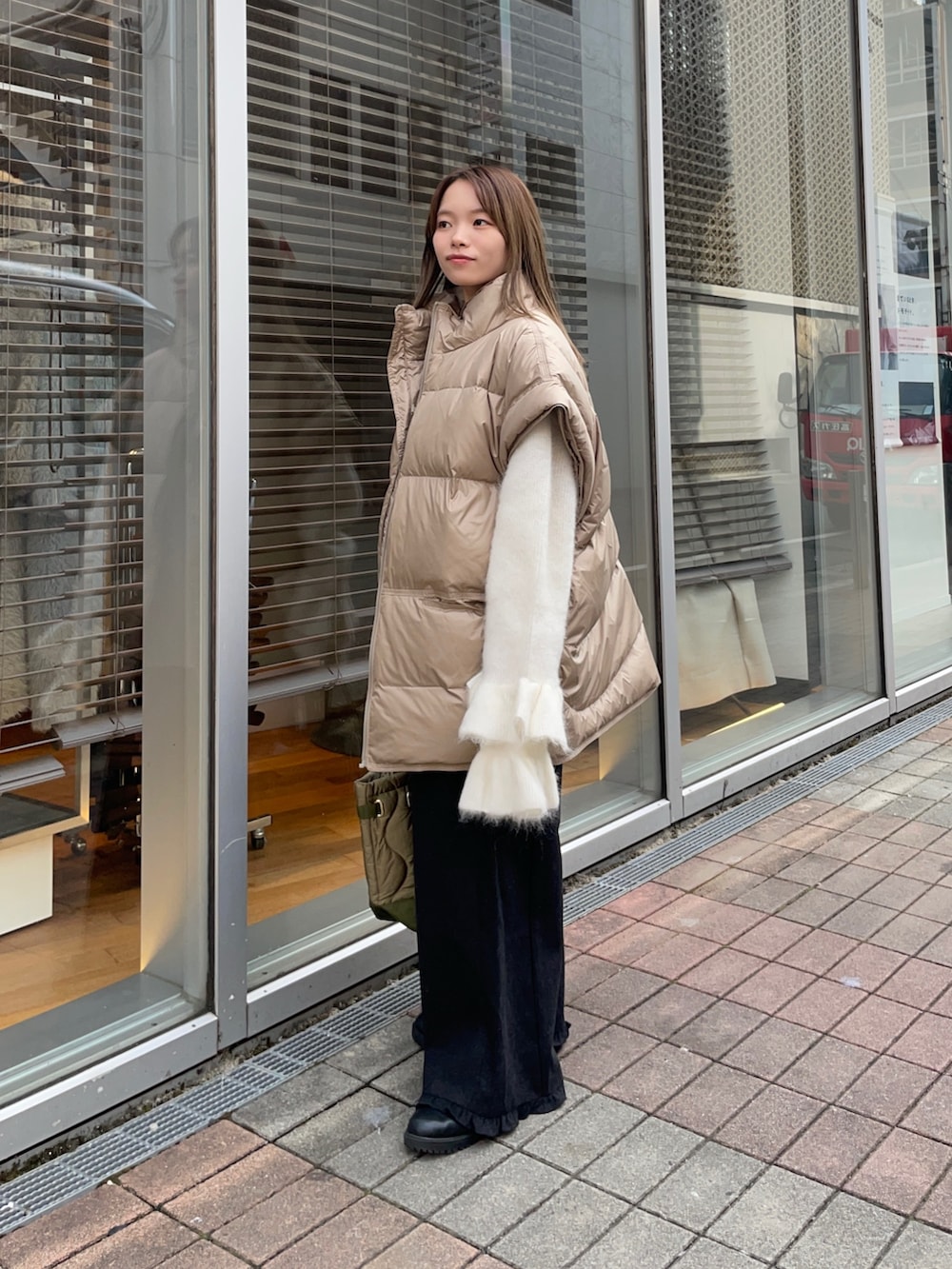 ダウンベストはリバーシブルでも使えるアレンジが楽しめるダウンです!そしてとっても軽く、ダウン90%で防寒性も高いボリューム感のあるアイテムです✨裾が絞れるデザインなのでバランス見て調節が可能です!