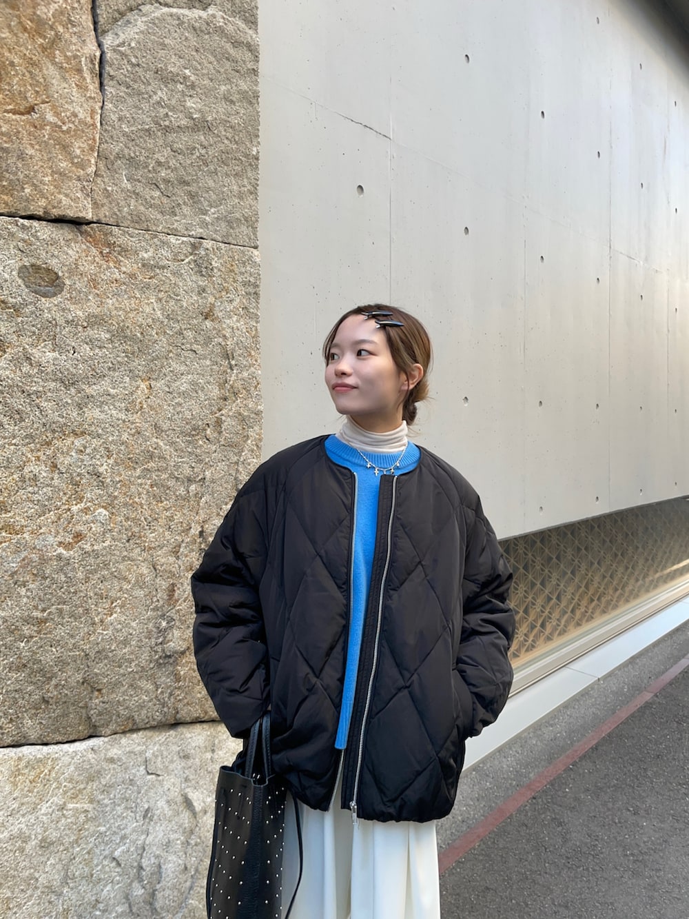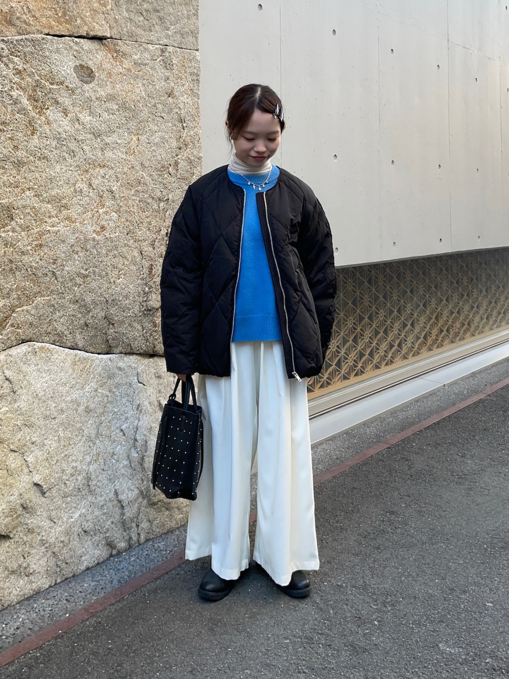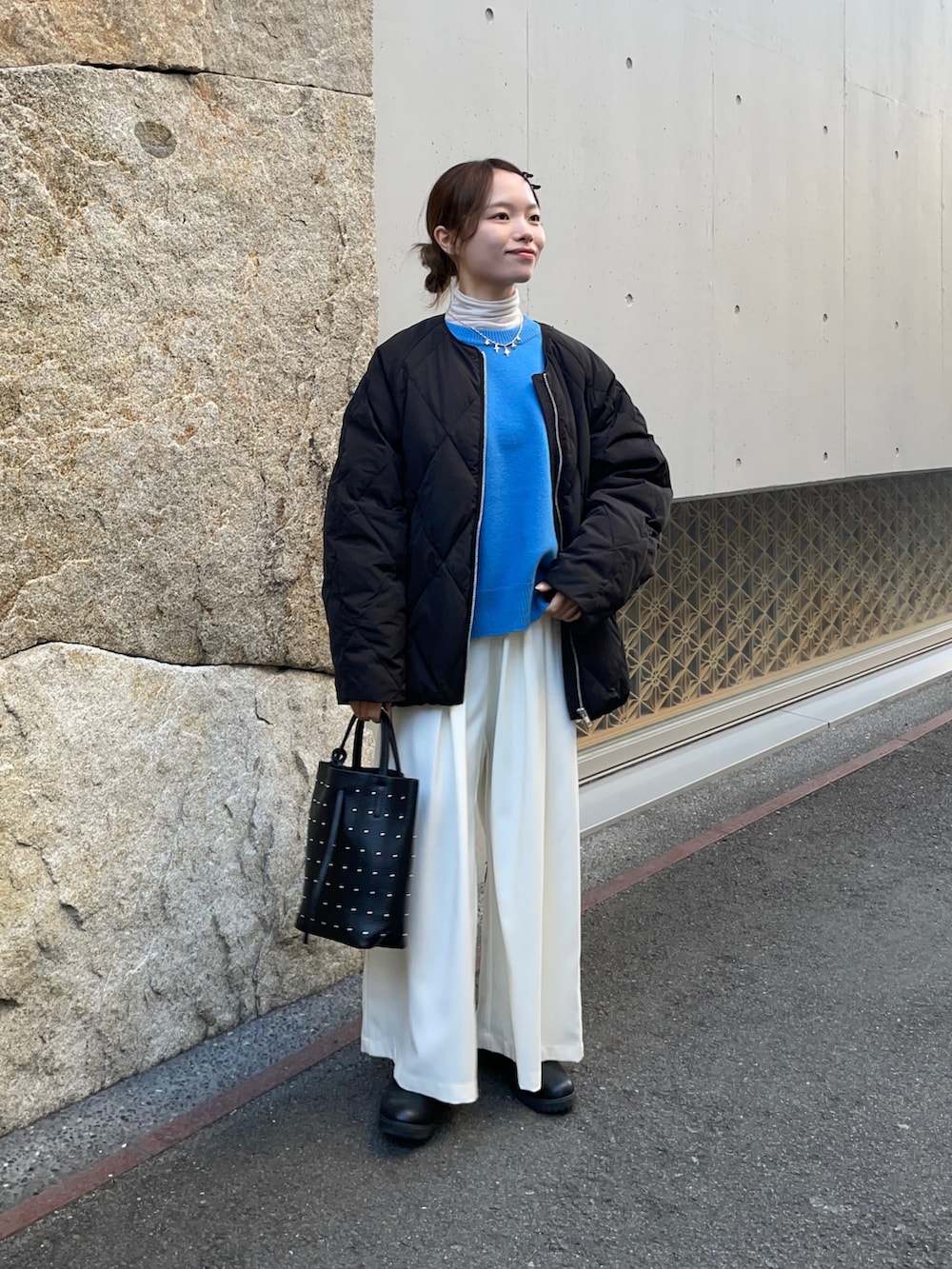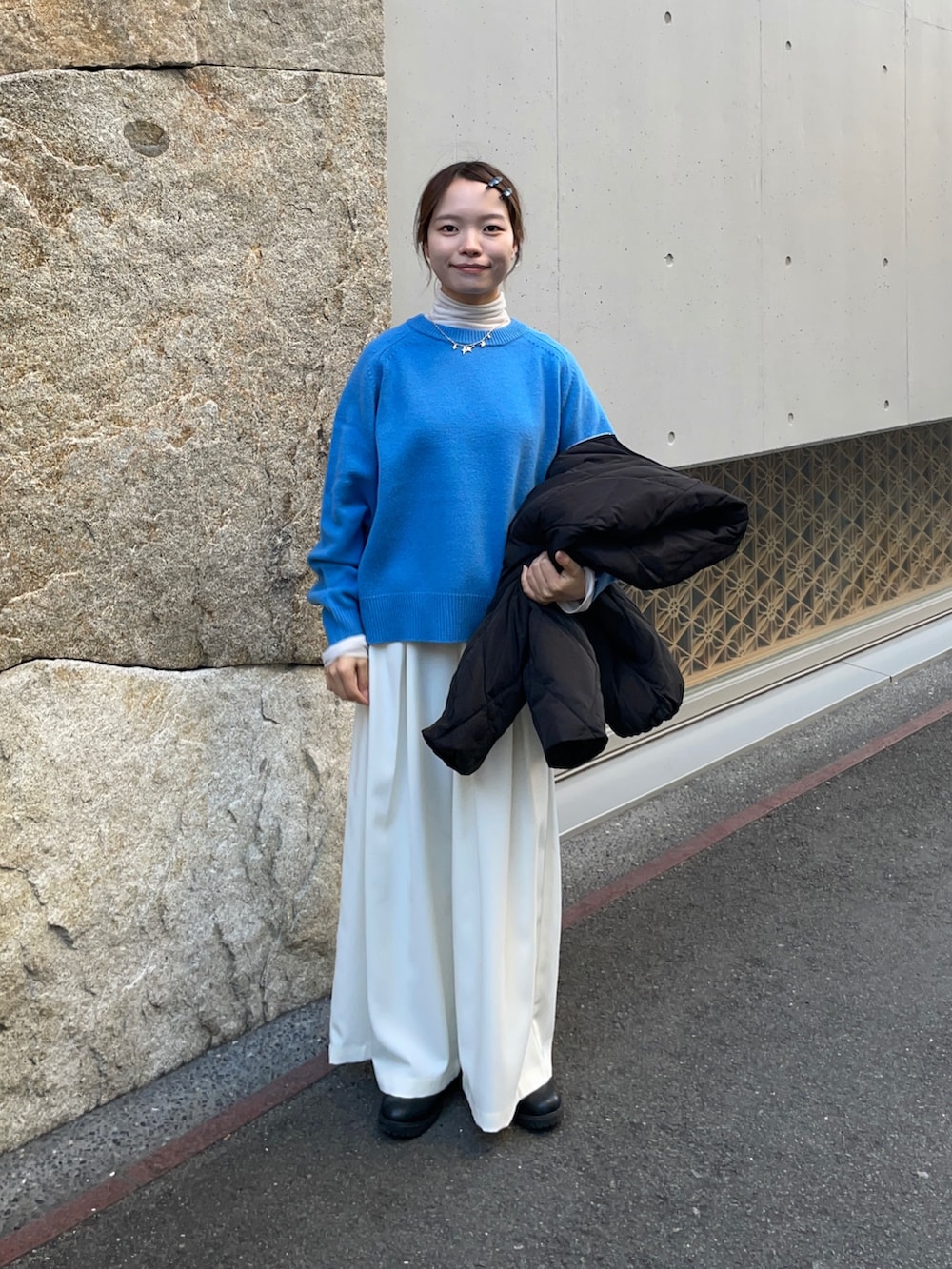 中のニットはパキッとブルーで、爽やかな印象を与えてくれます!洗えるニットなので、手入れも楽ちん✨✨着丈もちょど良いのでパンツやスカートとも何でも合うと思います!