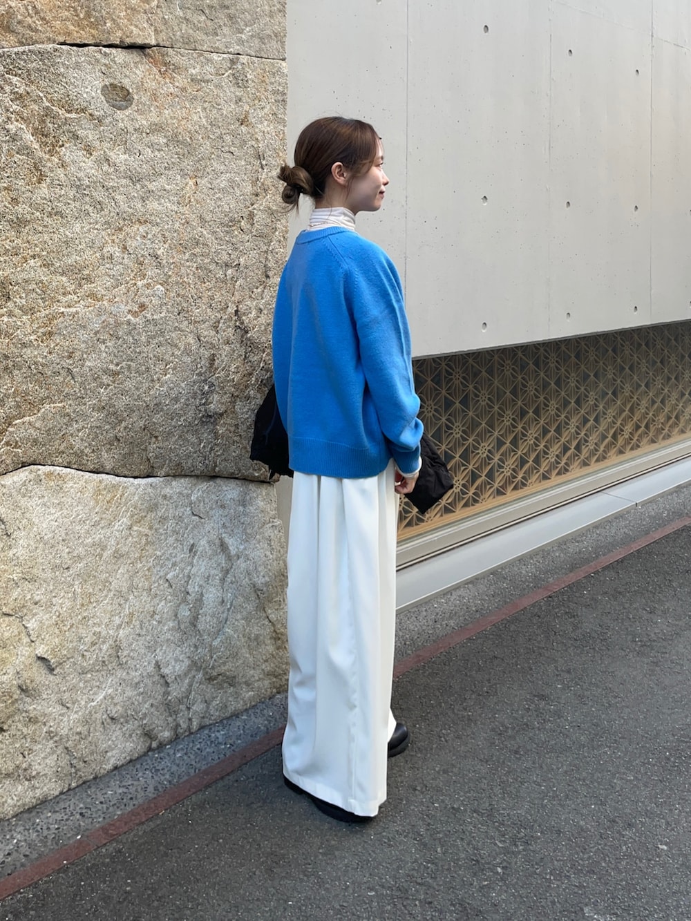 パンツは、柔らかな素材のタックワイドパンツで、形がとっても綺麗で履き心地も気持ちよくオススメです✨後ろがゴム仕様になってるウエスト部分で、ノンストレスな履き心地です!私の身長でウエスト2回折って履いているので、低身長はお直しが必要です!