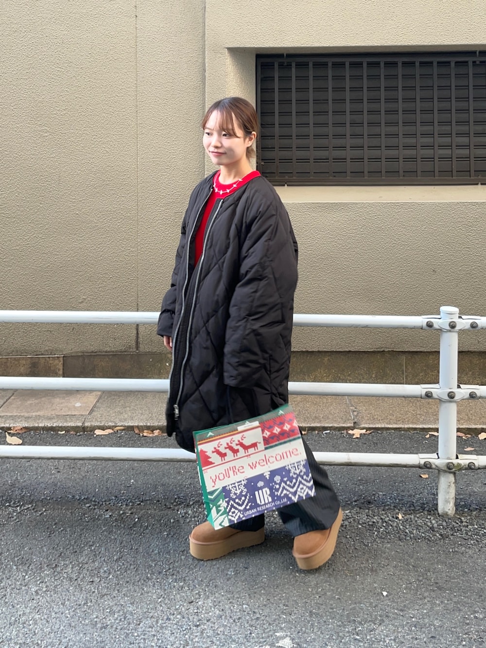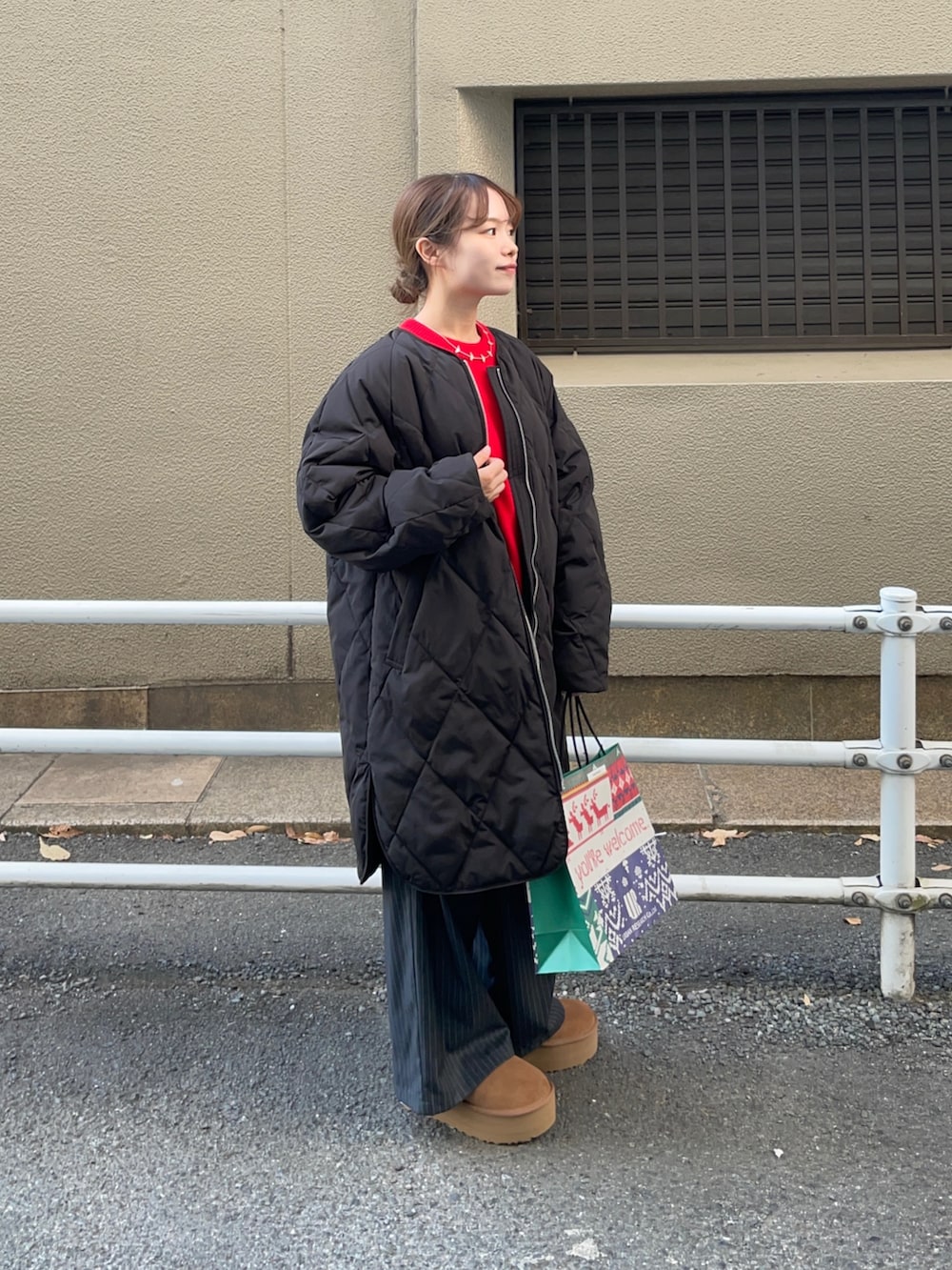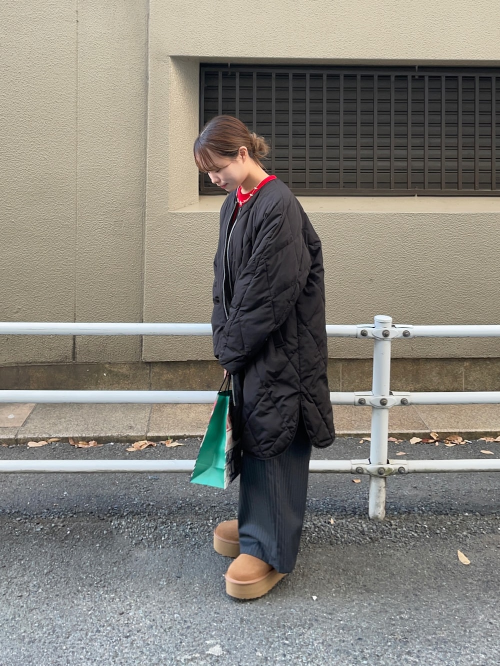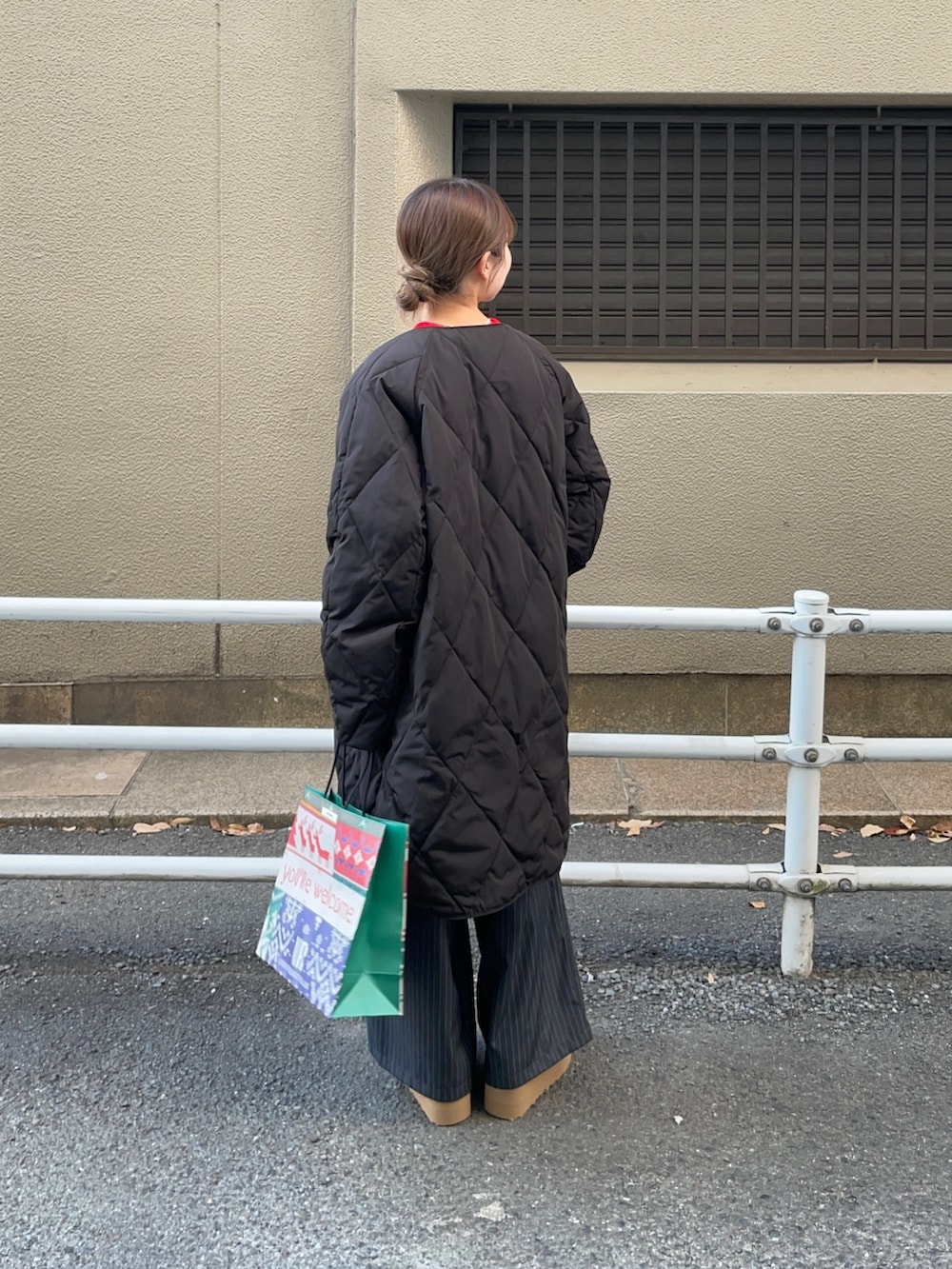 ダウンはキルティングロングダウンコートで、とっても軽くゆったりとし着丈で中にたくさん着込めます!首元はスッキリしており、太めなマフラーも巻けます!カジュアルすぎないダウンでキレイめとしても使えますよ✨