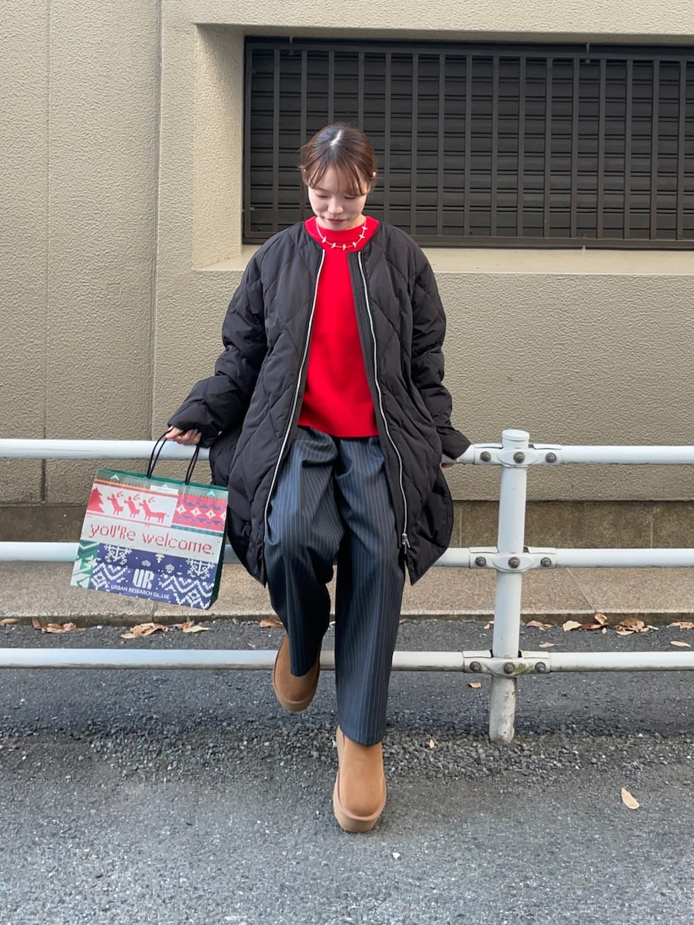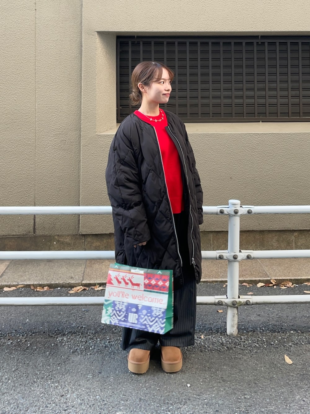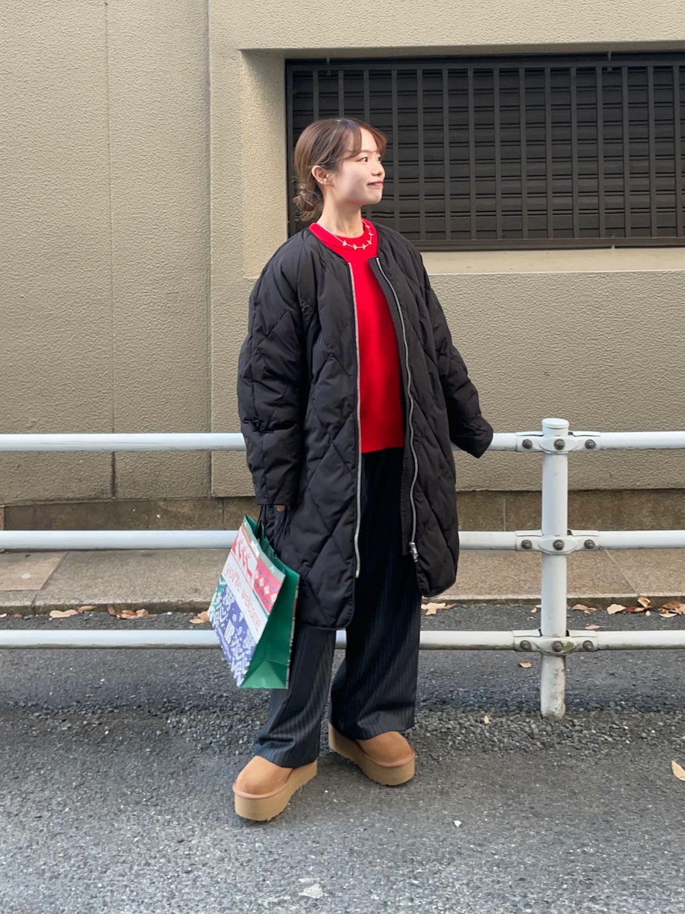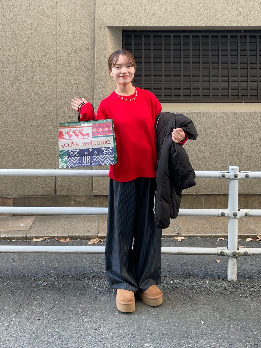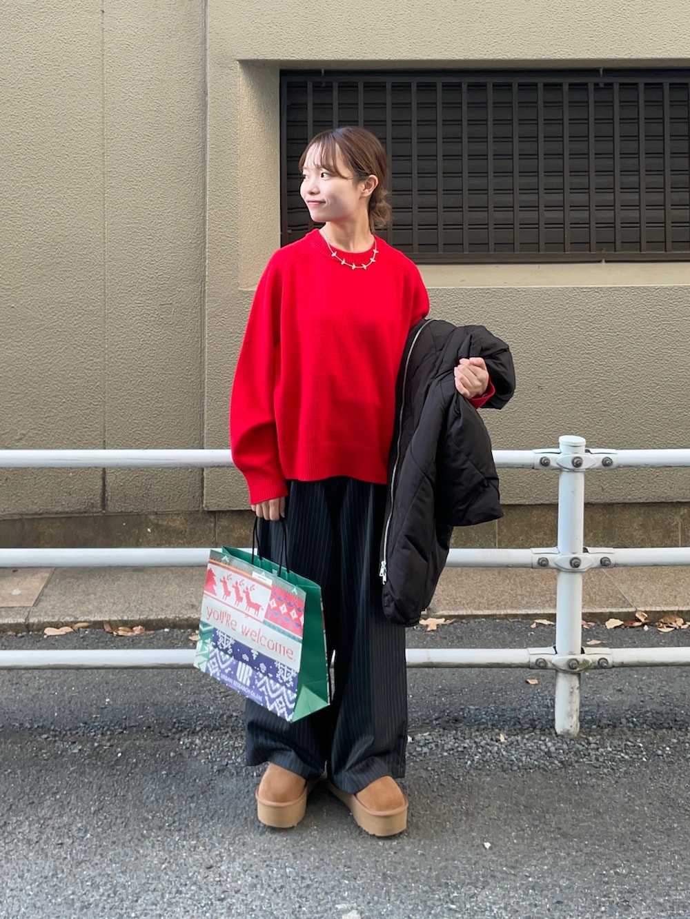 中の赤ニットは深めな色味が挑戦しやすいニットで、フワフワな着心地の肌触りの良いアイテムです!丈感も短すぎず長すぎないので、低身長でもバランスよく着ていただけます!