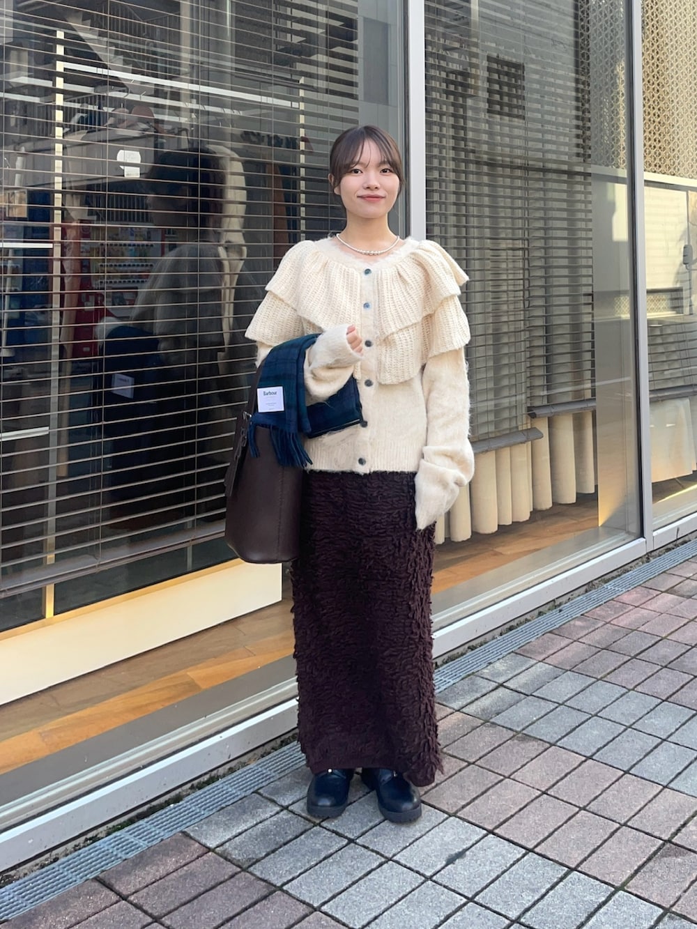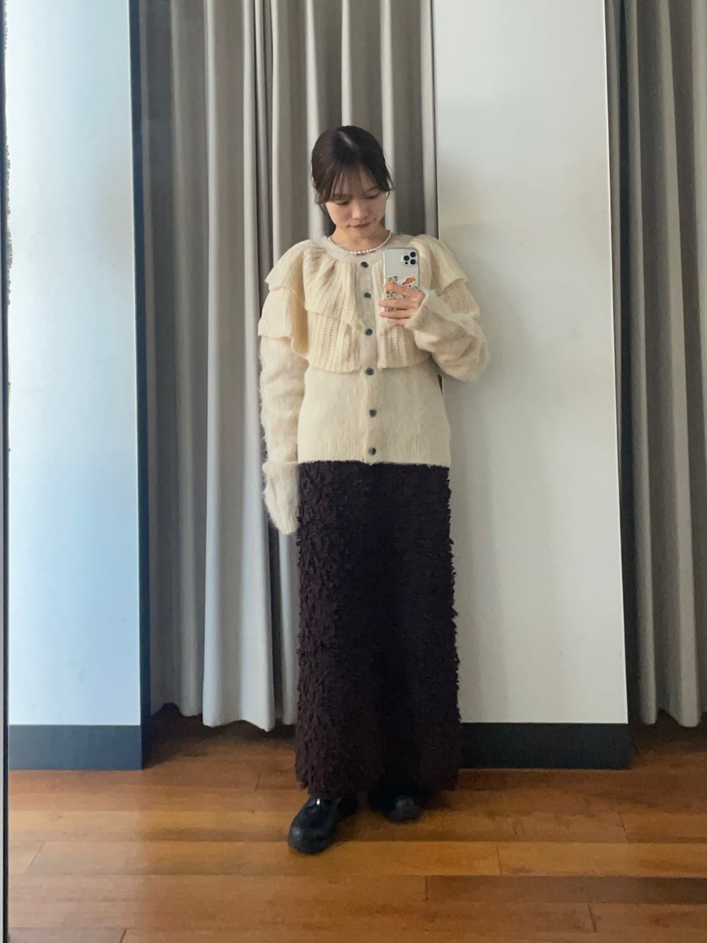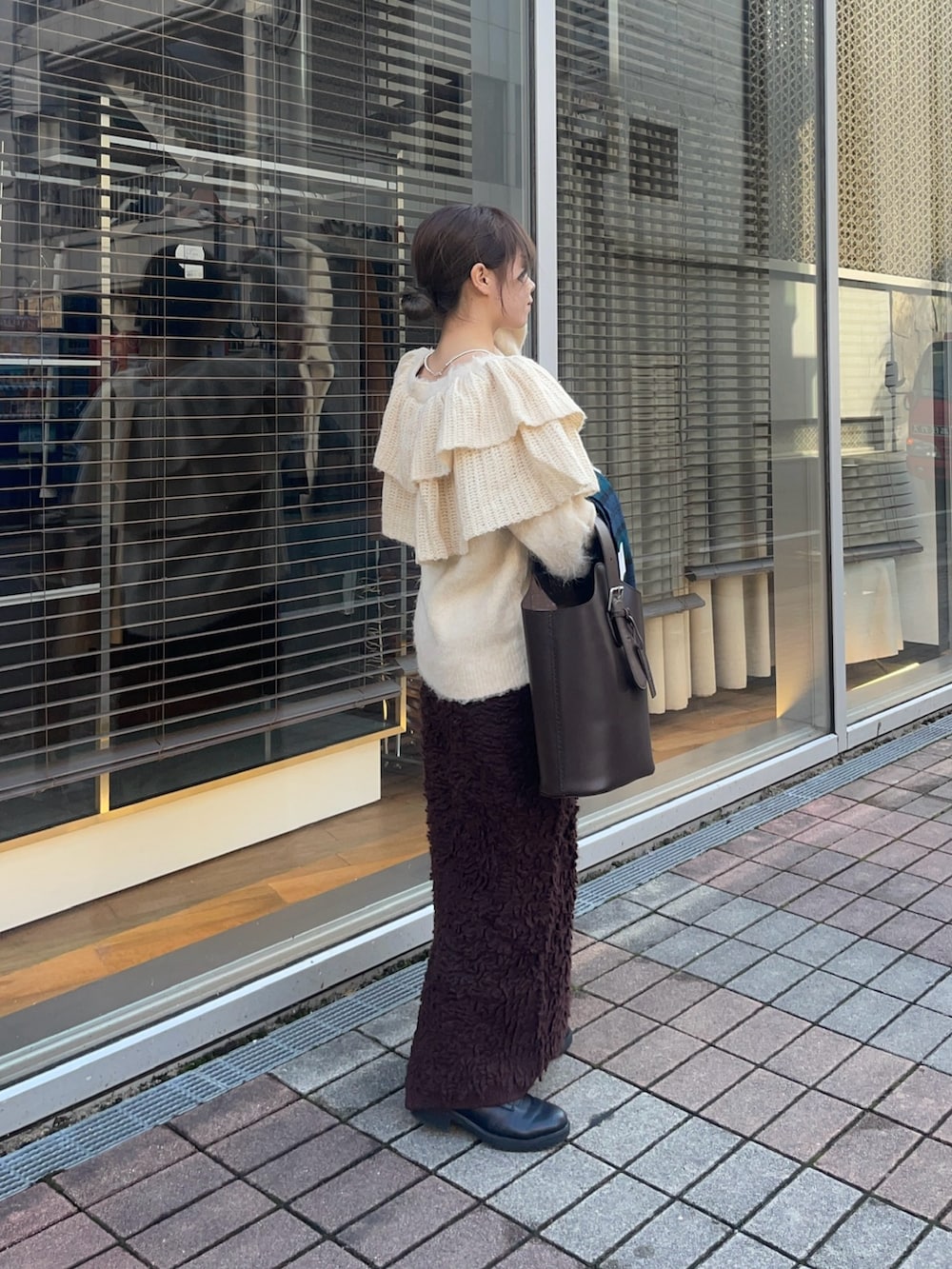 スカートはウエストゴムの楽ちんモコモコスカートです!シルエットはストレートなのでスッキリ見せてくれて、広がりすぎなかったです!私の身長で1回ウエスト折っているので、低身長は曲げて履くことになるかもしれません!