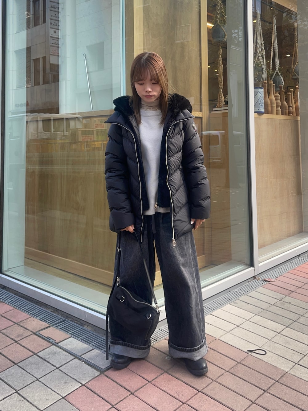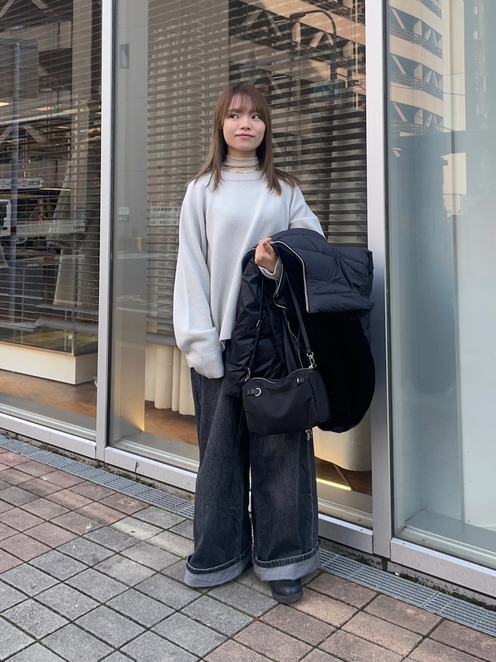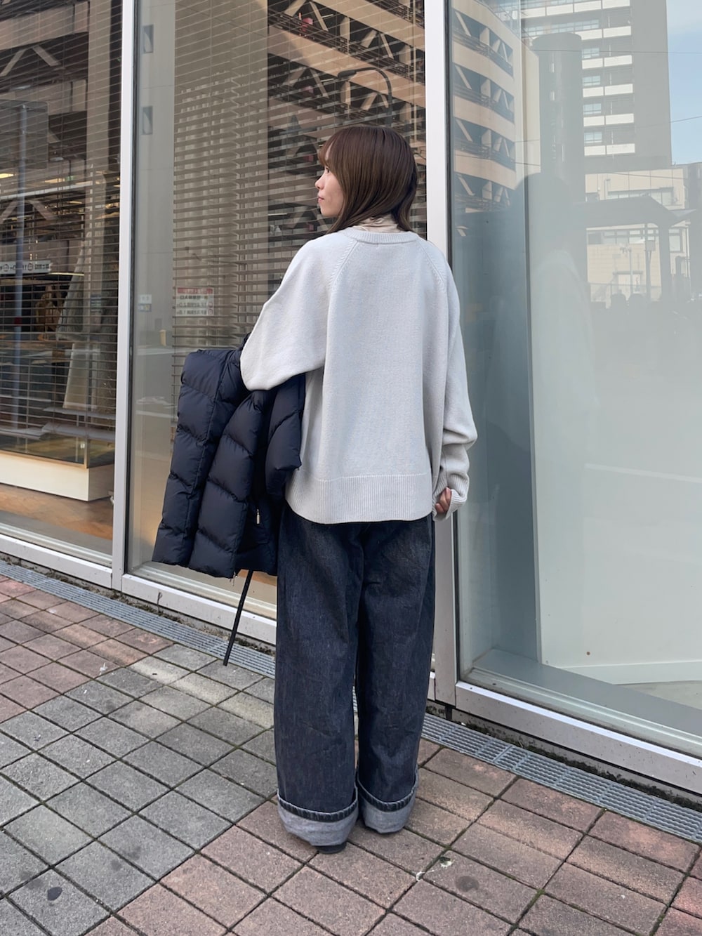 中のニットは、カシミヤクルーネックニットで、ゆったりとしたルーズな着丈がどんな方にも合わせていただきやすいアイテムです!着心地も良く薄いのに軽くて暖かいです!