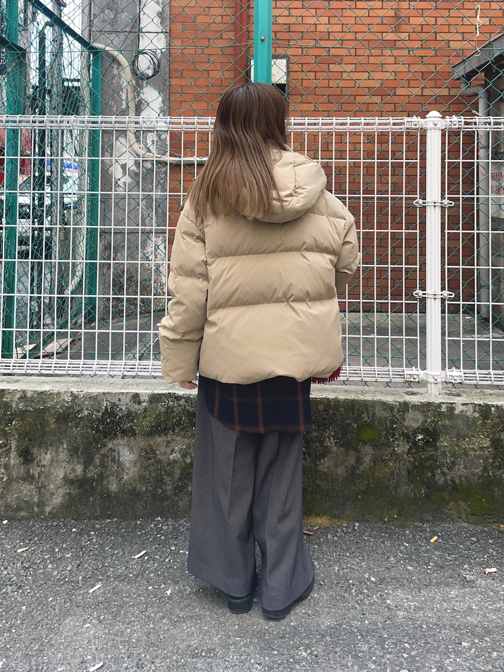 羽織のダウンはとっても軽くて柔らかく、フードが外せるデザインのアイテムです!サイズ展開もあり、小さい方を着てみました!金のジッパーやボタンによって、カジュアルなダウンのイメージから、キレイめにもお使い頂けるようになっております!