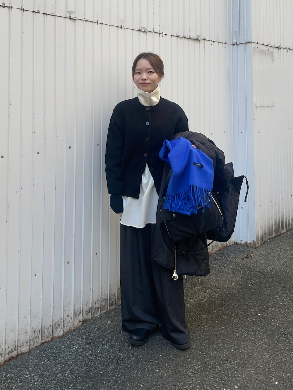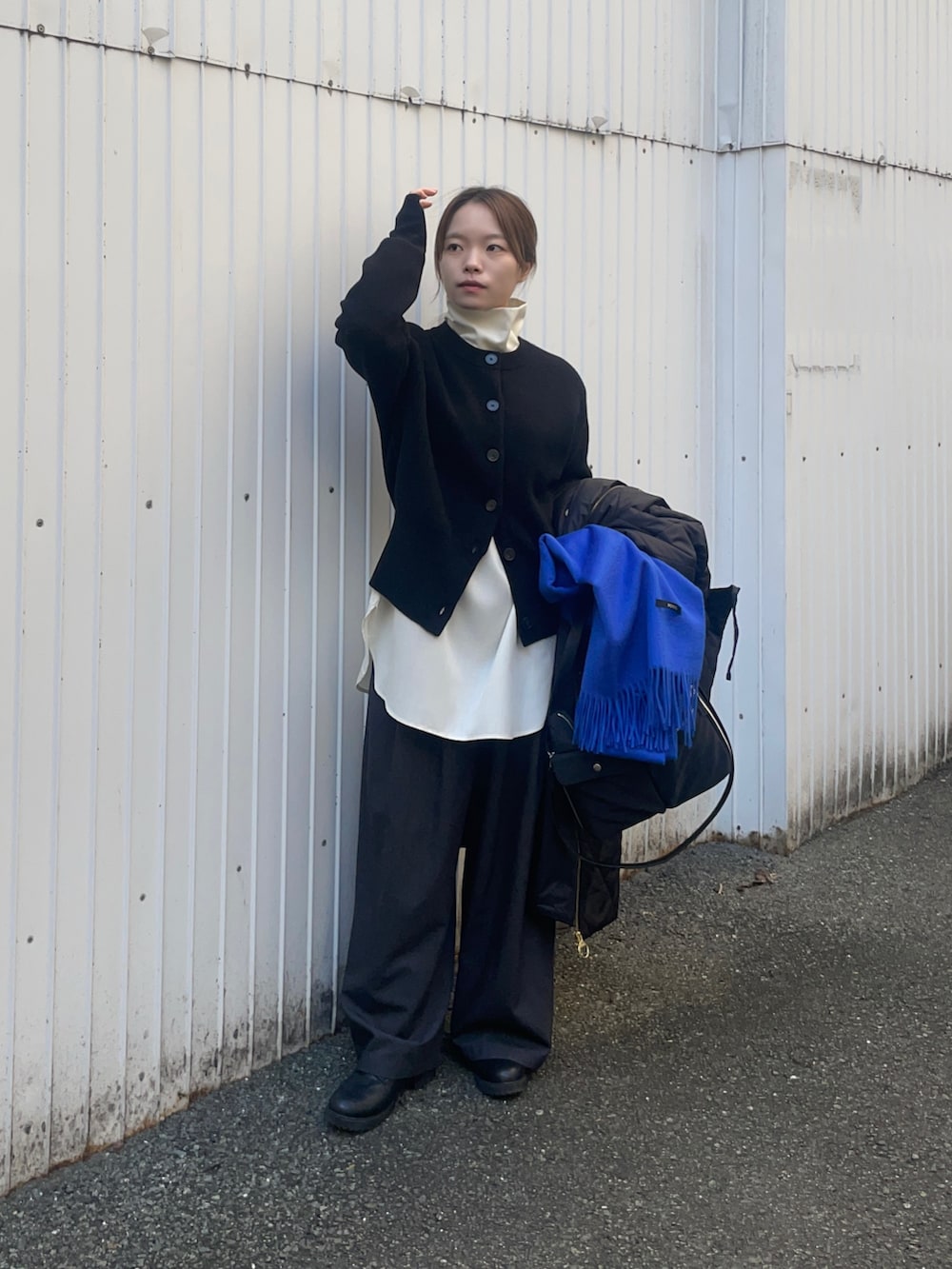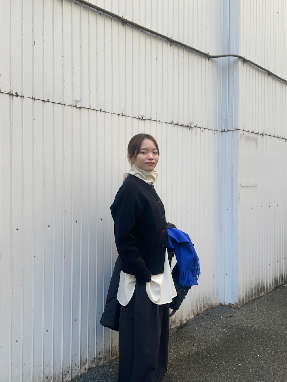 中はシャツにカーディガンを重ね着して合わせてみました!カーディガンは、ウールとカシミヤでできた暖か素材で、肩にパットがついてることで、キレイめにも着れる羽織です!パットは取り外せます!ボタンを外せば調節できるので、これからも長くお使いいただけます!