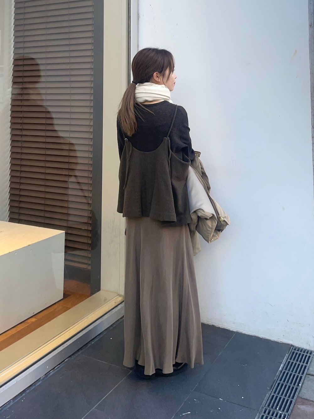 スカートはキュプラスカートです!光沢感のある質感でキレイめはもちろん、スニーカー合わせのカジュアルにも合わせていただけるアイテムです!私の背丈でウエスト折って履いてます!