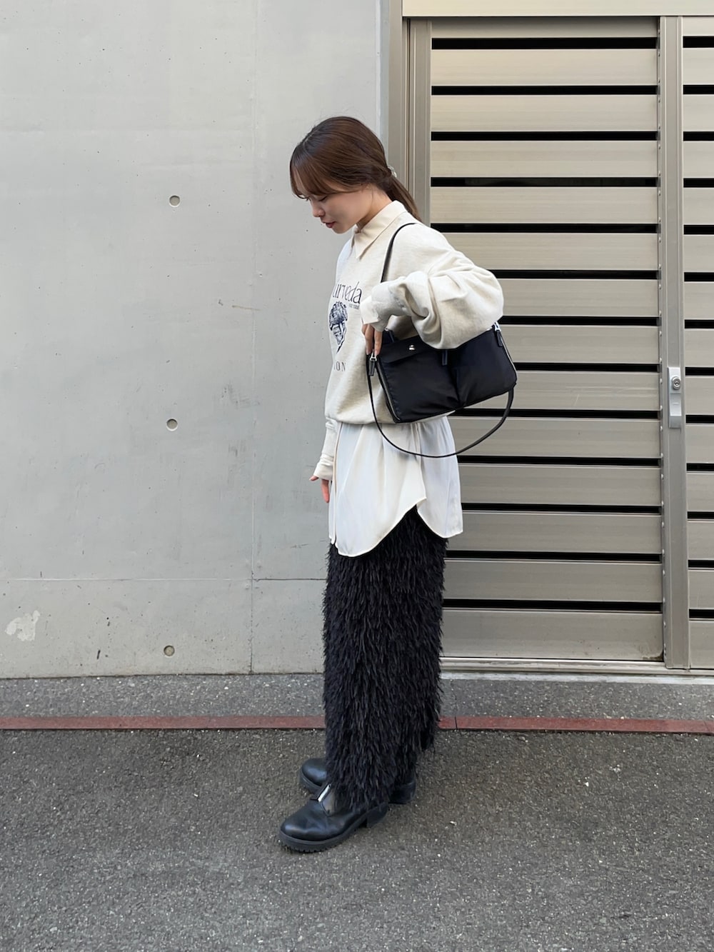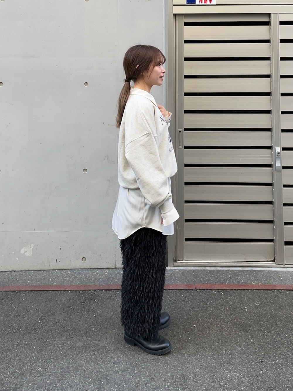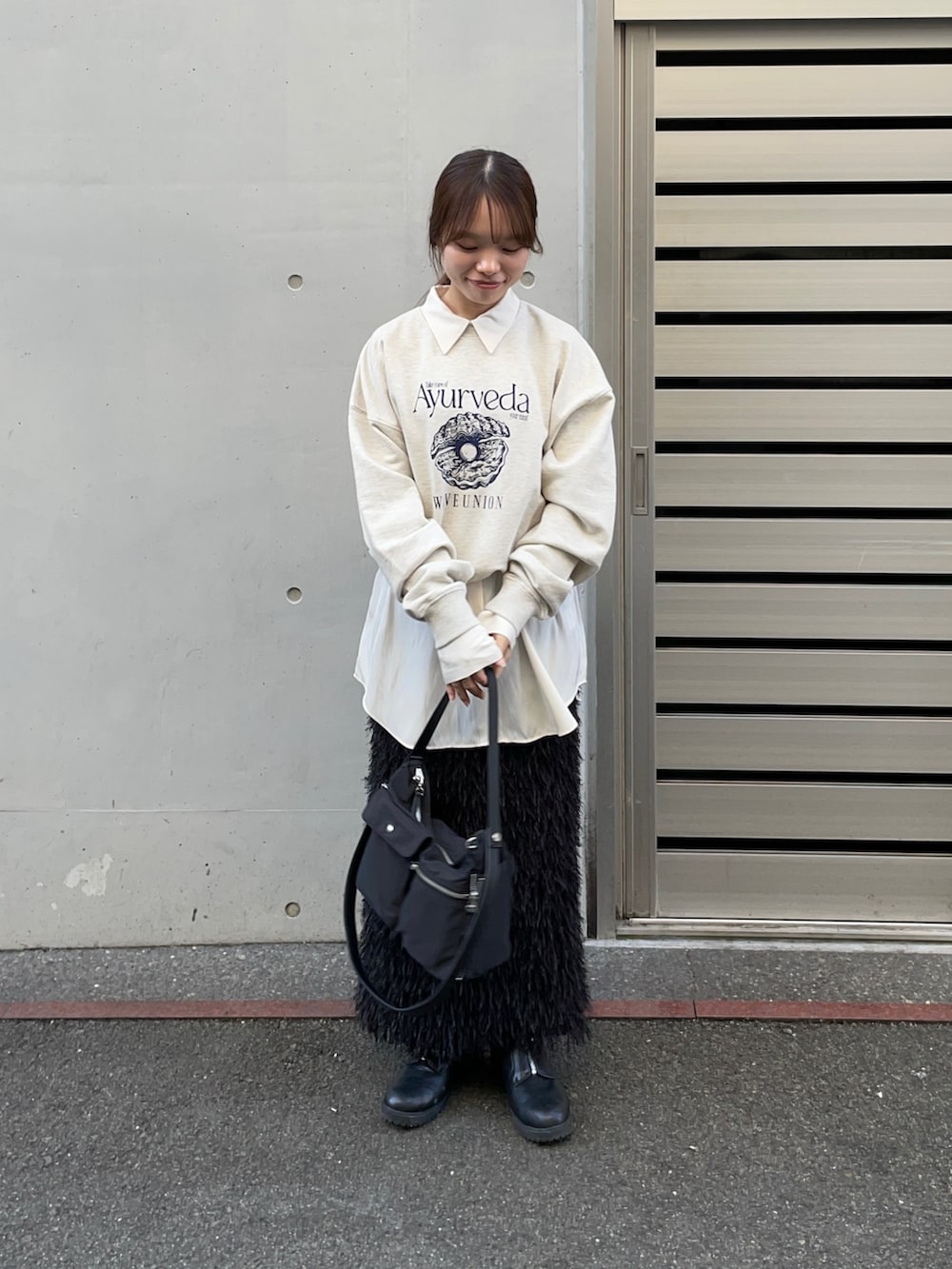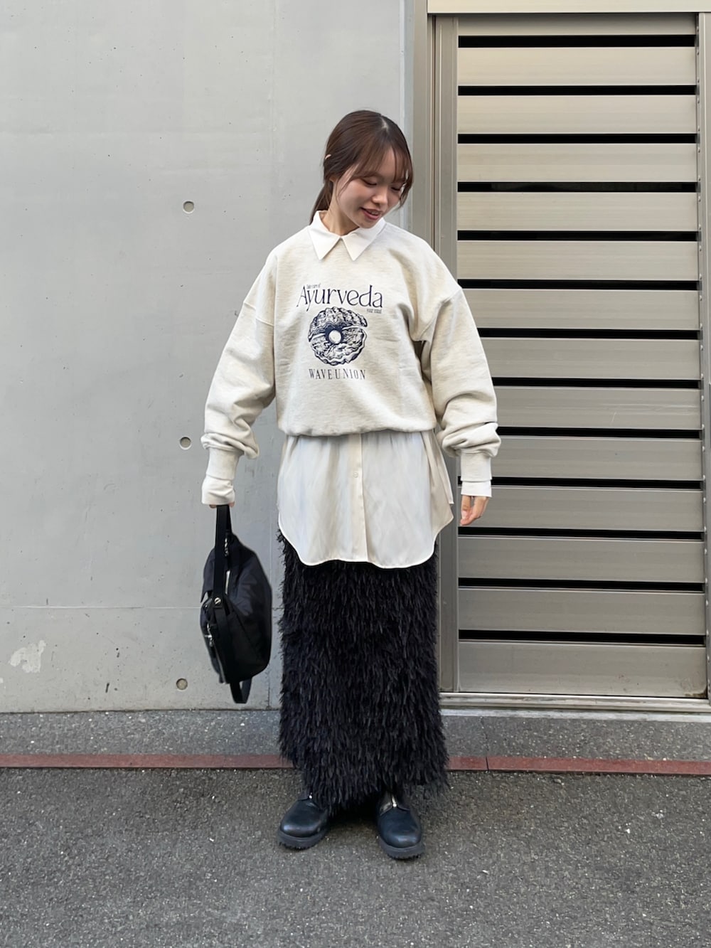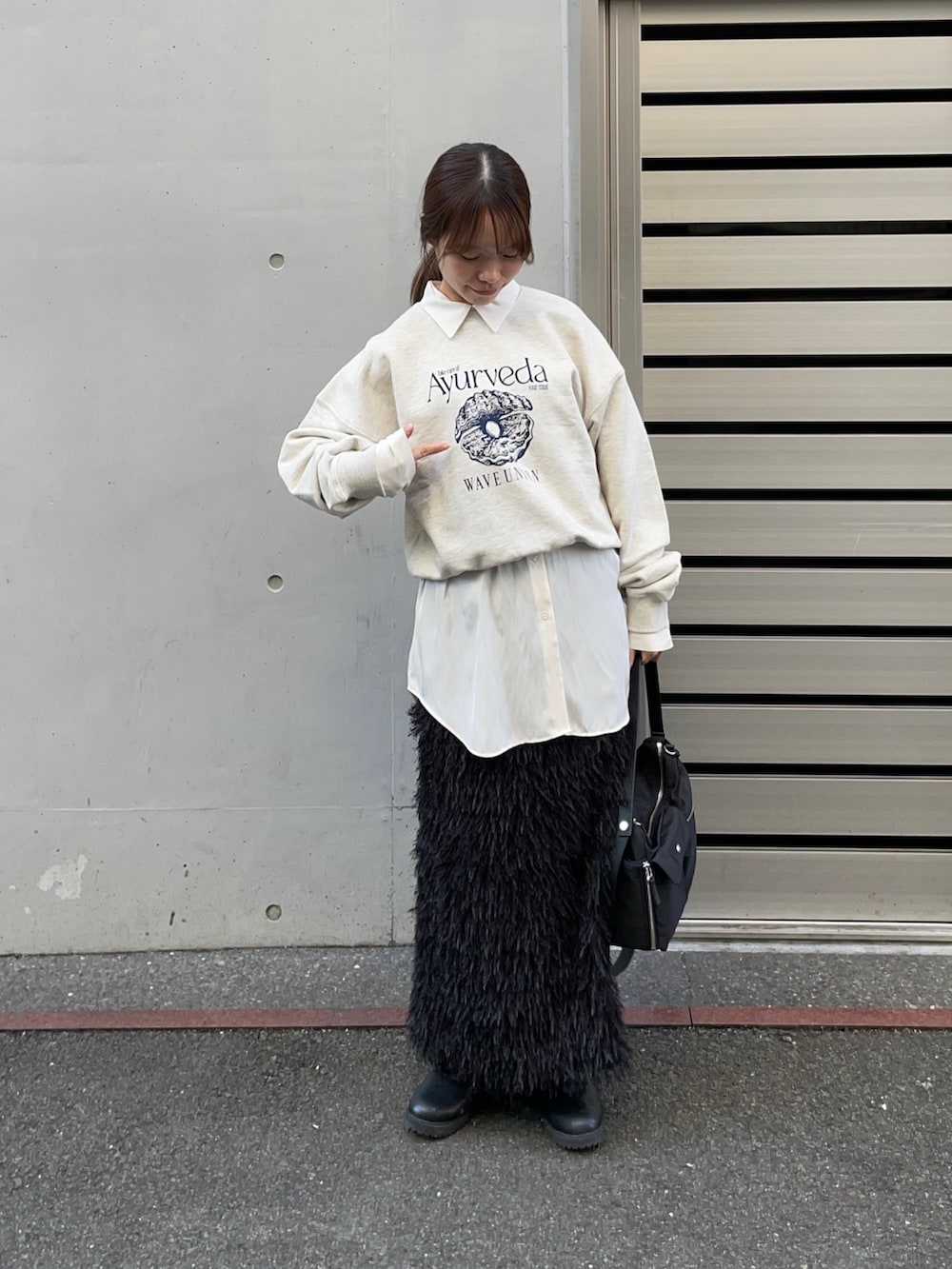 トップスはさらっとサテンのような素材で落ち感のあるシャツと重ね着してみました!スウェットはWAVEUNIONオリジナルのプリントを載せた別注アイテムです!低身長に嬉しいスッキリとした着丈に、韓国っぽロゴが可愛いです♡
