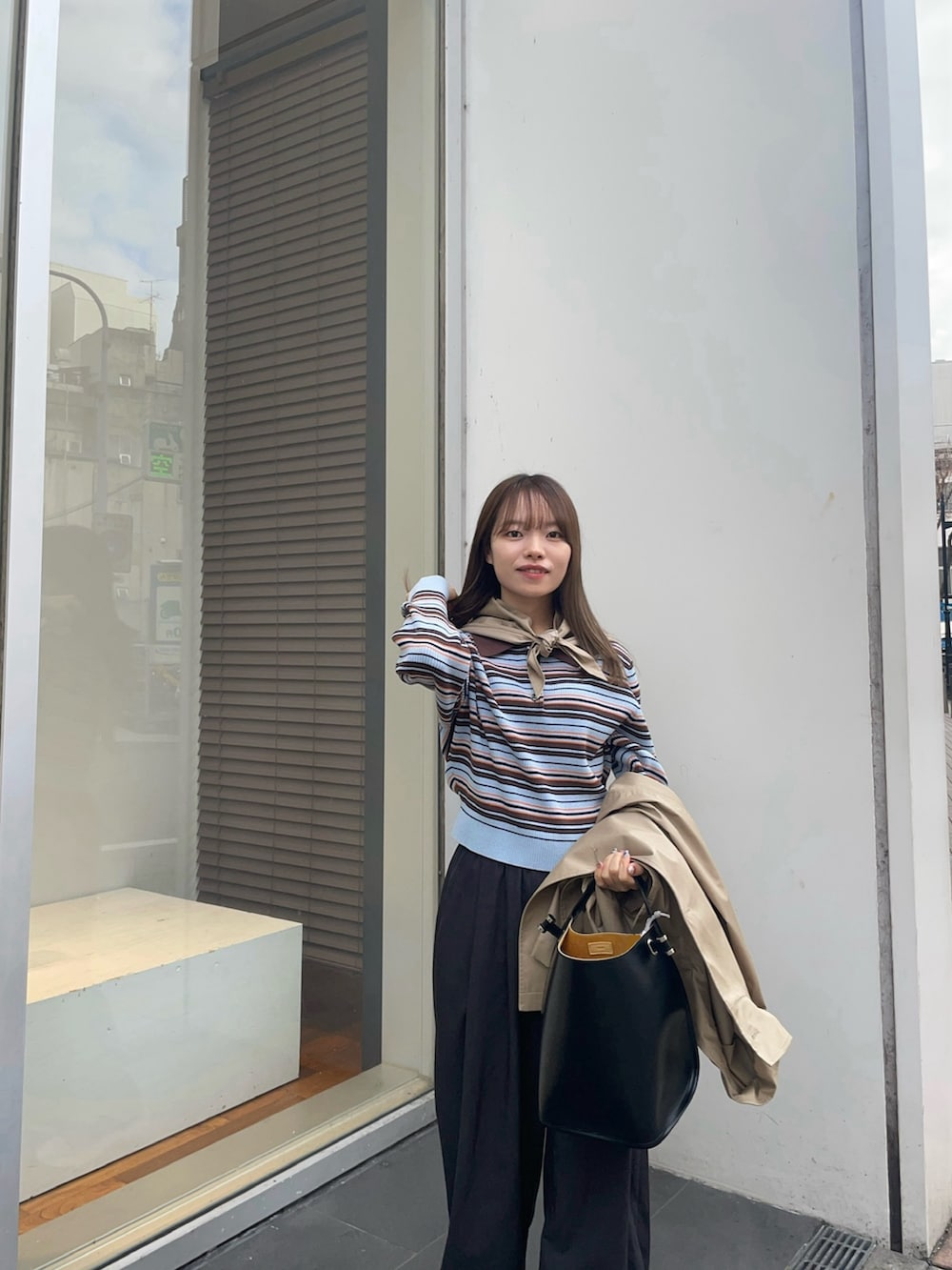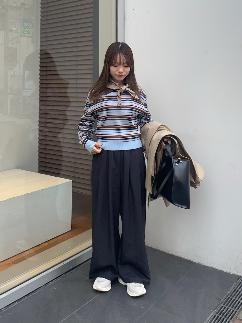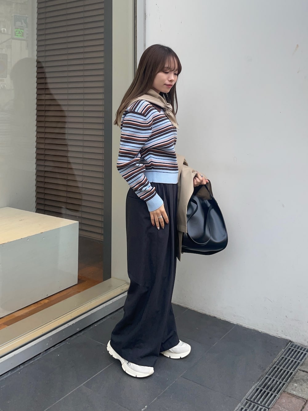 パンツはリアルバイしたウール混ギャザーパンツです!ワイドだけど、形がキレイであまり広がりすぎないです!今セールですが、薄い厚みで春先までまだまだ使えますよ!私の身長で8センチ裾上げしました!
