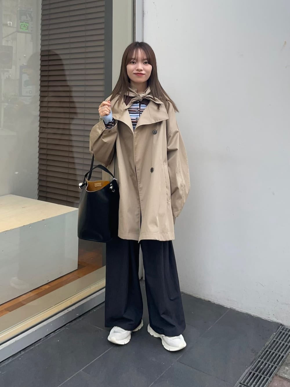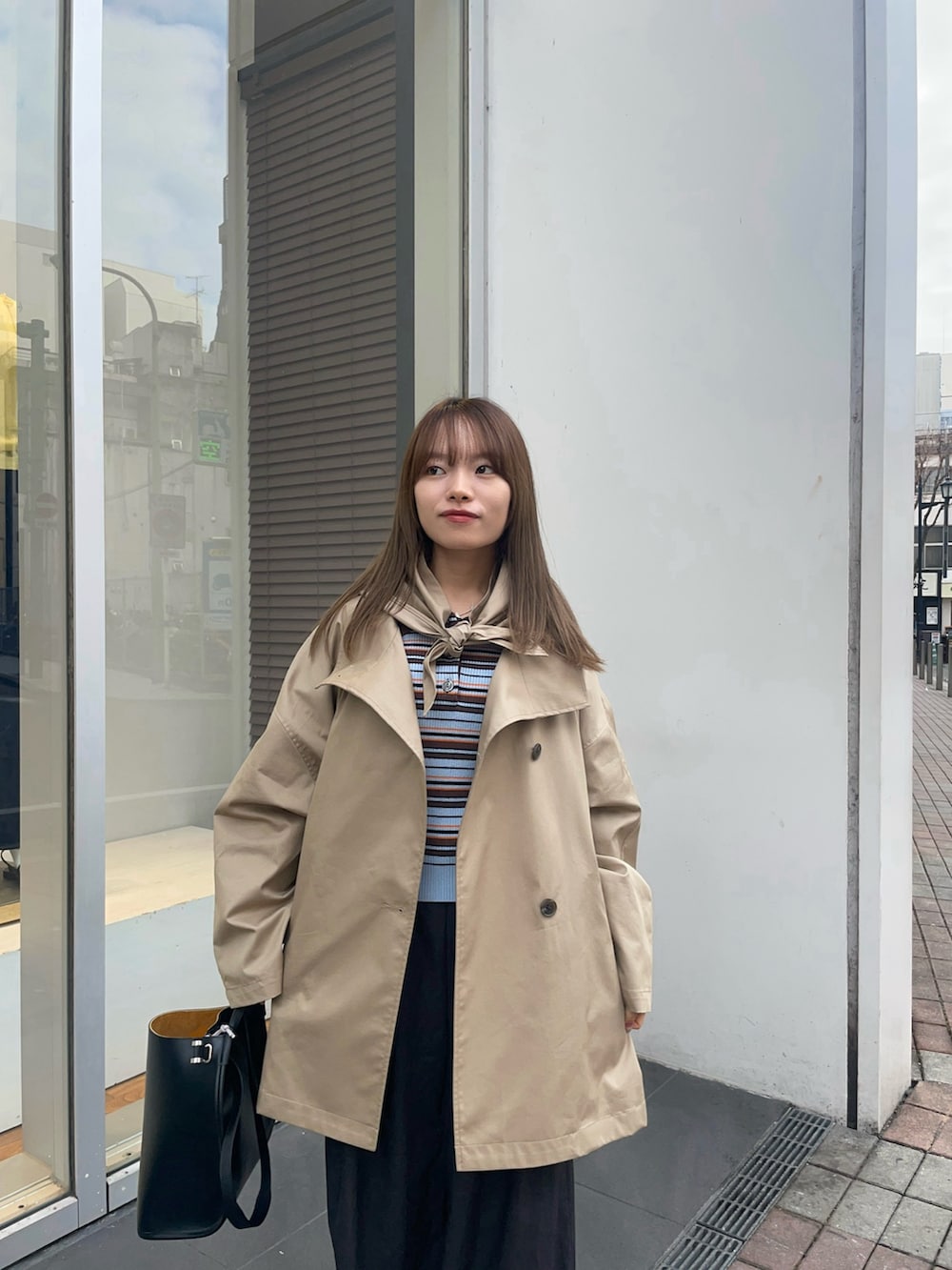 羽織はスタンドカラーミドル丈トレンチコートです!低身長にも嬉しいサイズ展開ありのアイテムです!そして撥水加工もついてる優れもの✨スカーフもついておりアレンジして楽しむこともできますよ!