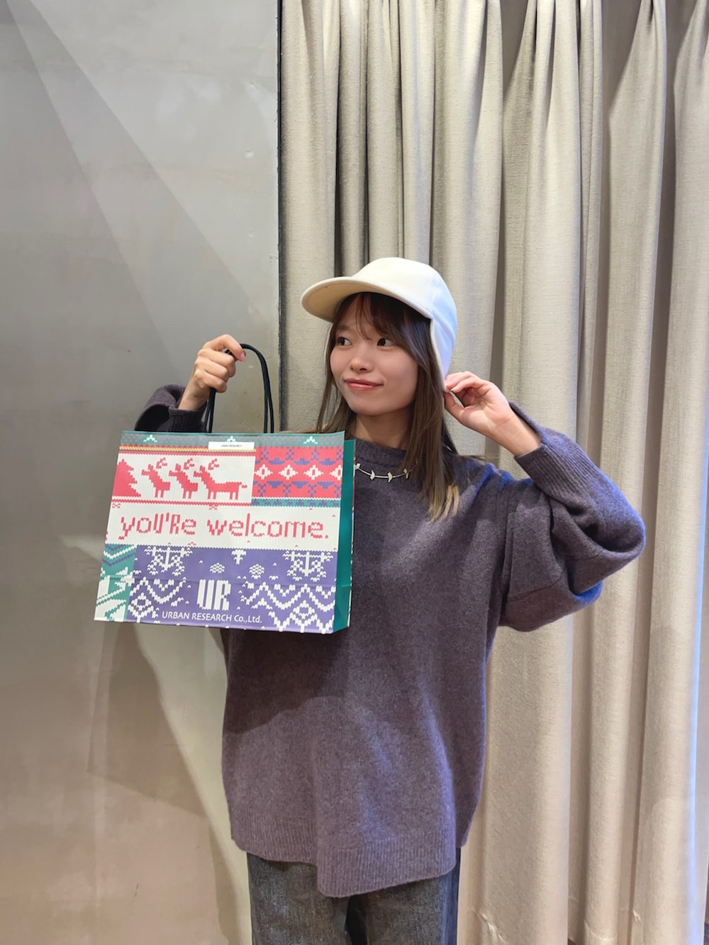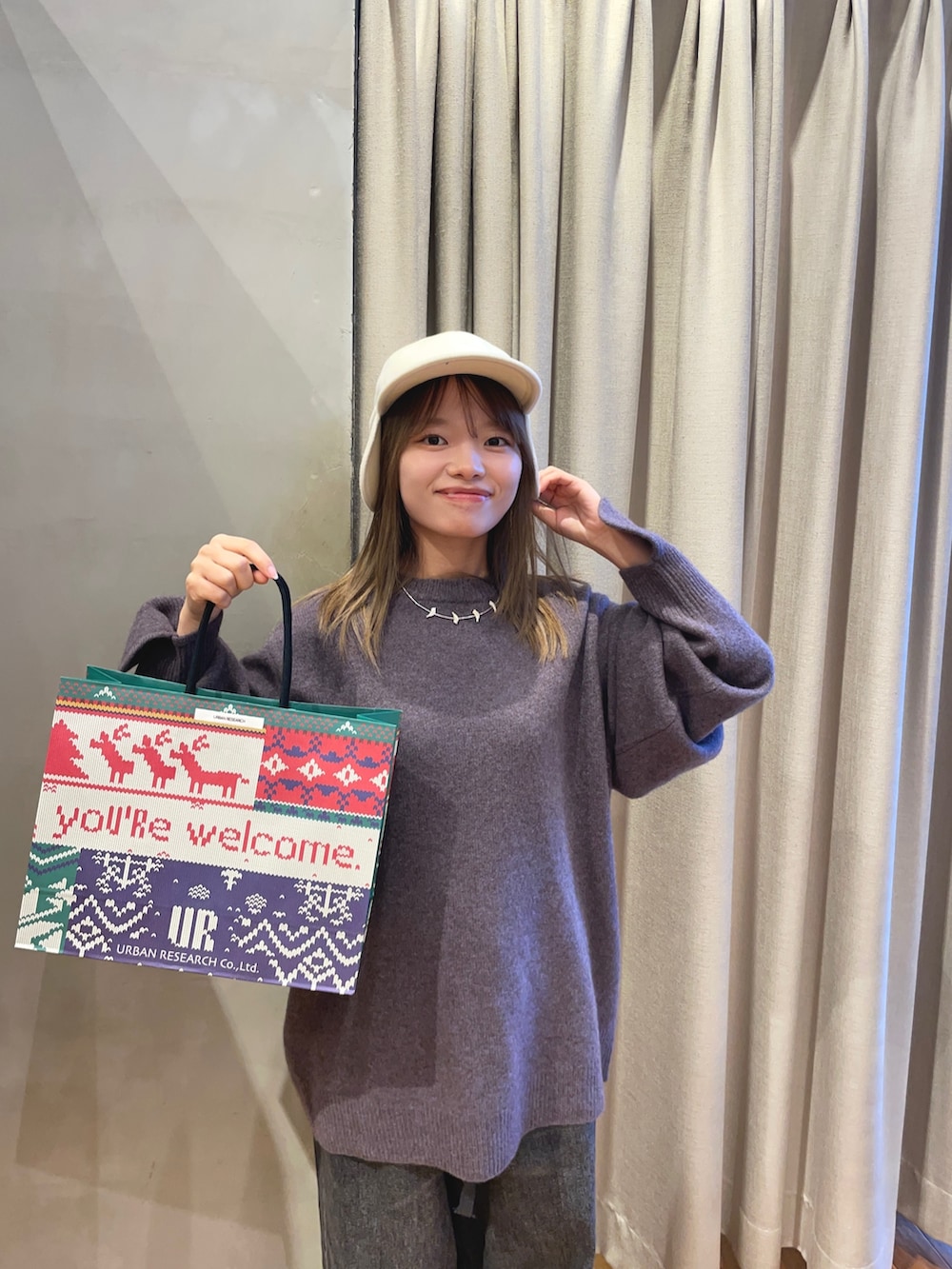 トップスに着ている紫のニットは、LAATOのアイテムで、手がアームウォーマーのようなデザインと、いろんな色味が混ざった紫でとっても可愛いです!着丈もゆったりしており、パンツアイテムやスカートにも合いますよ〜!