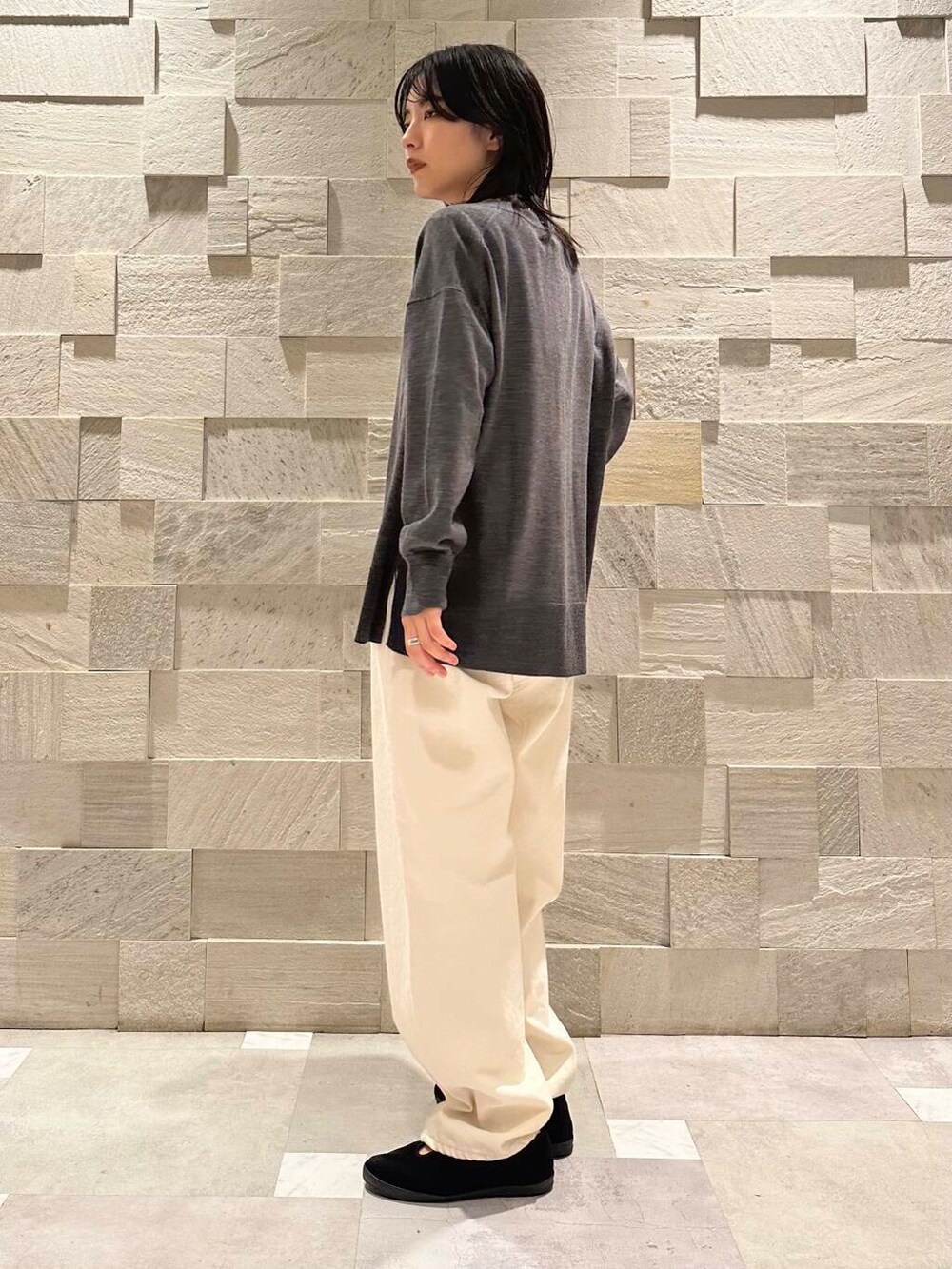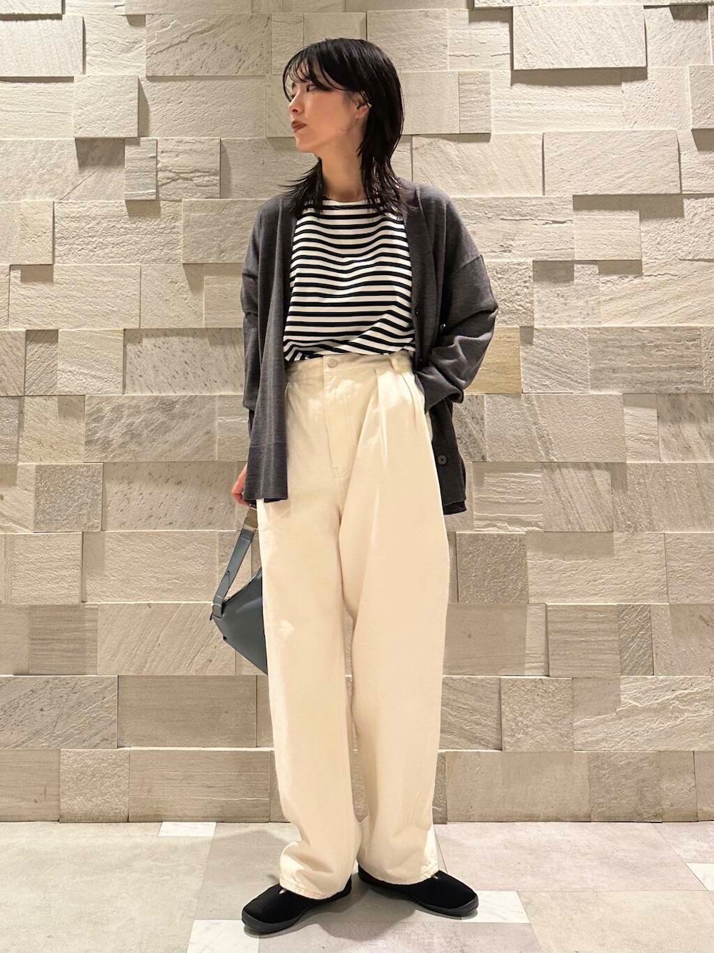 腰回りまで隠れる丈なので、さりげなく体型カバーもかない、細身のパンツでも合わせやすいバランスです。