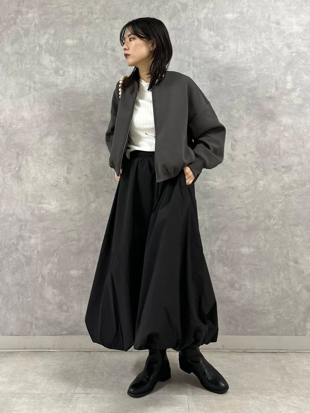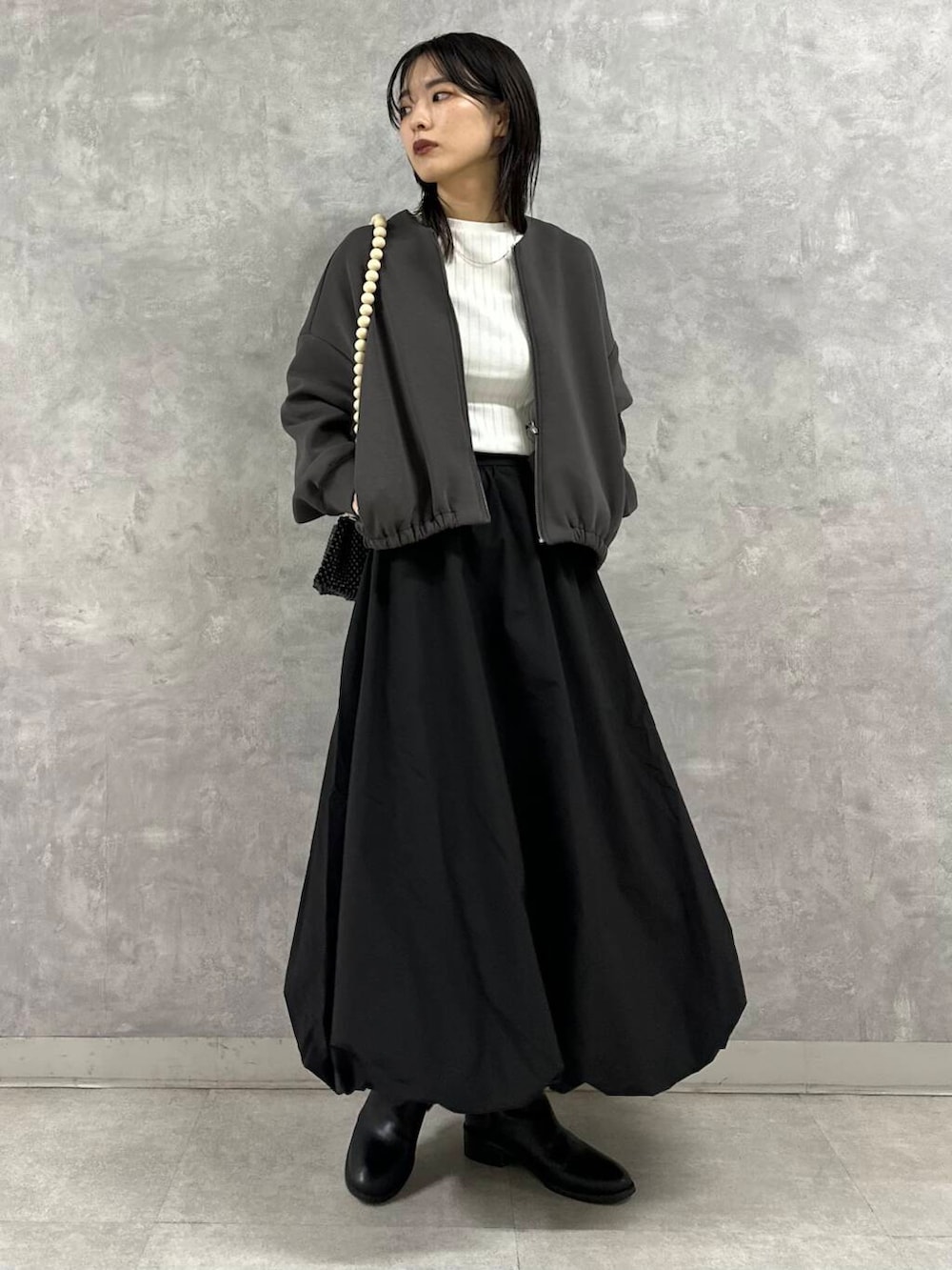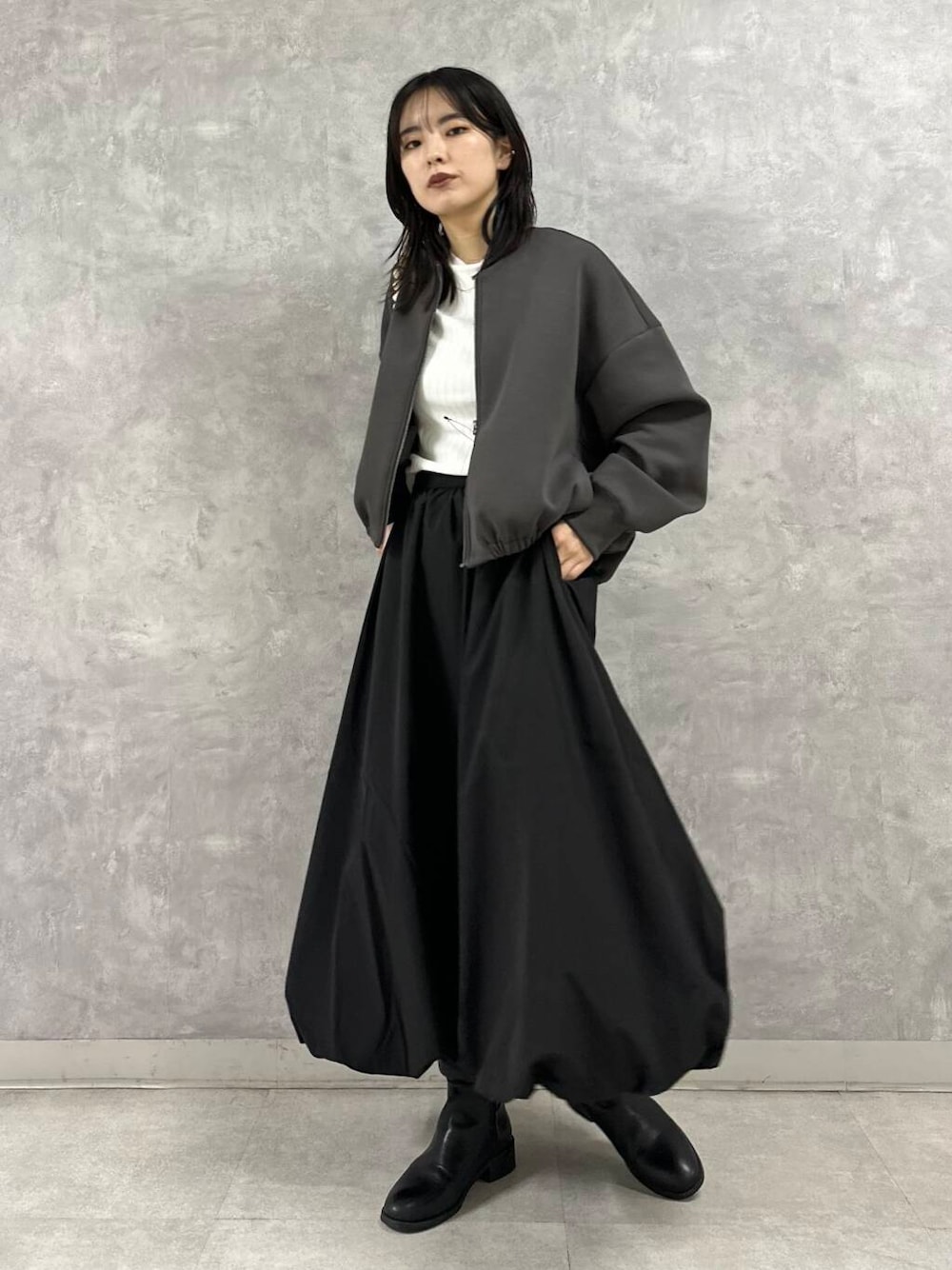 今回はジャケットの短丈を活かしてボトムはバルーンシルエットのスカートでシルエットにメリハリを。