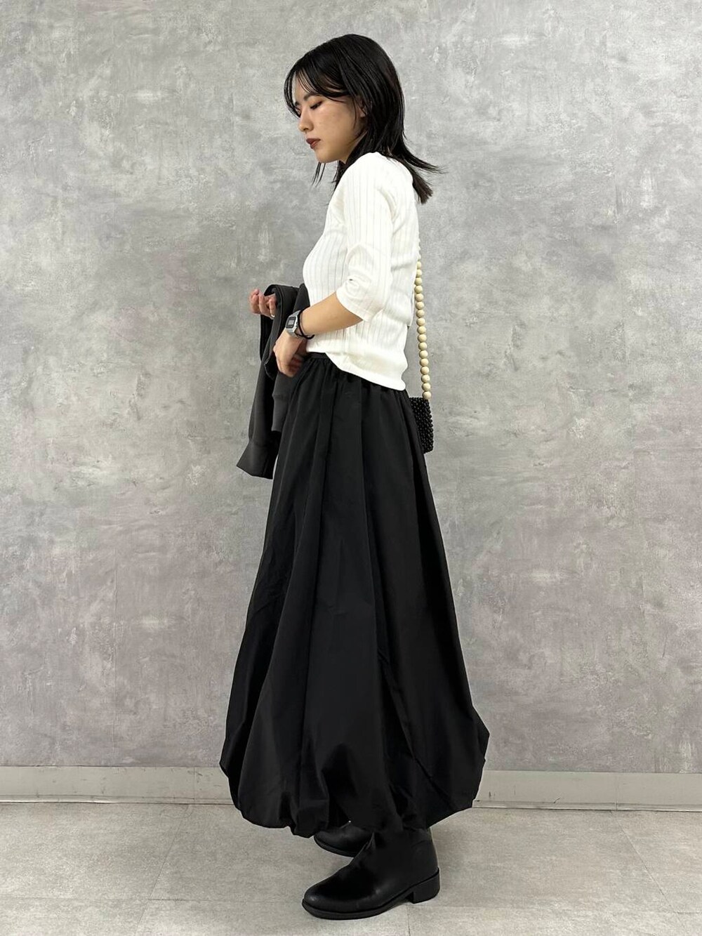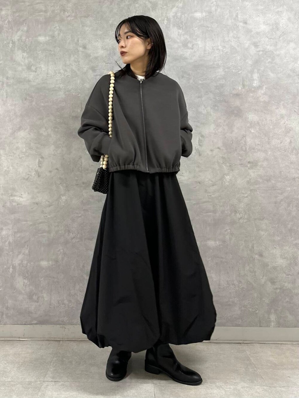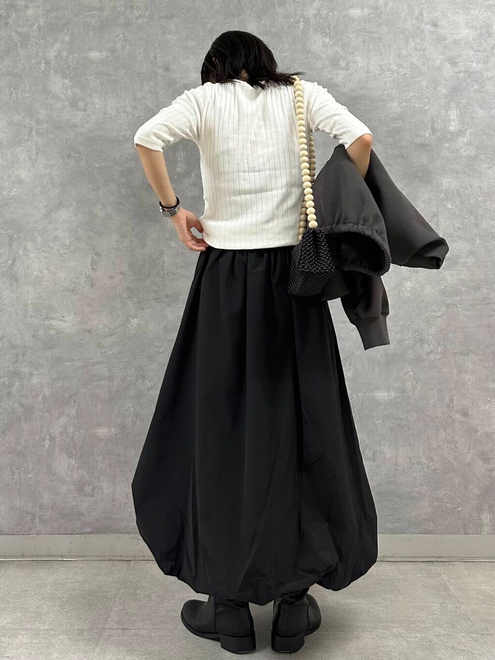 今回はジャケットの短丈を活かしてボトムはバルーンシルエットのスカートでシルエットにメリハリを。