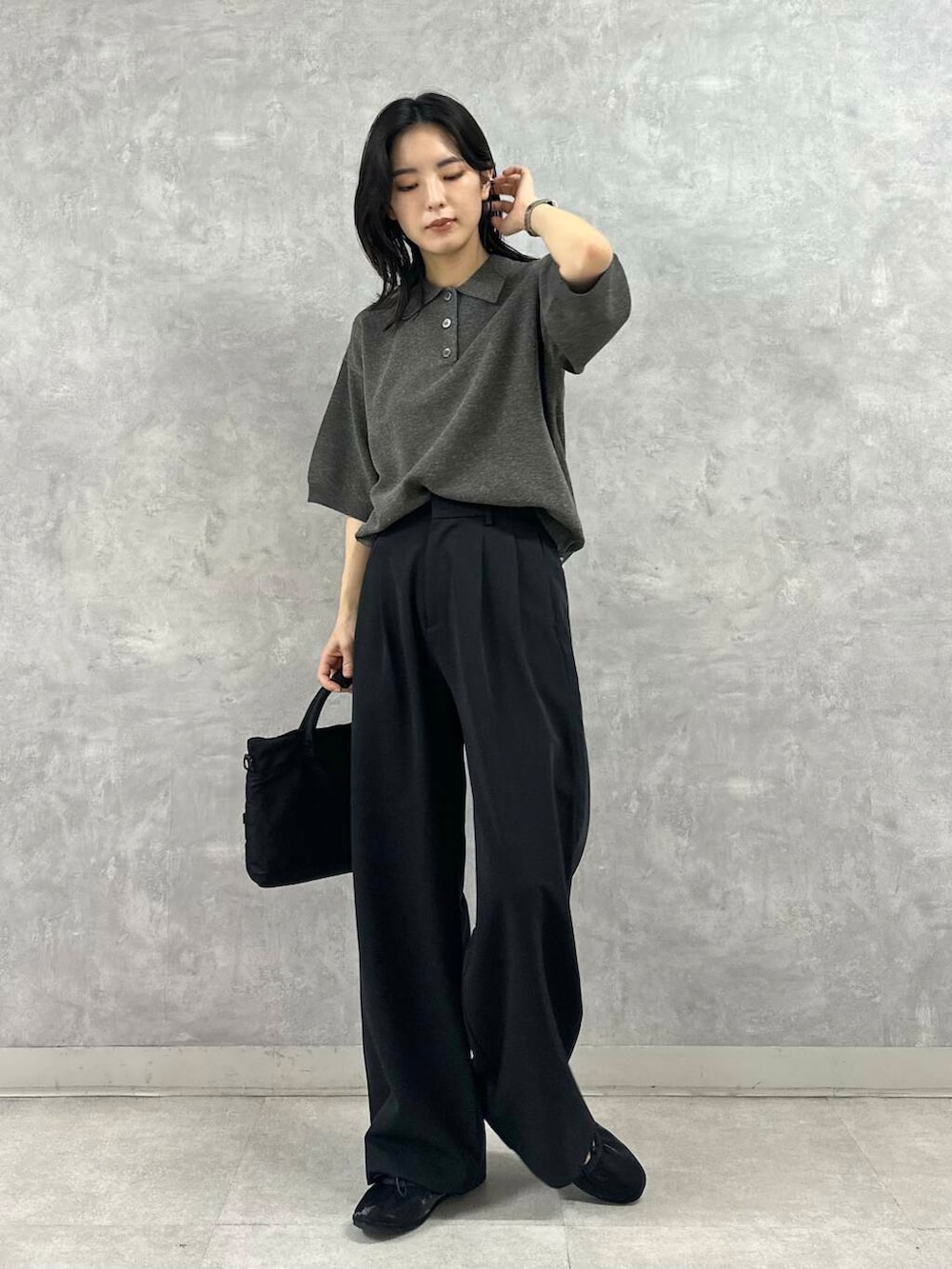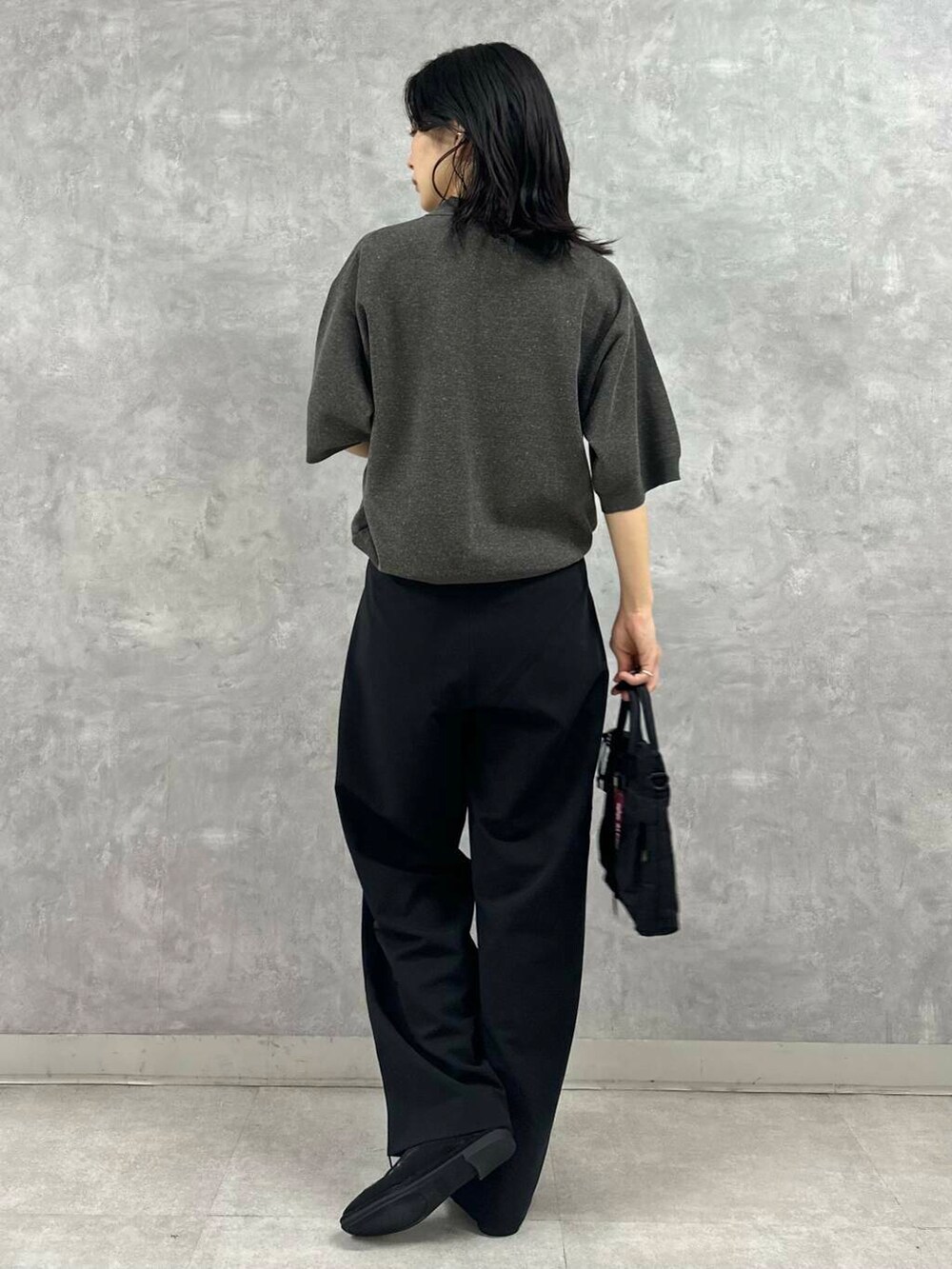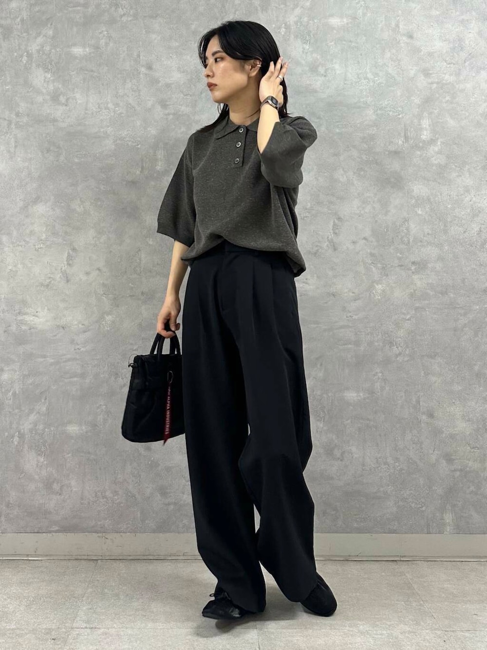 スラックスはハイウエストデザインでゴムの入っていないデザインなので、ウエストがずるずると落ちるあの不快感なく、スタイルアップがかなうシルエットです。