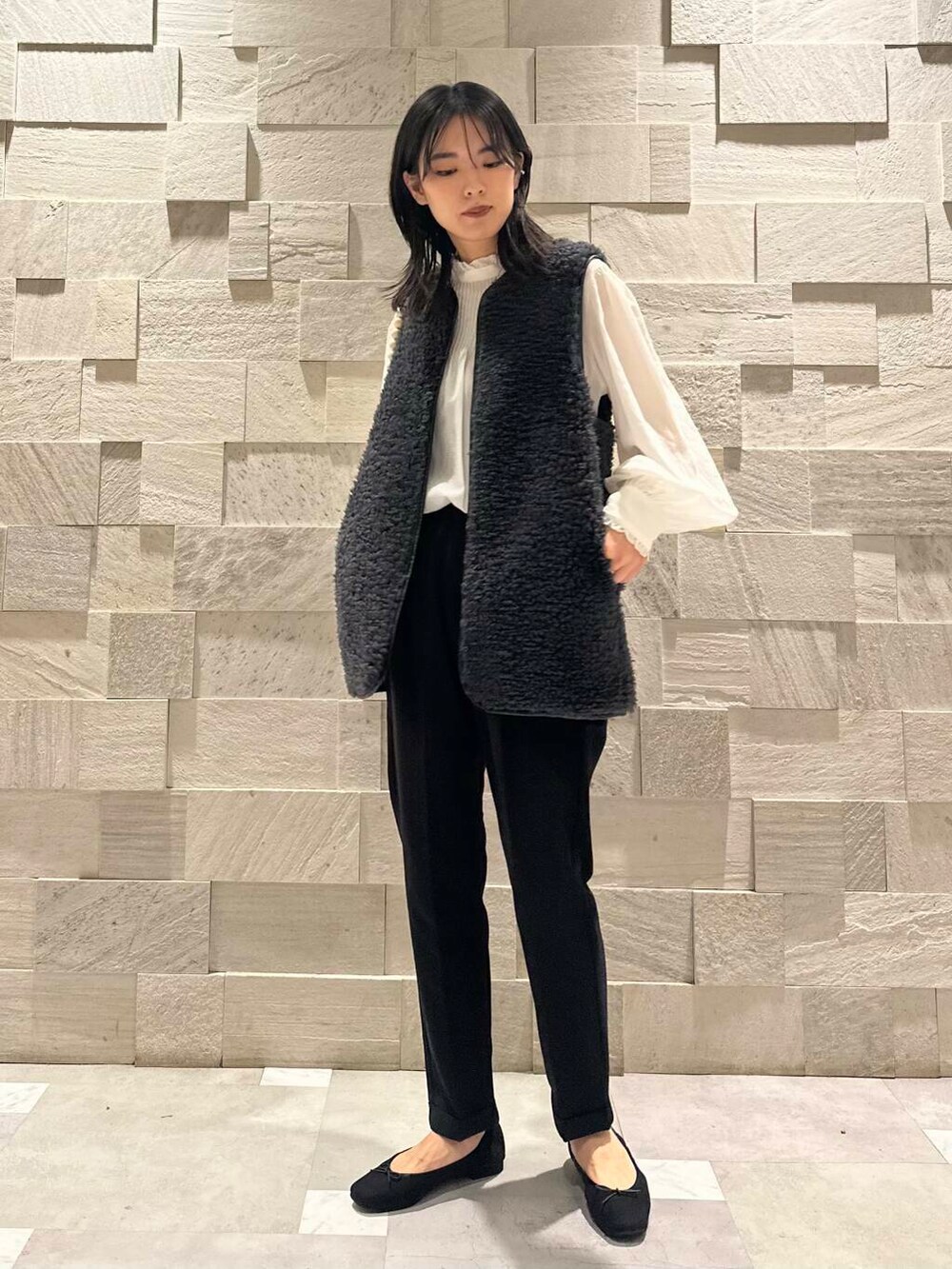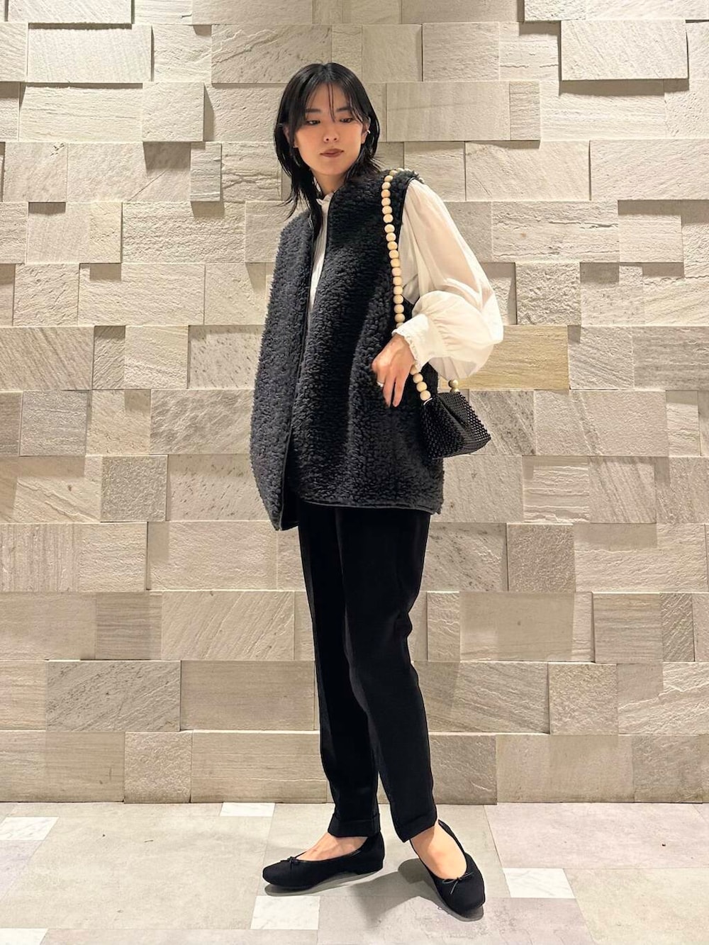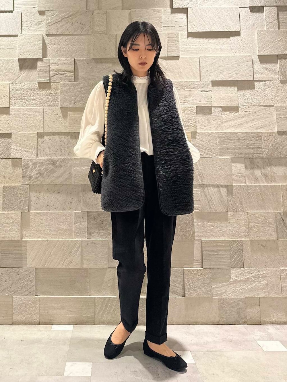 今回はトレンド感をプラスしてボアベストで綺麗目スタイルに。