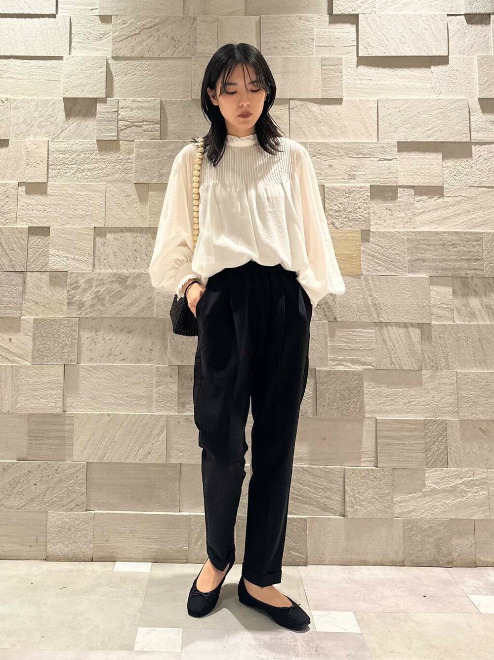小さくギャザーの入った襟にふんわりラインの袖。インナーに重ねることで華やかさもプラスできるブラウスです。
