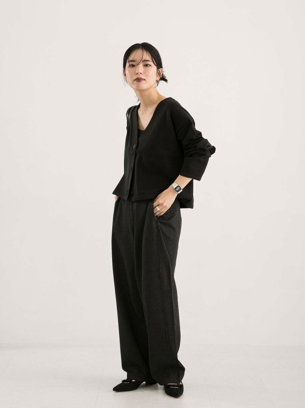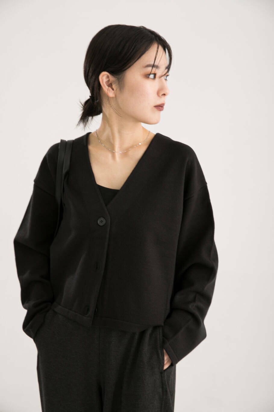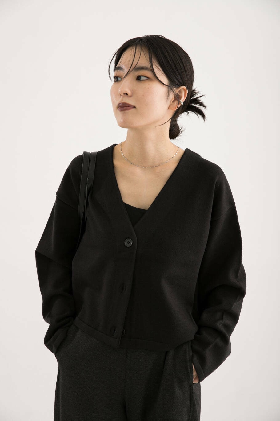 組み合わせに悩むショート丈カーデも裾のリブ無しデザインのおかげで、ワイドシルエットのボトムにも合わせやすく、自然とスタイルアップの叶うバランスに。
