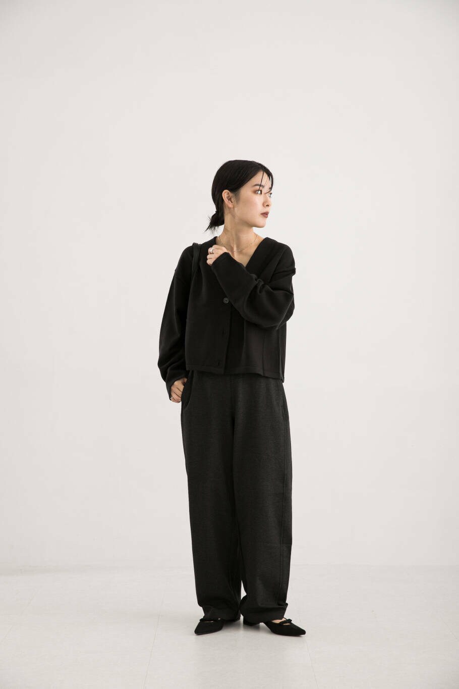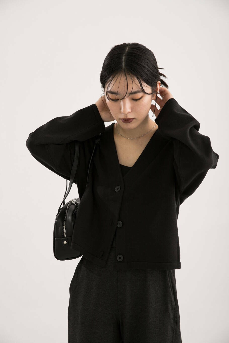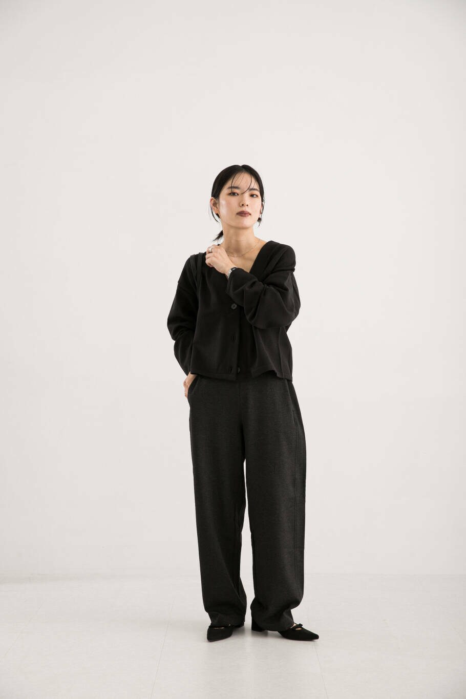組み合わせに悩むショート丈カーデも裾のリブ無しデザインのおかげで、ワイドシルエットのボトムにも合わせやすく、自然とスタイルアップの叶うバランスに。