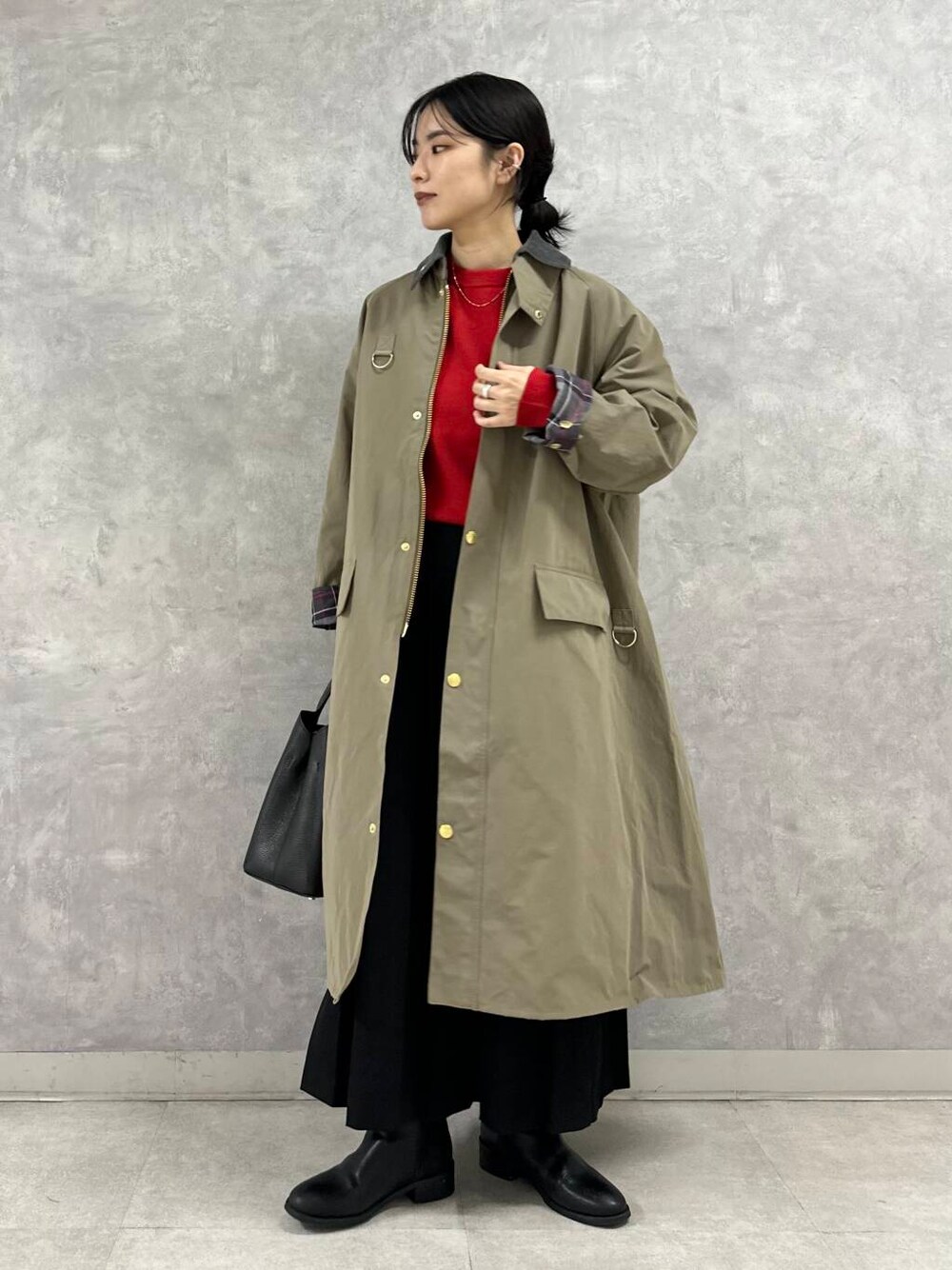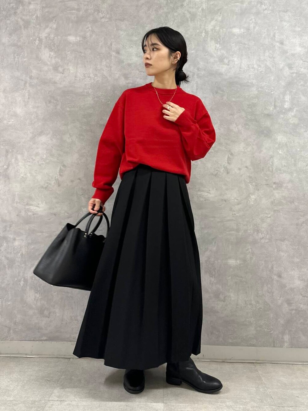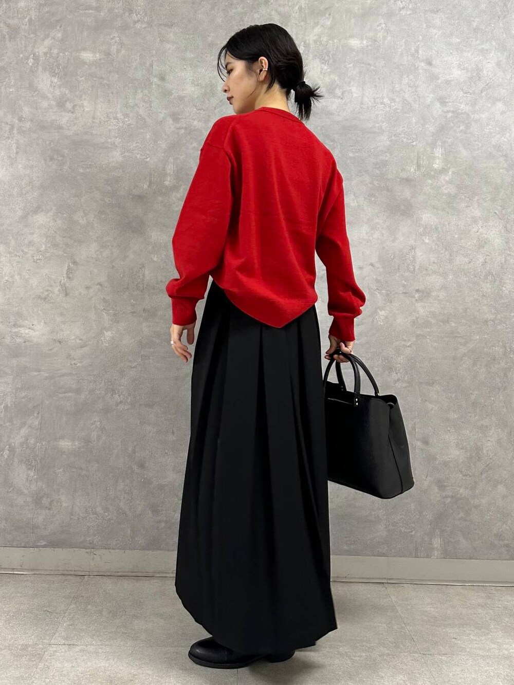 グレーカラーはインナーのチェックラインが赤なので、今回は赤ニット合わせてクラシカルスタイルに。
