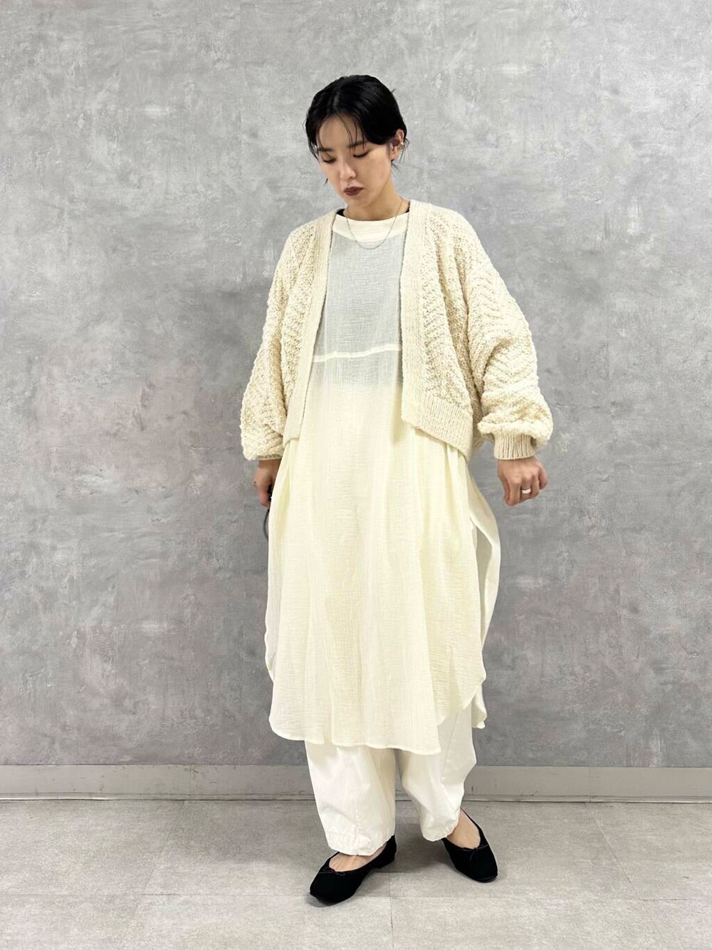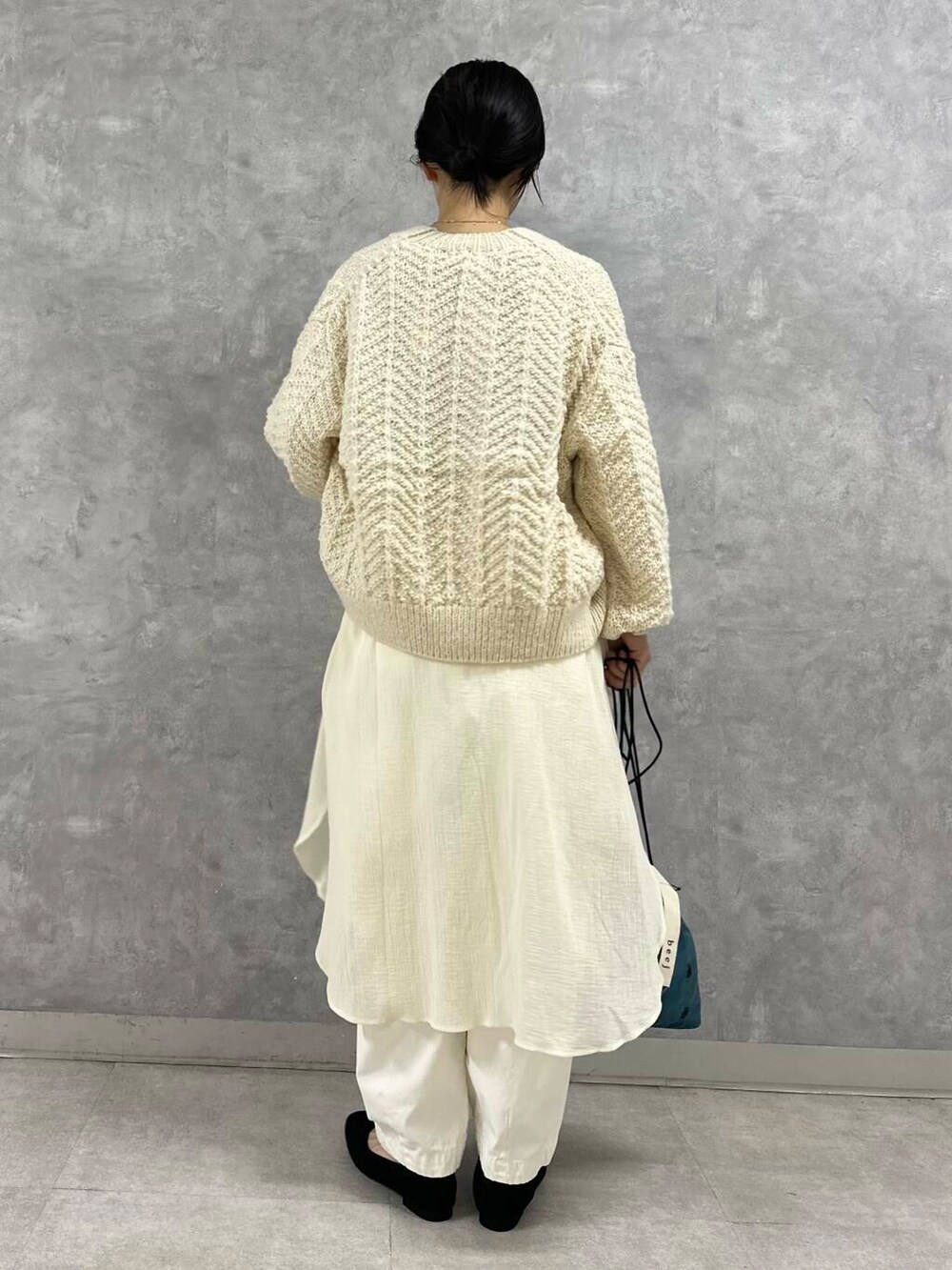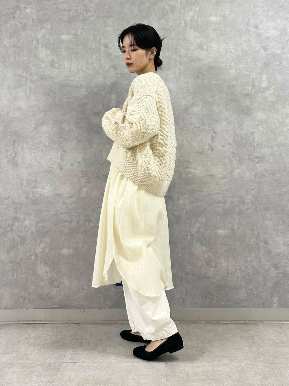 身幅もゆったりとしたデザインですが、裾のリブのおかげでコクーンのような少し丸みのあるシルエットになり、着膨れせずに合わせていただけます。