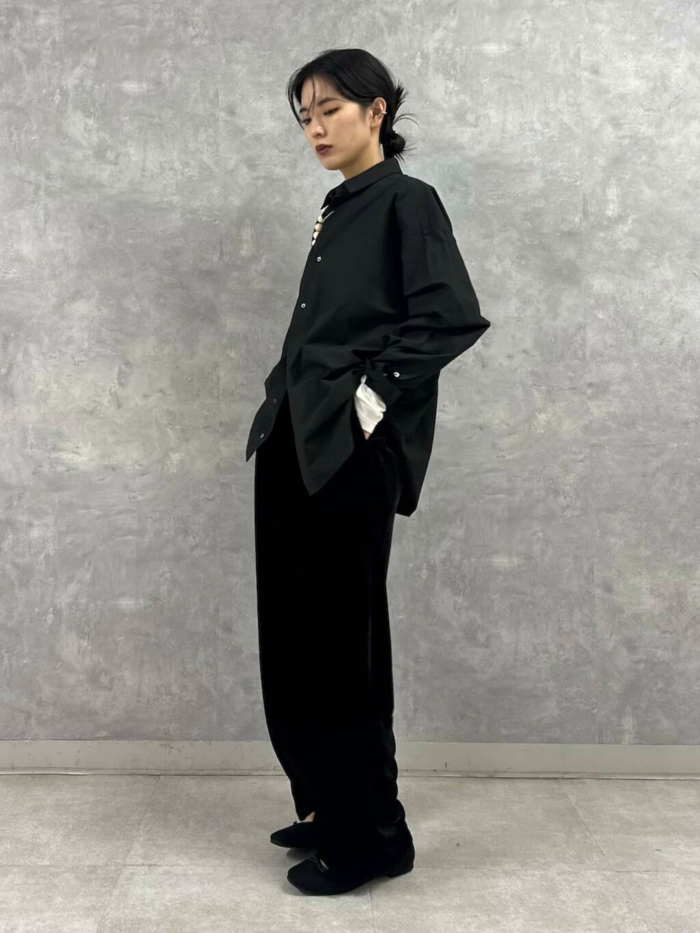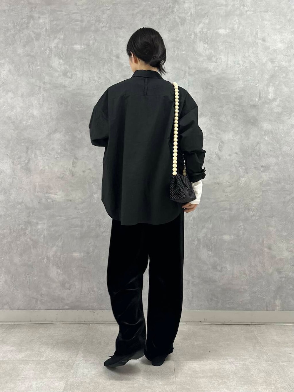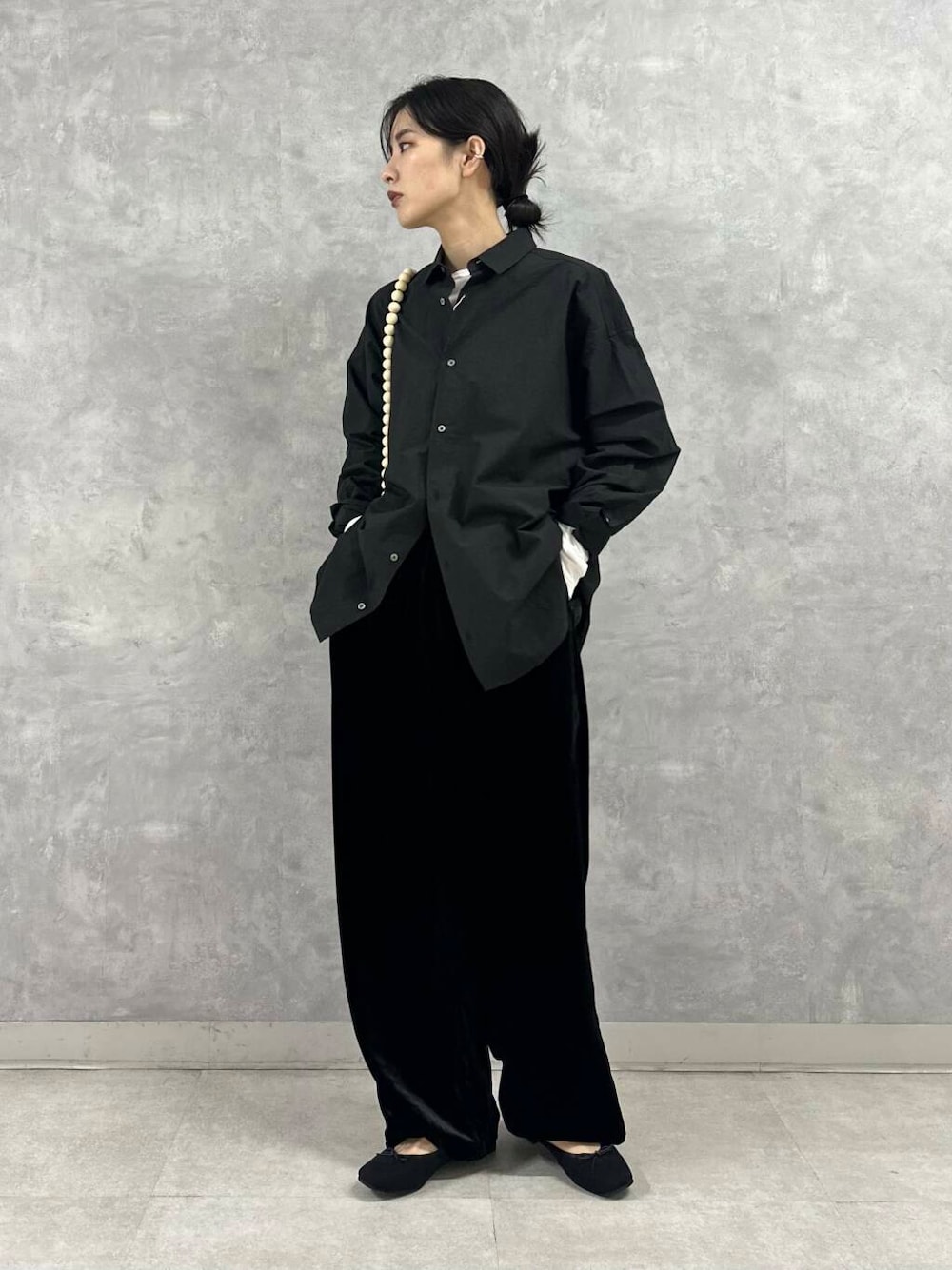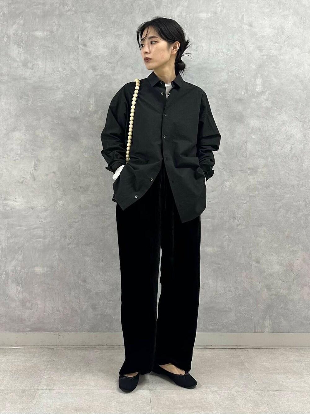 コットンシャツもハリのある素材なので、着膨れが気になる方はくたっとした素材感のボトムで合わせるとおすすめです。